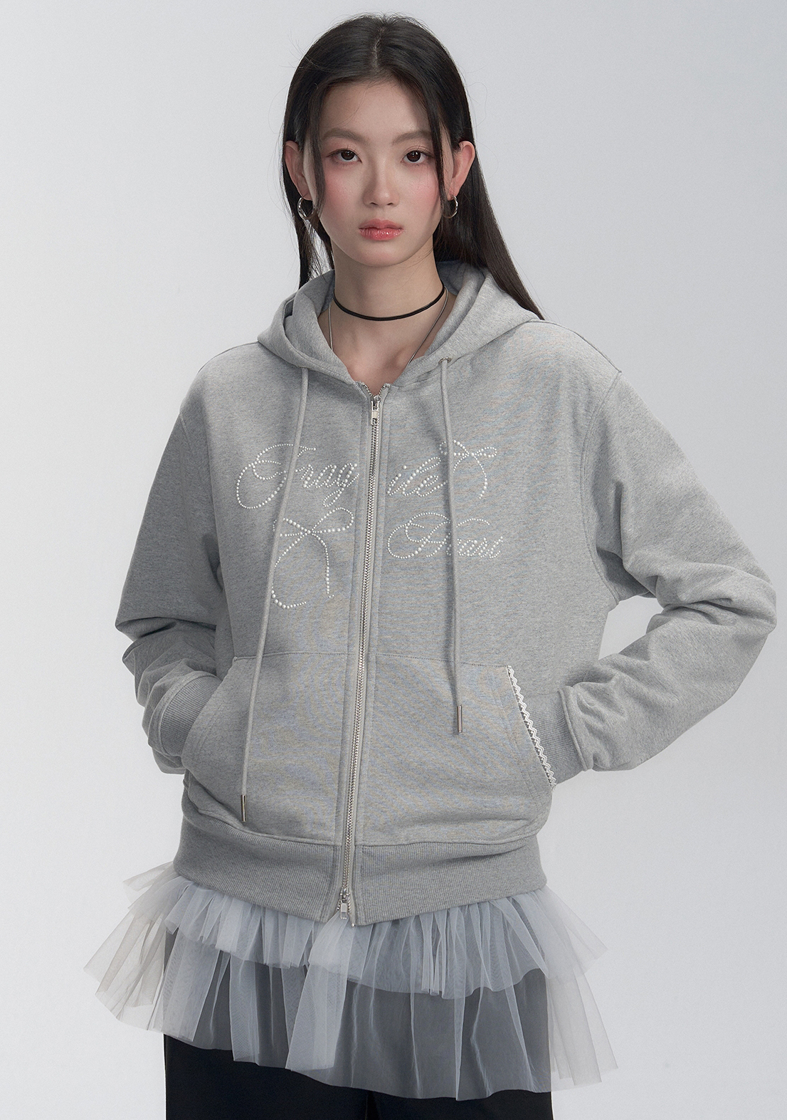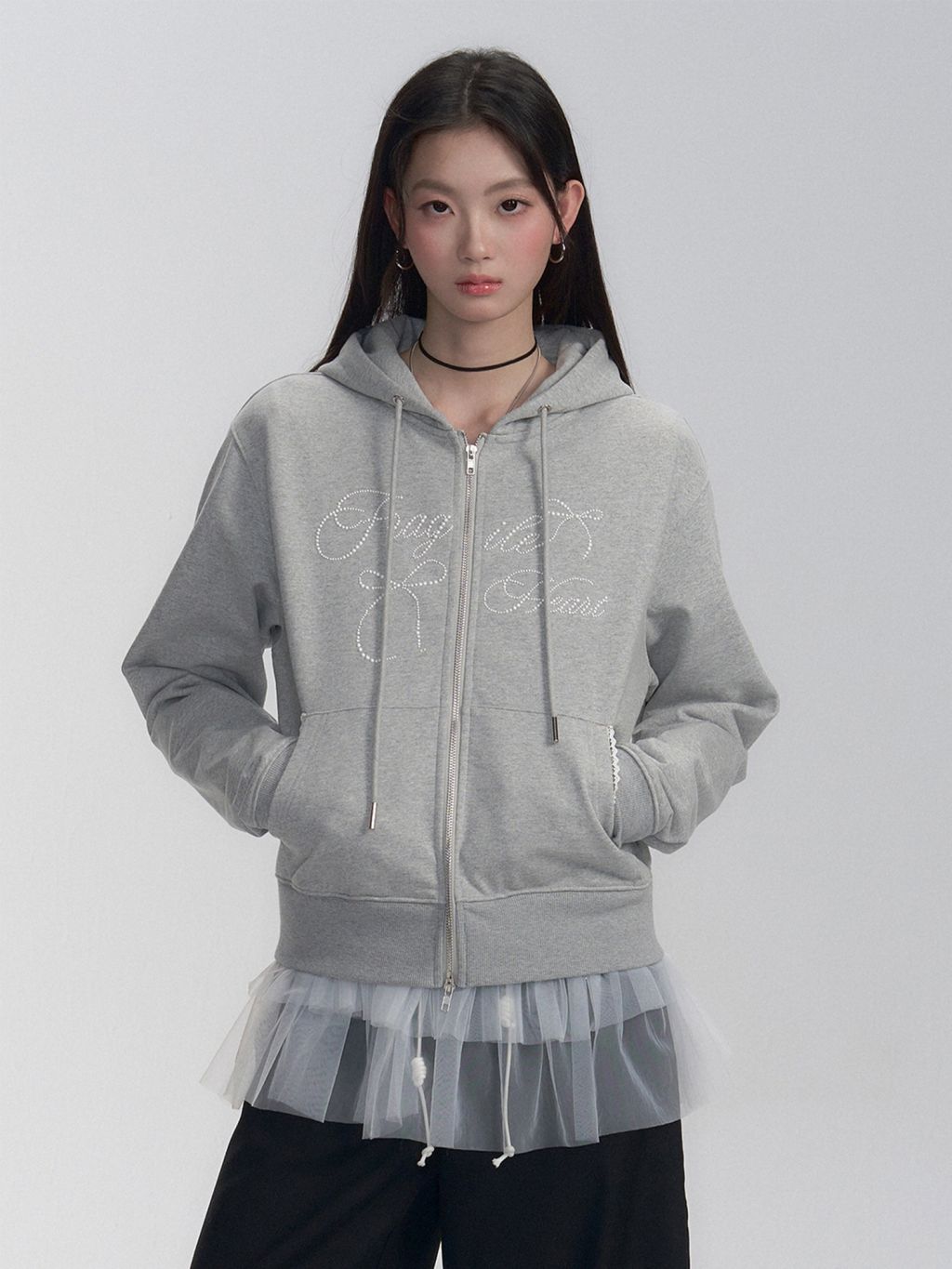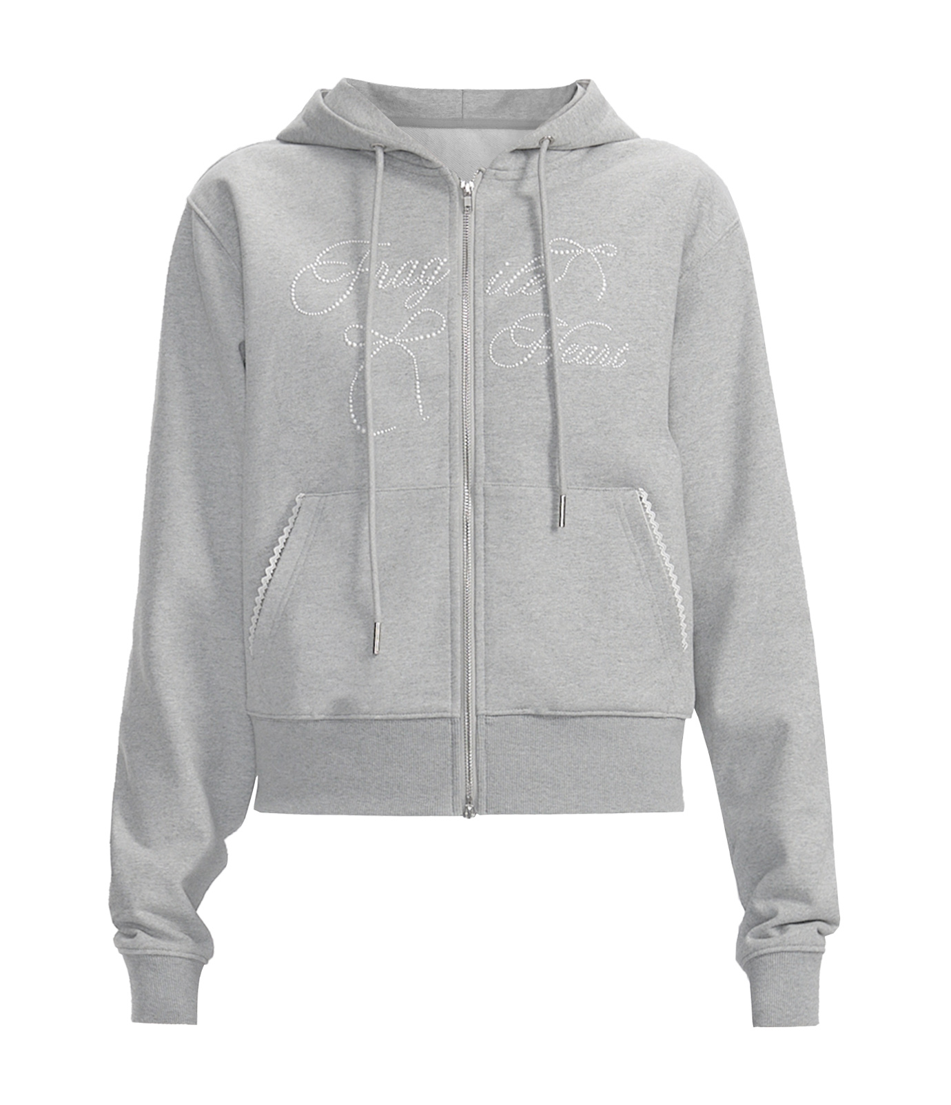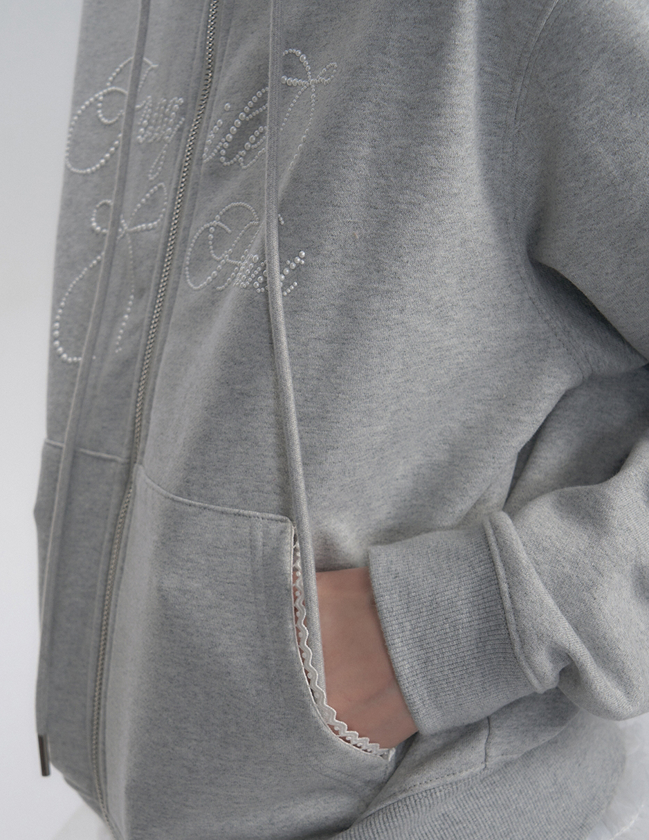 프론트 레터링이 포인트되는 그레이 후드집업입니다.