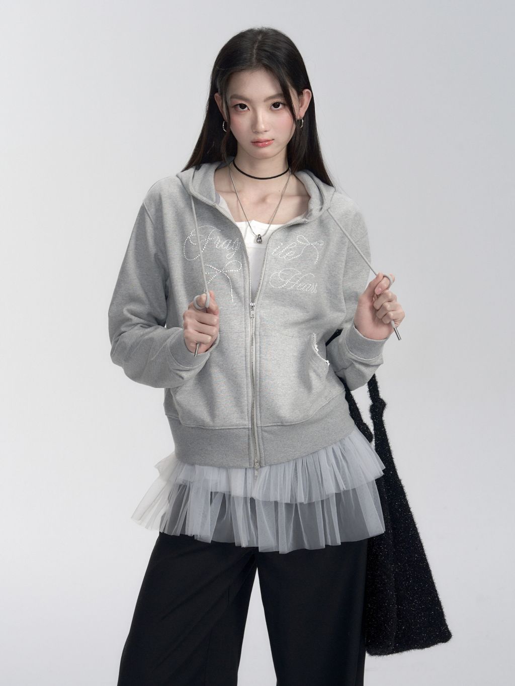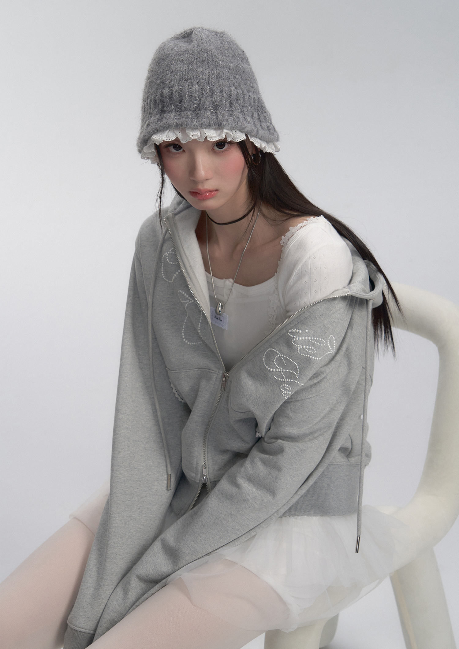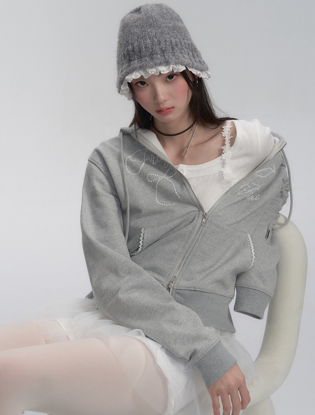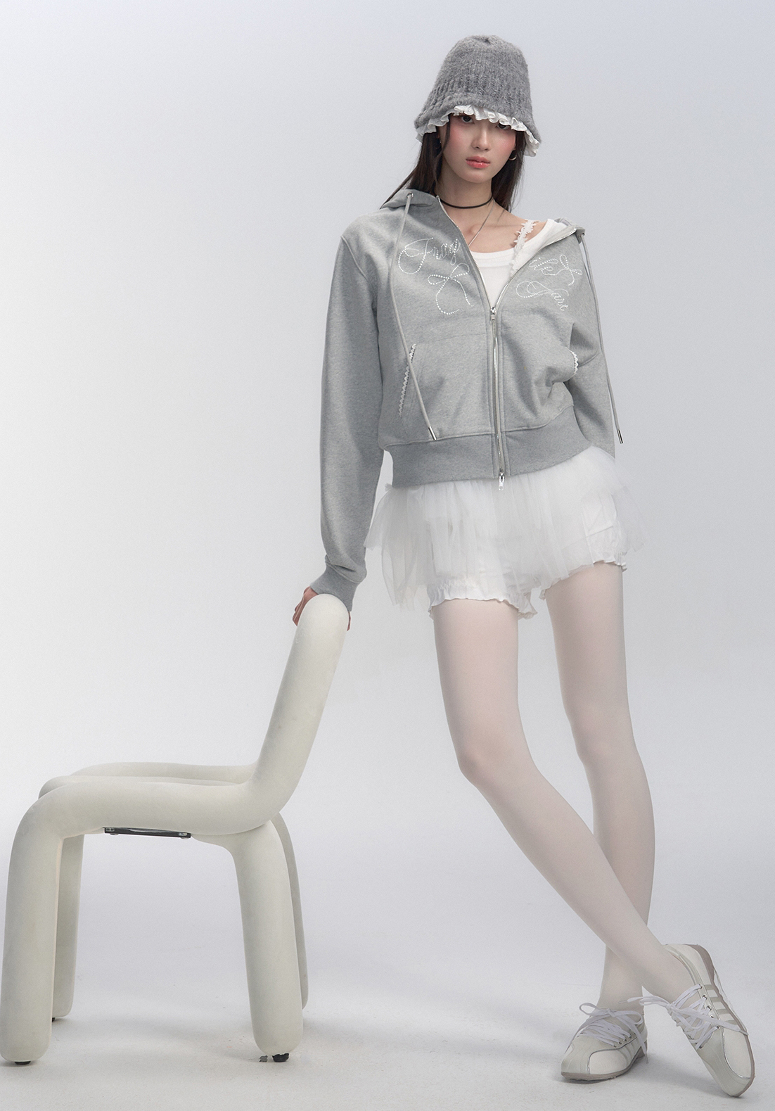 프론트 레터링이 포인트되는 그레이 후드집업입니다.