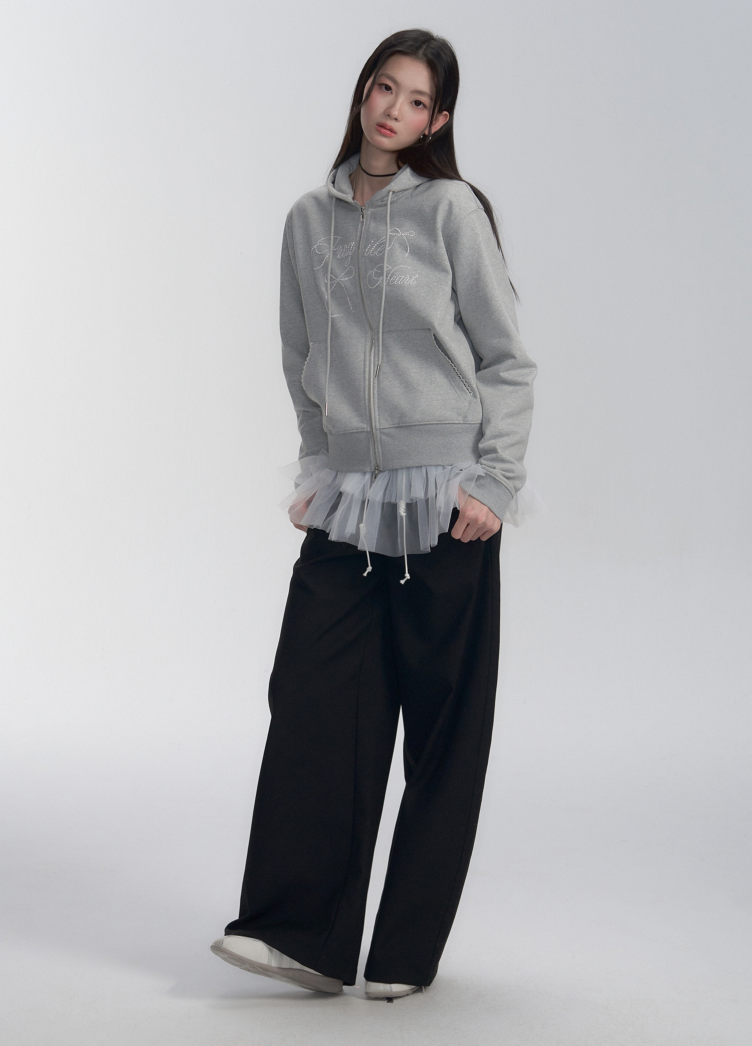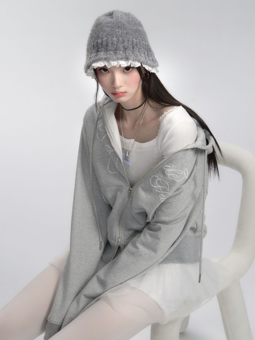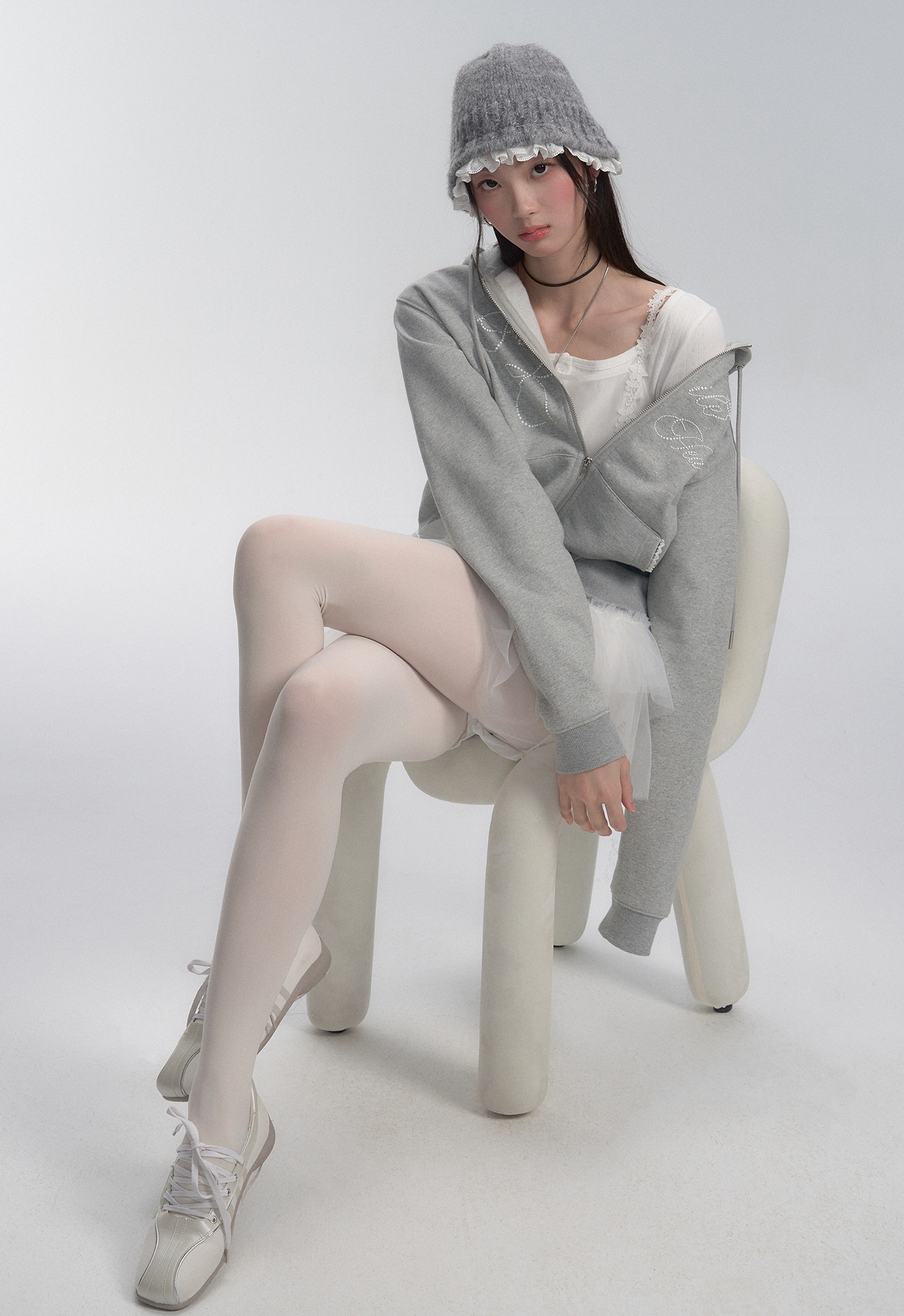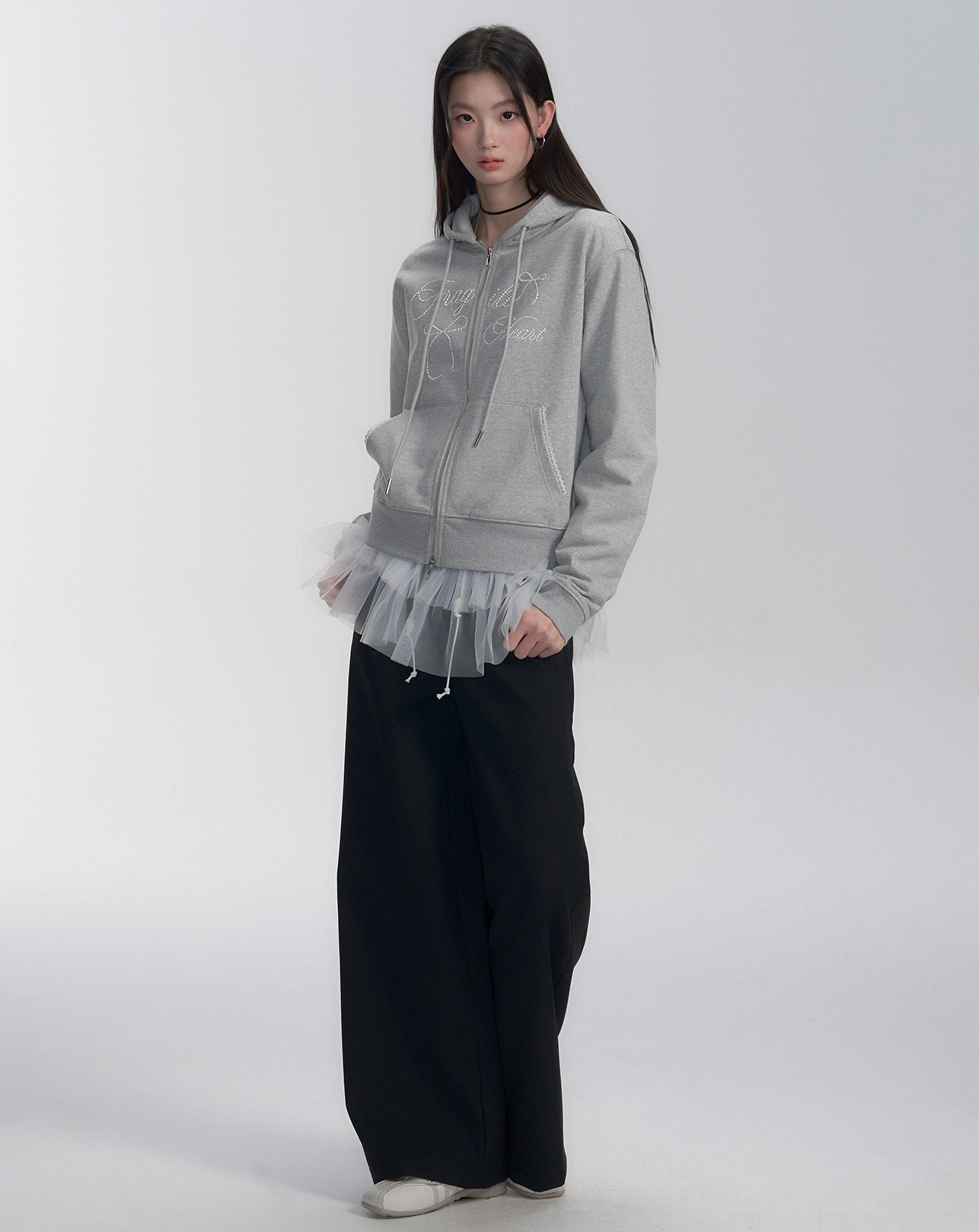 프론트 레터링이 포인트되는 그레이 후드집업입니다.