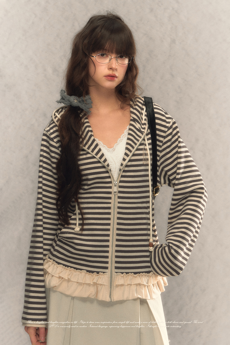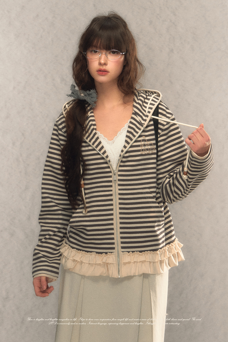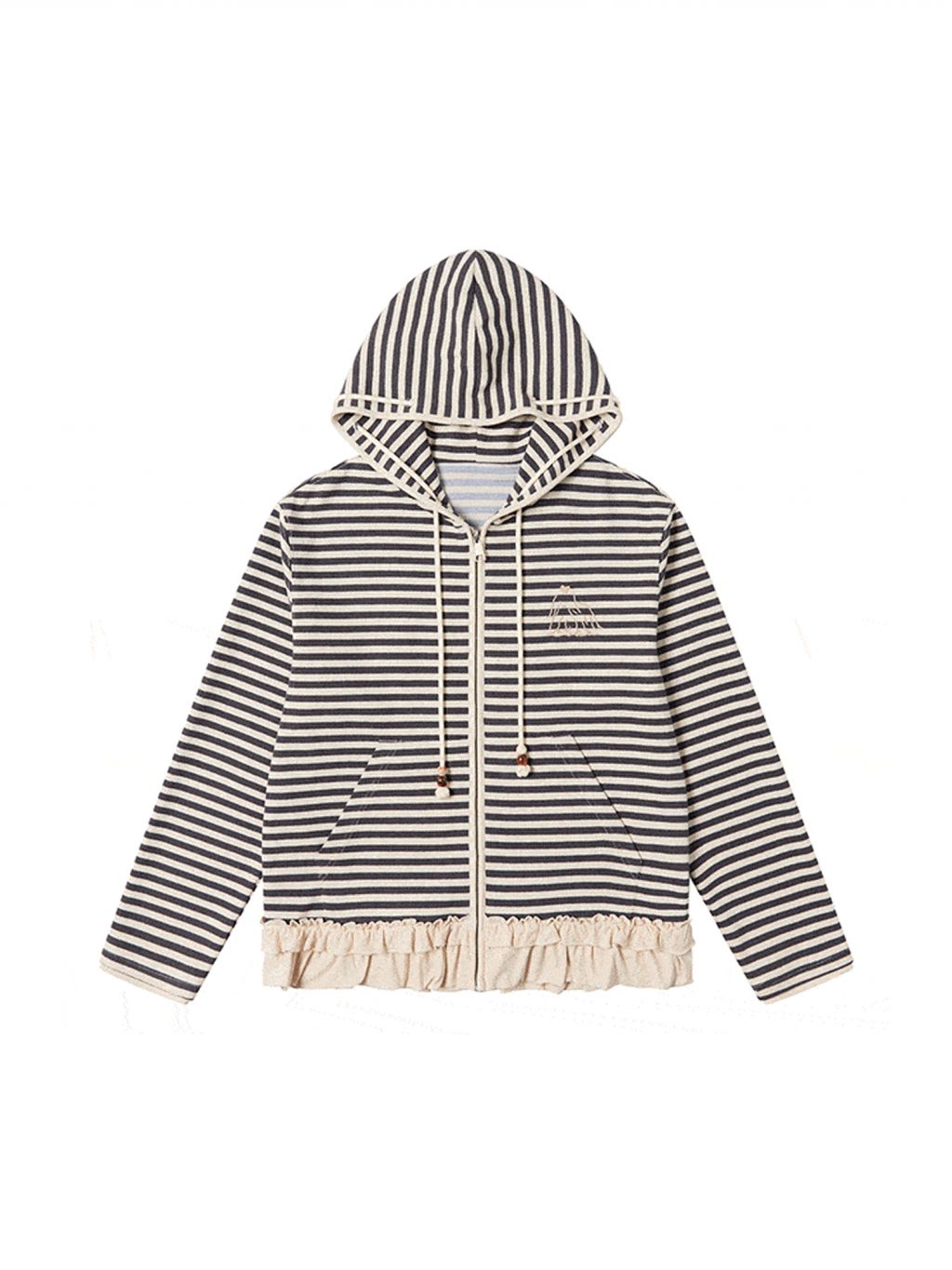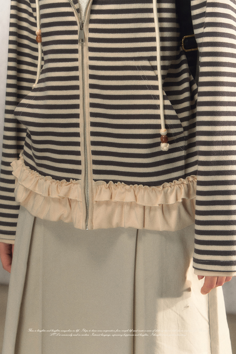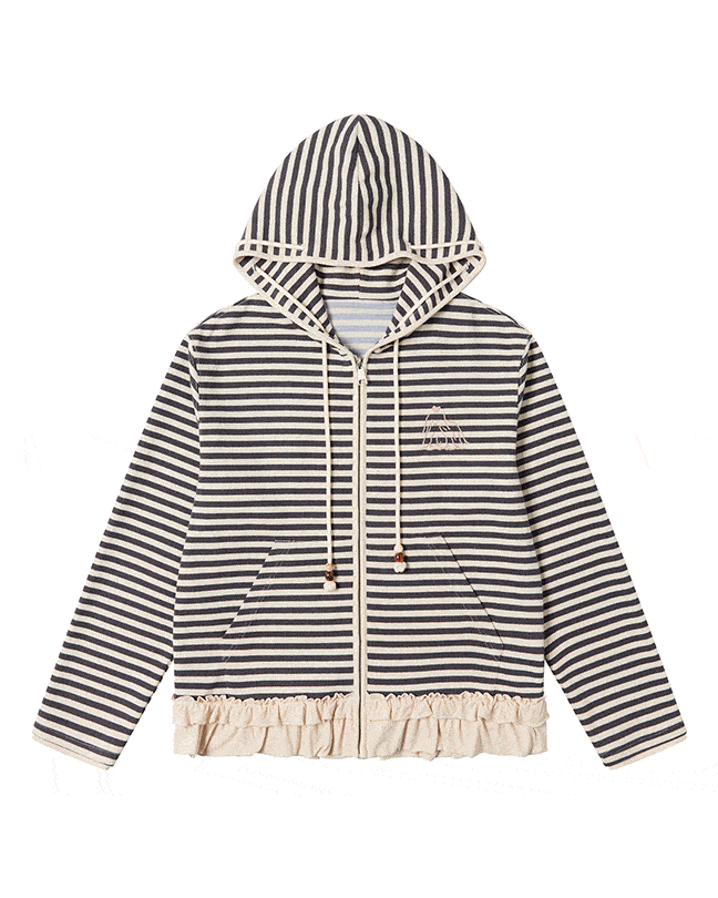 스트라이프 패턴의과 밑단 프릴 디테일로 단품 또는 아웃터에 레이어드 하기 좋은 후드 집업입니다.