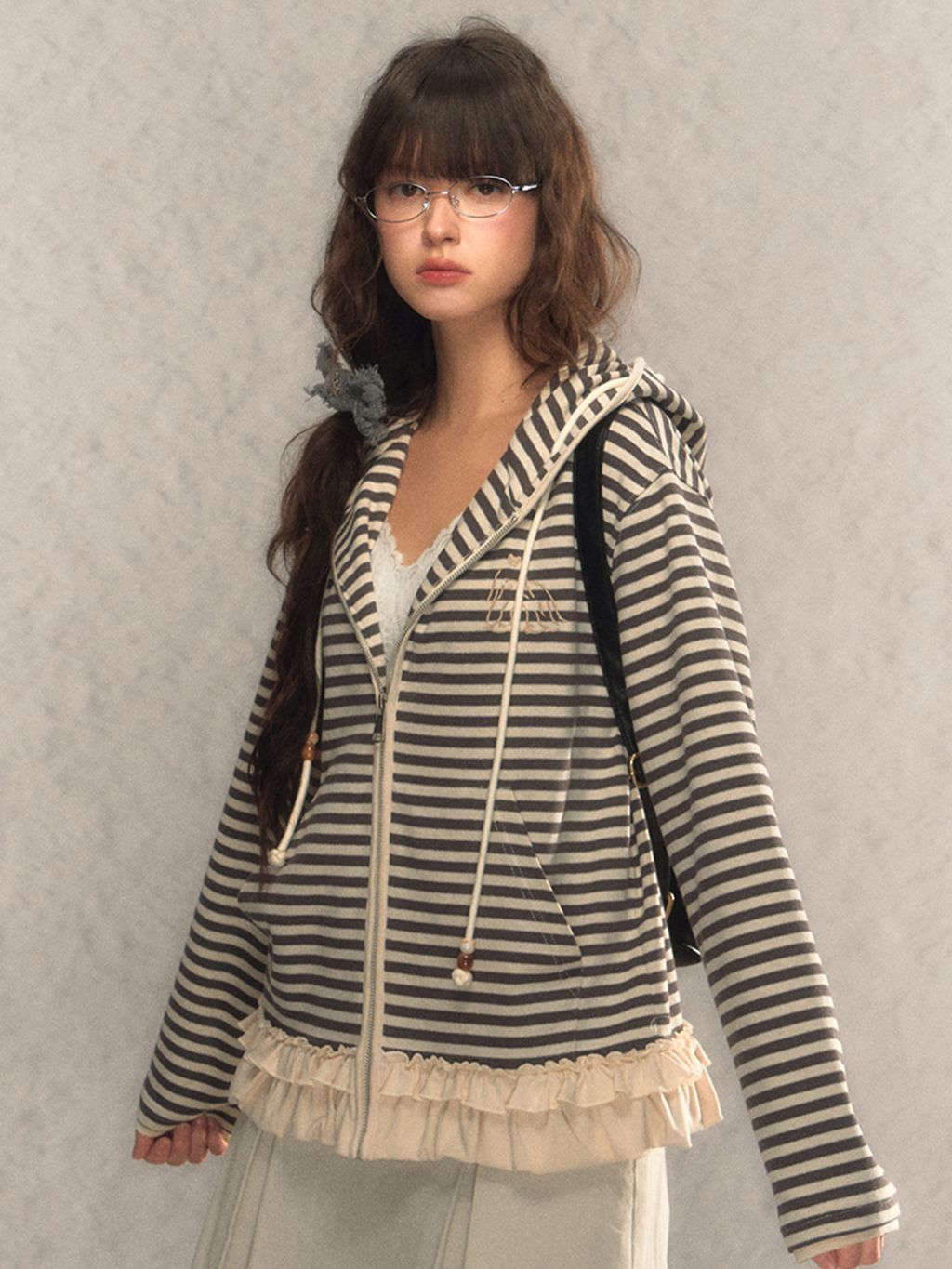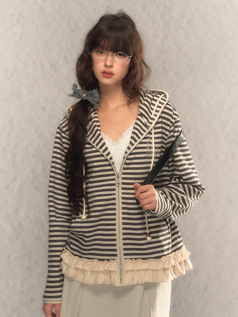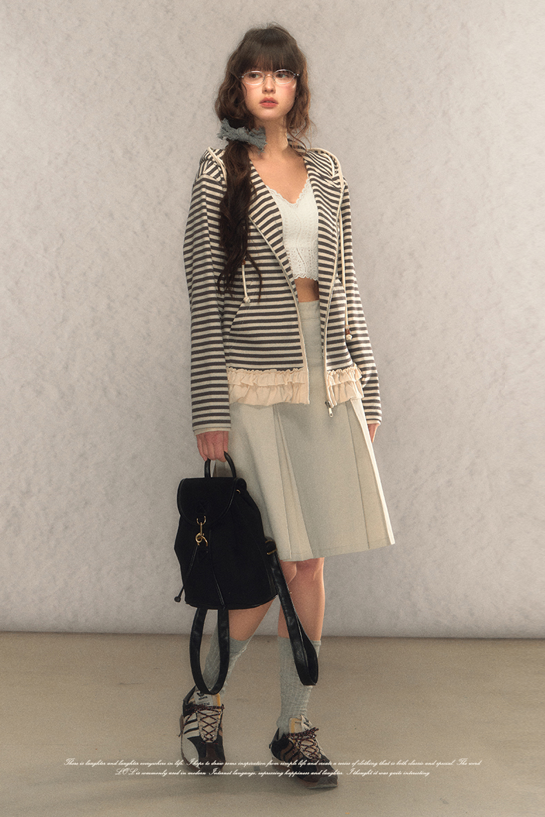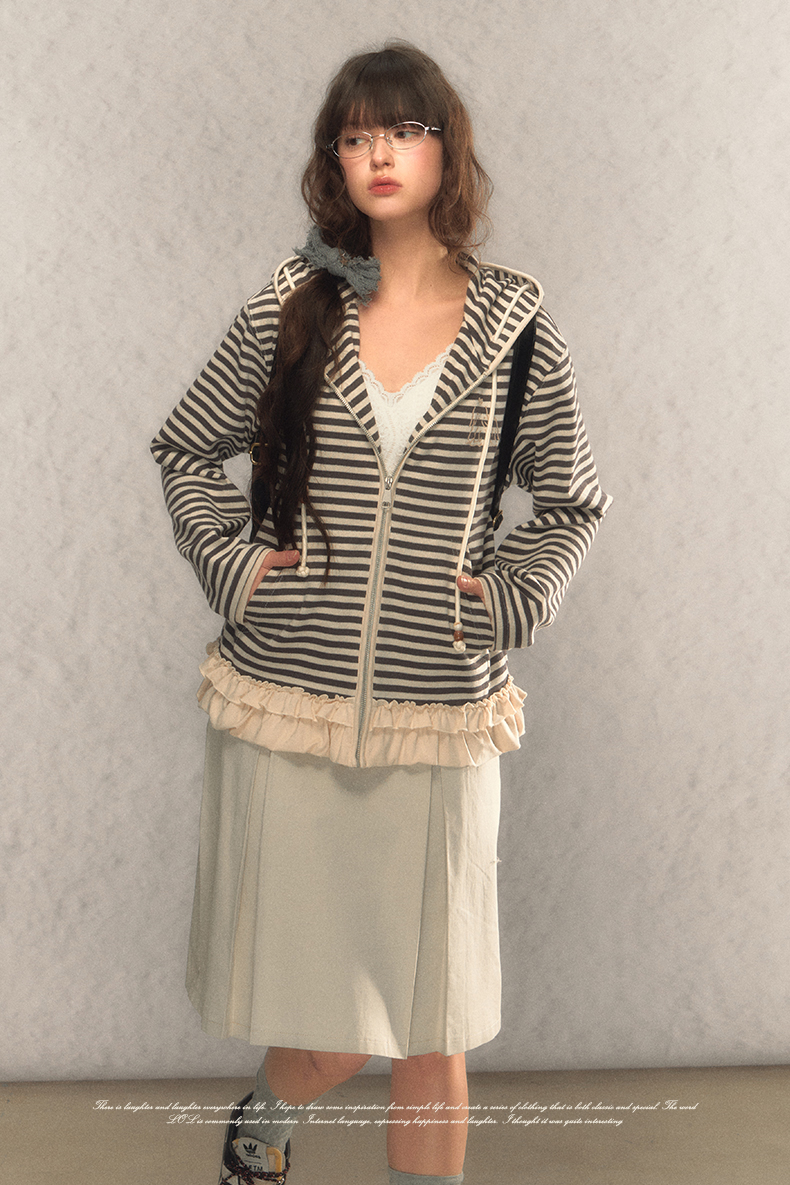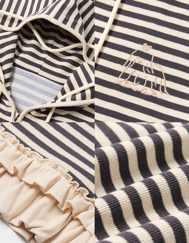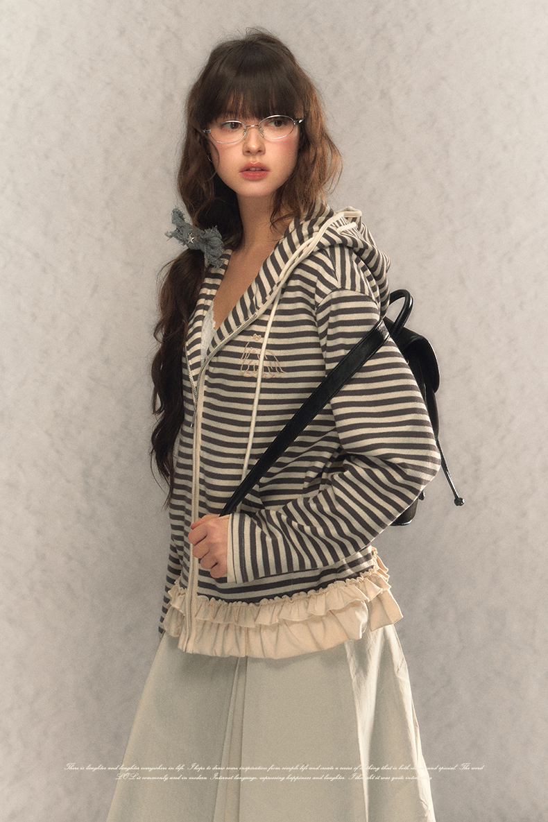 스트라이프 패턴의과 밑단 프릴 디테일로 단품 또는 아웃터에 레이어드 하기 좋은 후드 집업입니다.