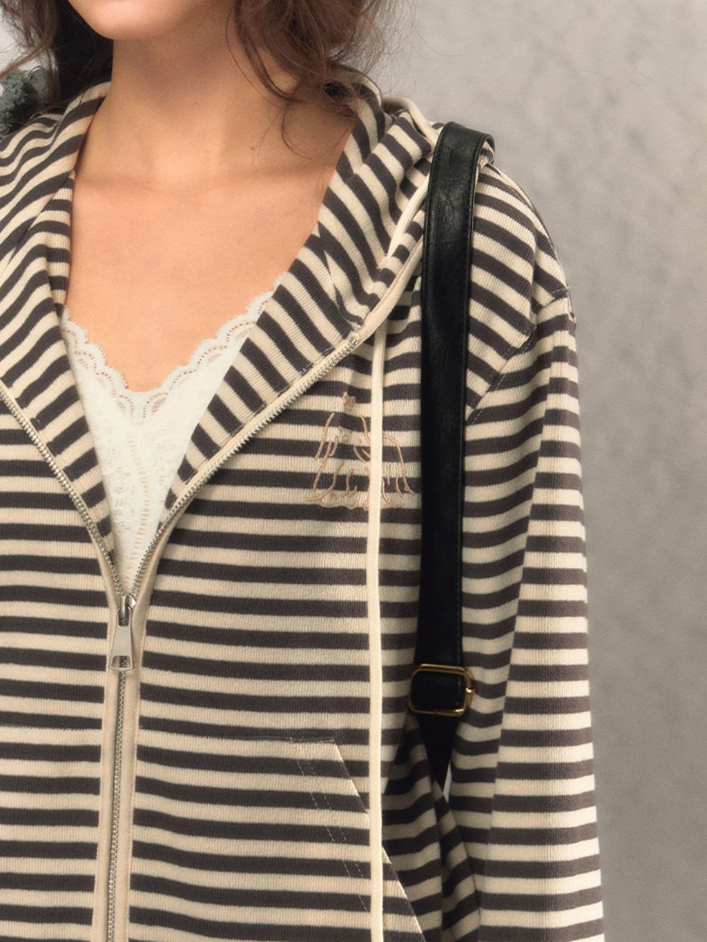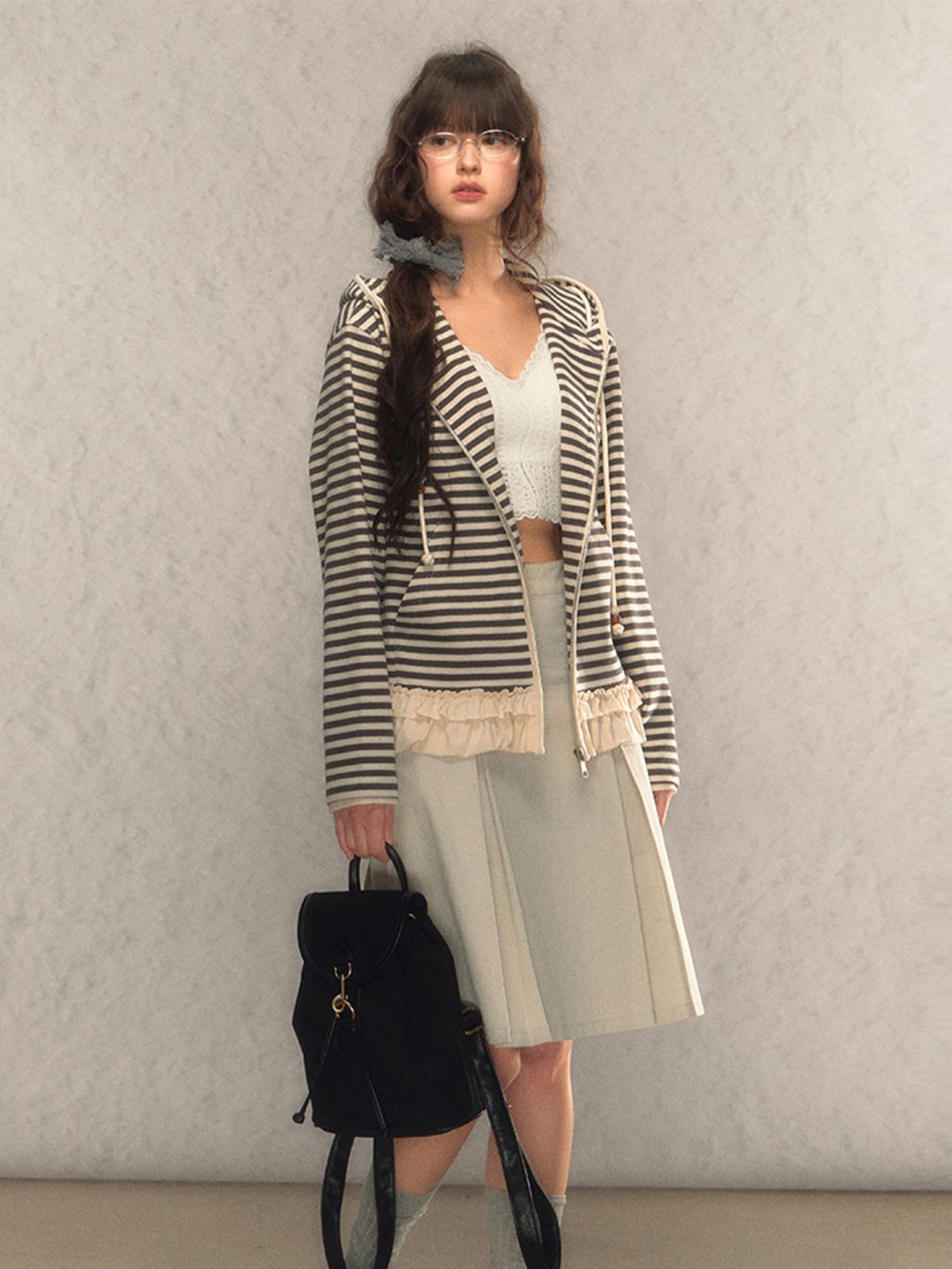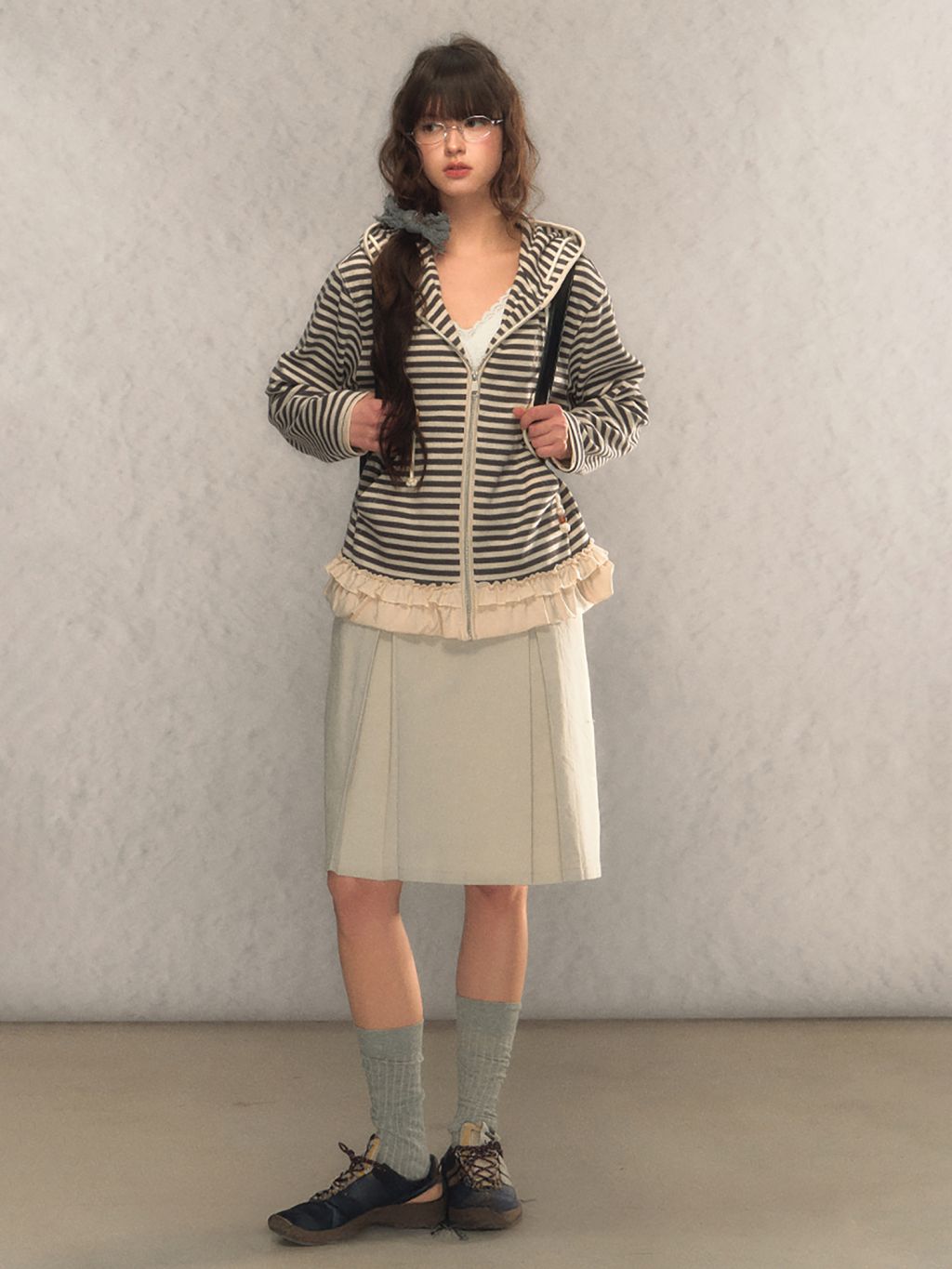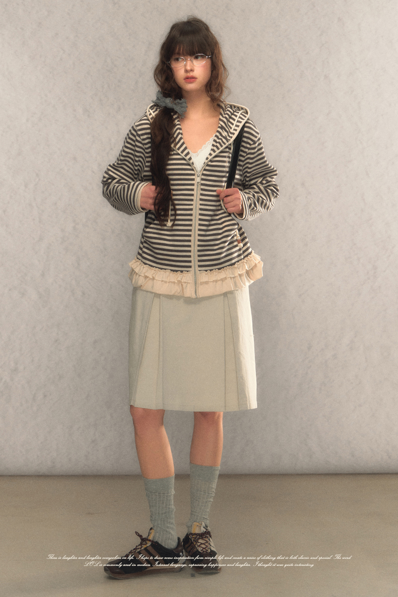 스트라이프 패턴의과 밑단 프릴 디테일로 단품 또는 아웃터에 레이어드 하기 좋은 후드 집업입니다.