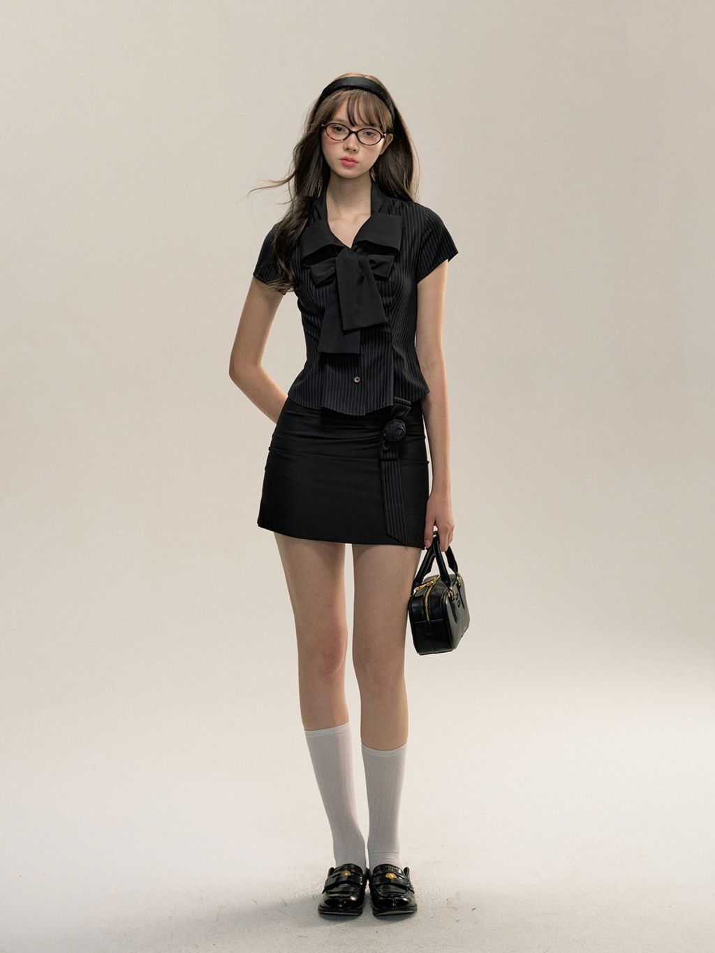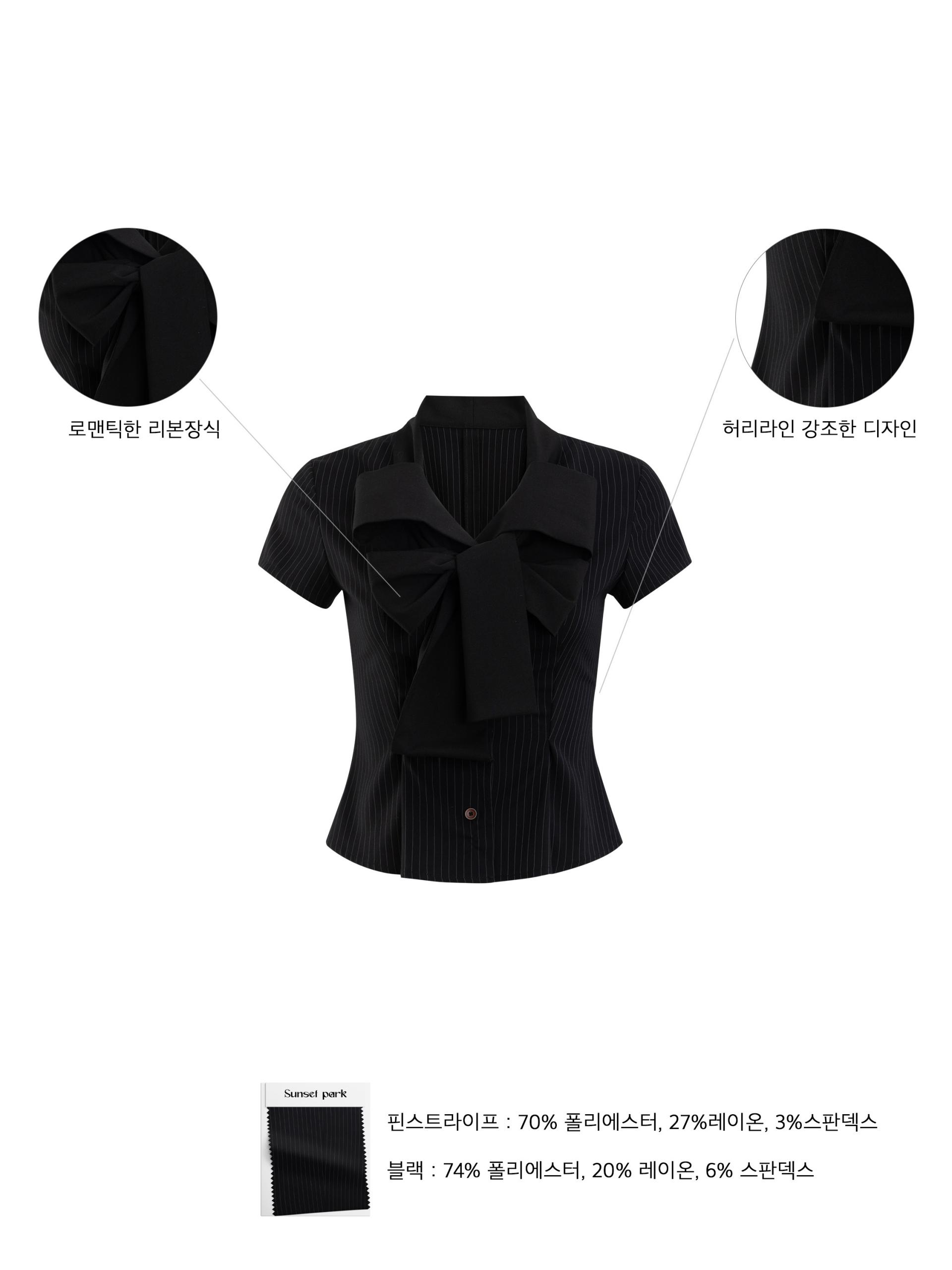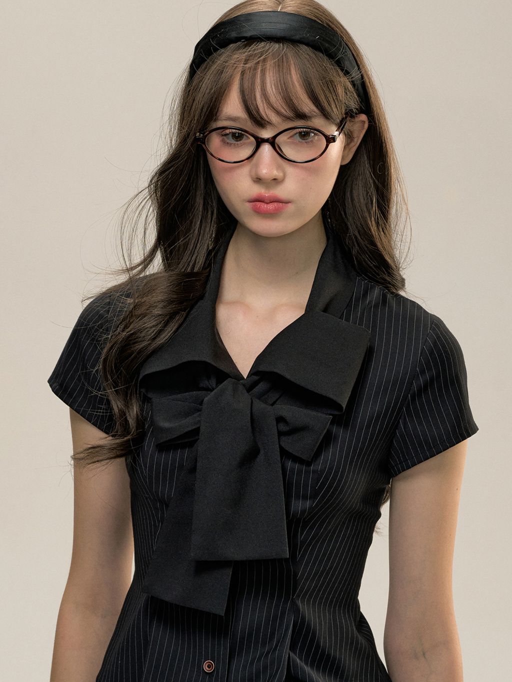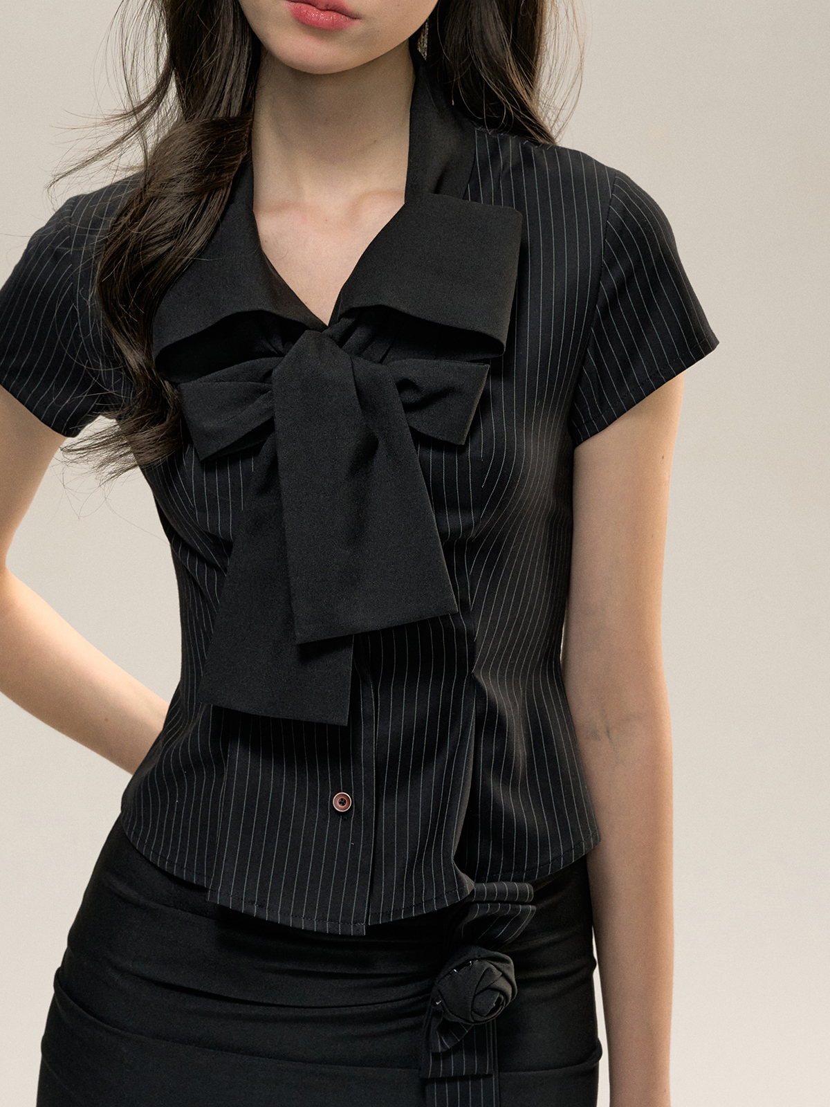Pin Stripe Bow Tie S-sleeve Black Shirt