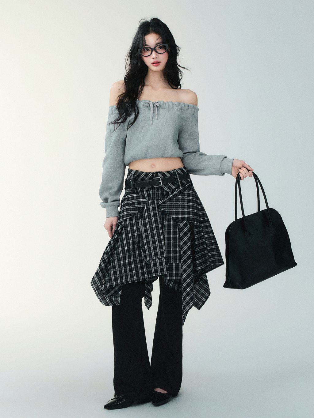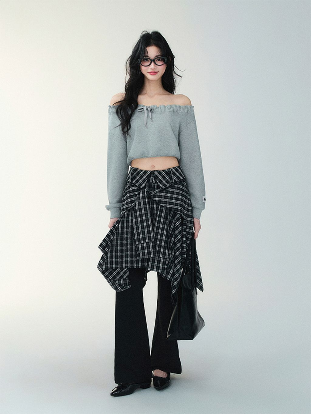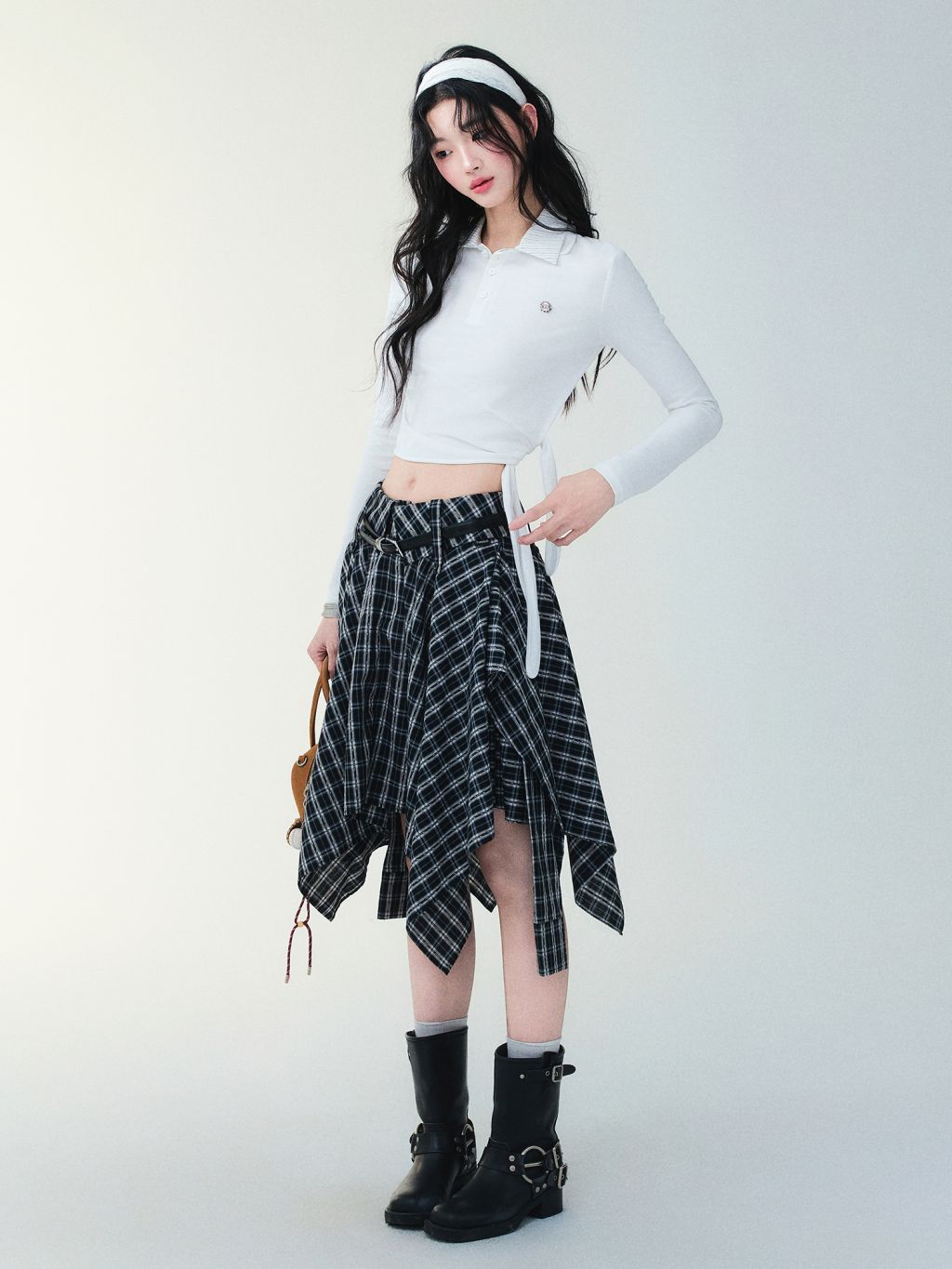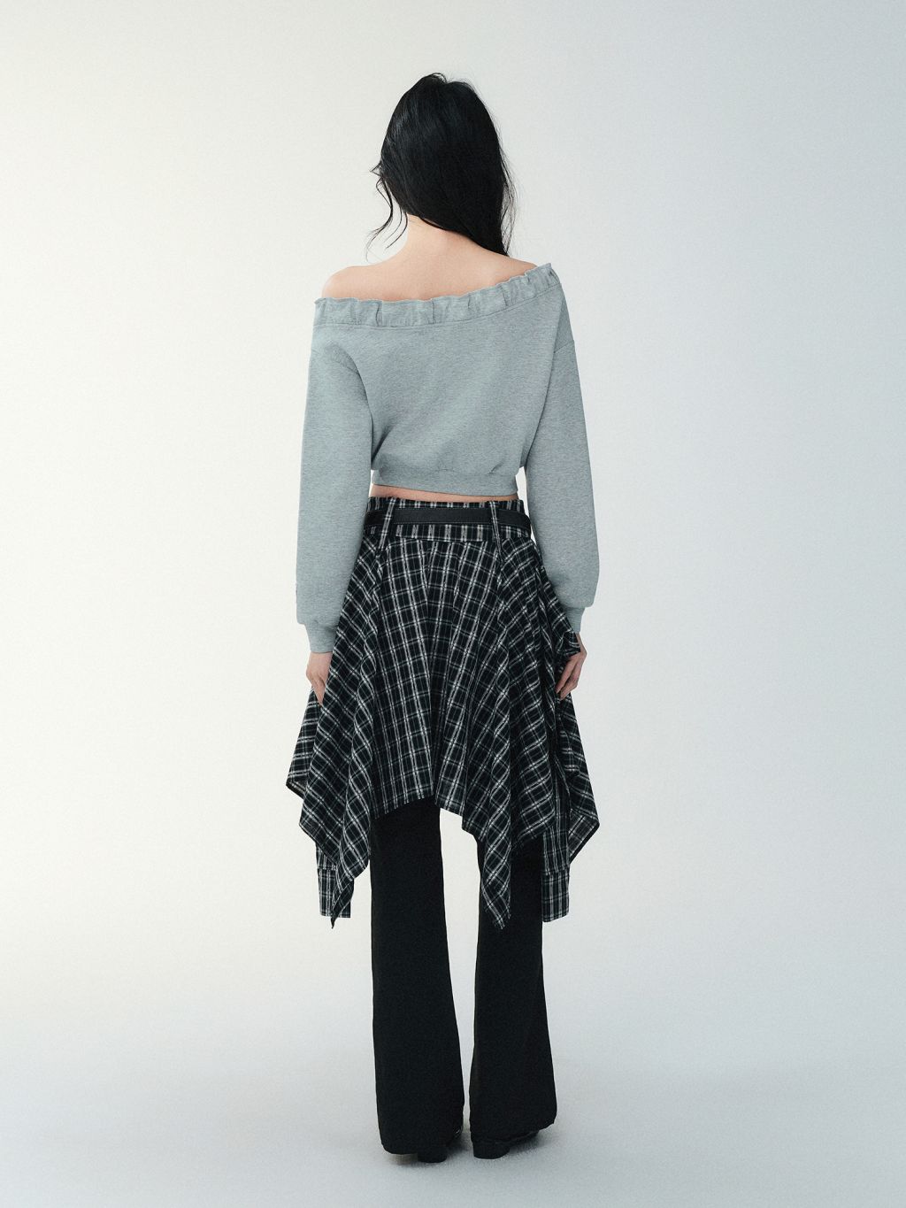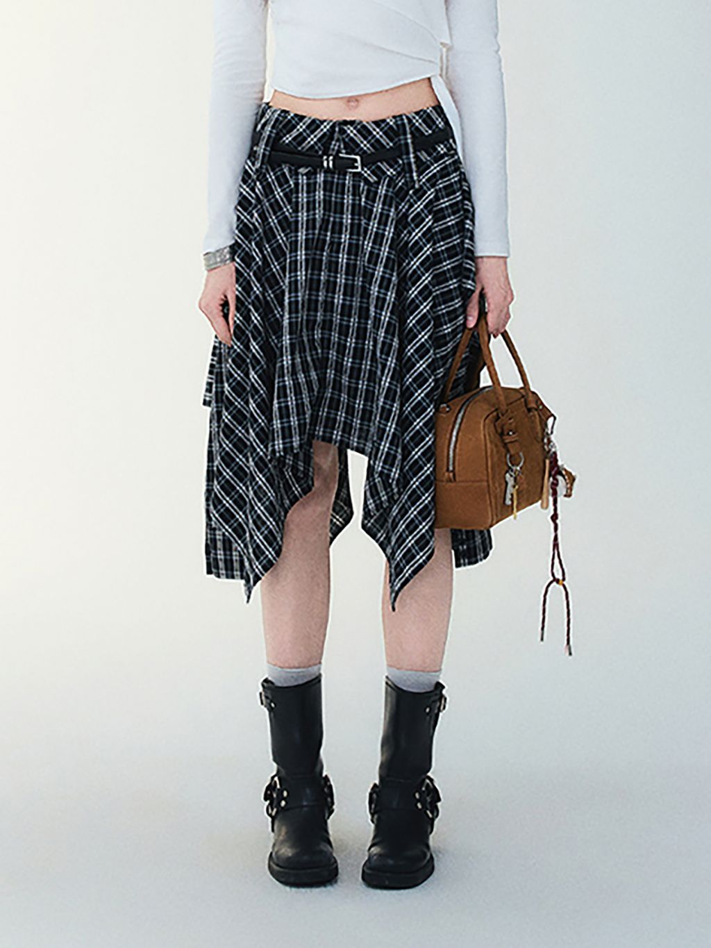 플레어 실루엣의 체크 스커트입니다.