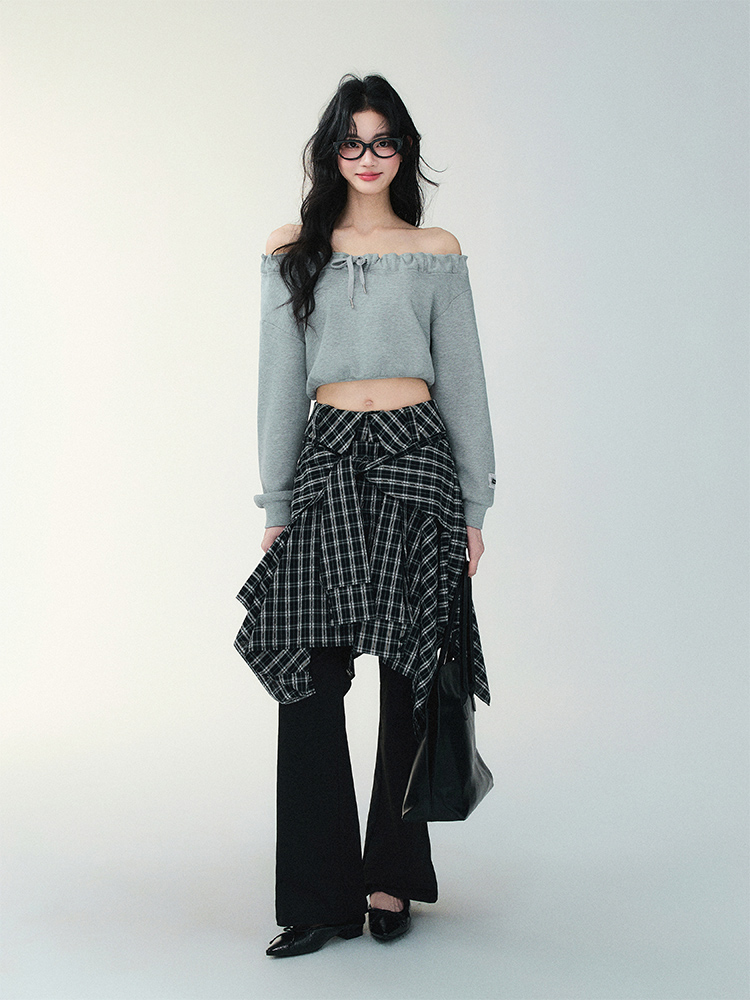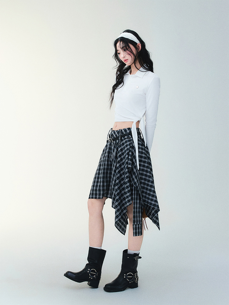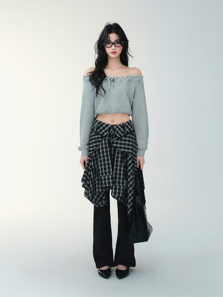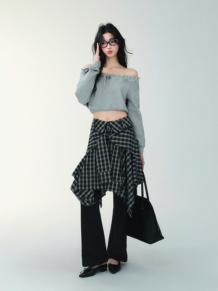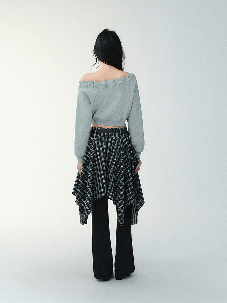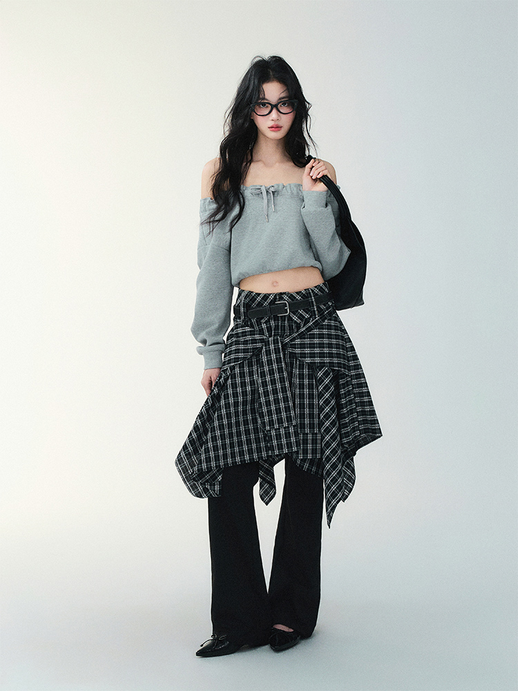 Unblanced Flare Sleeve Strap Plaid Skirt