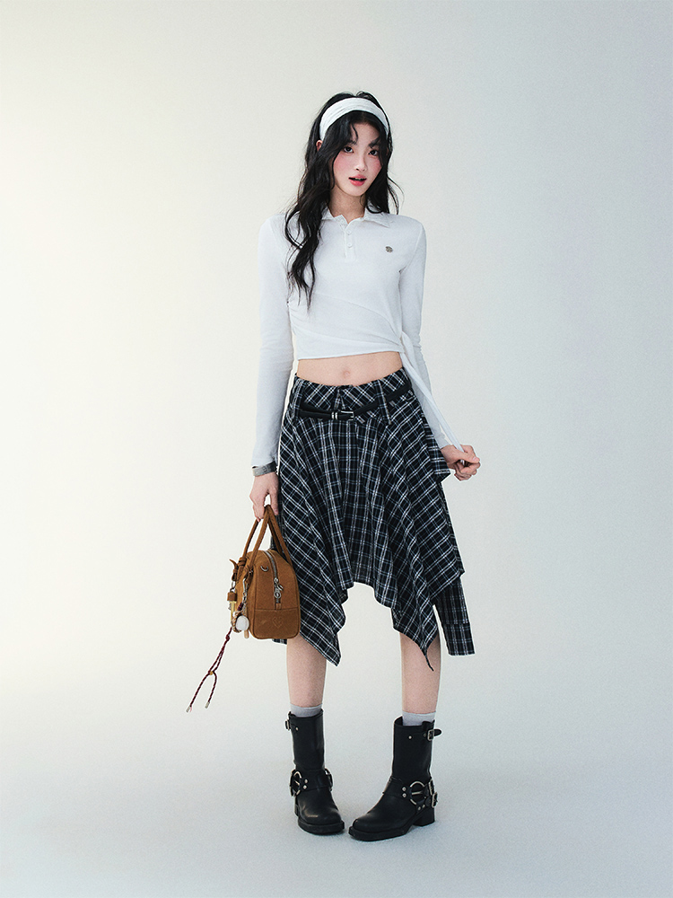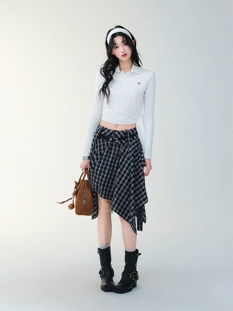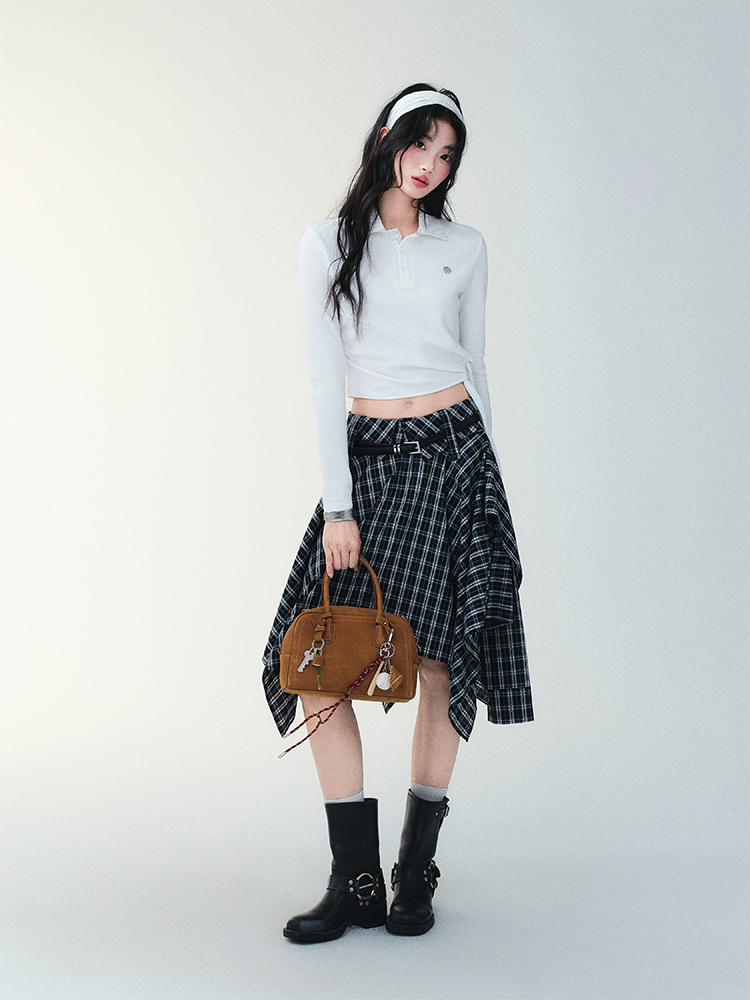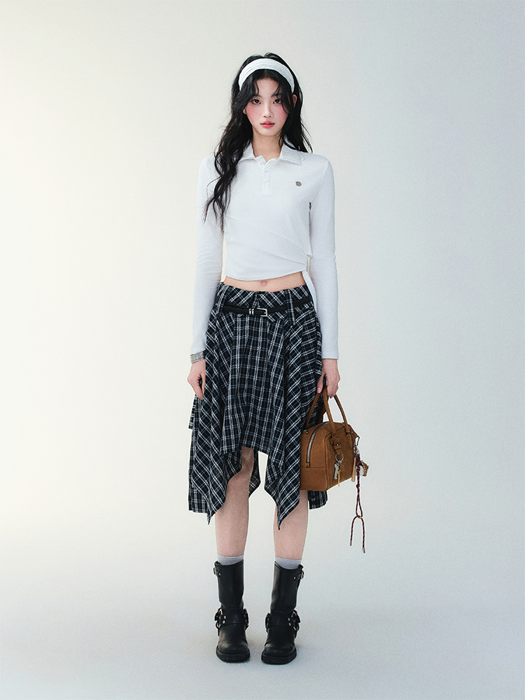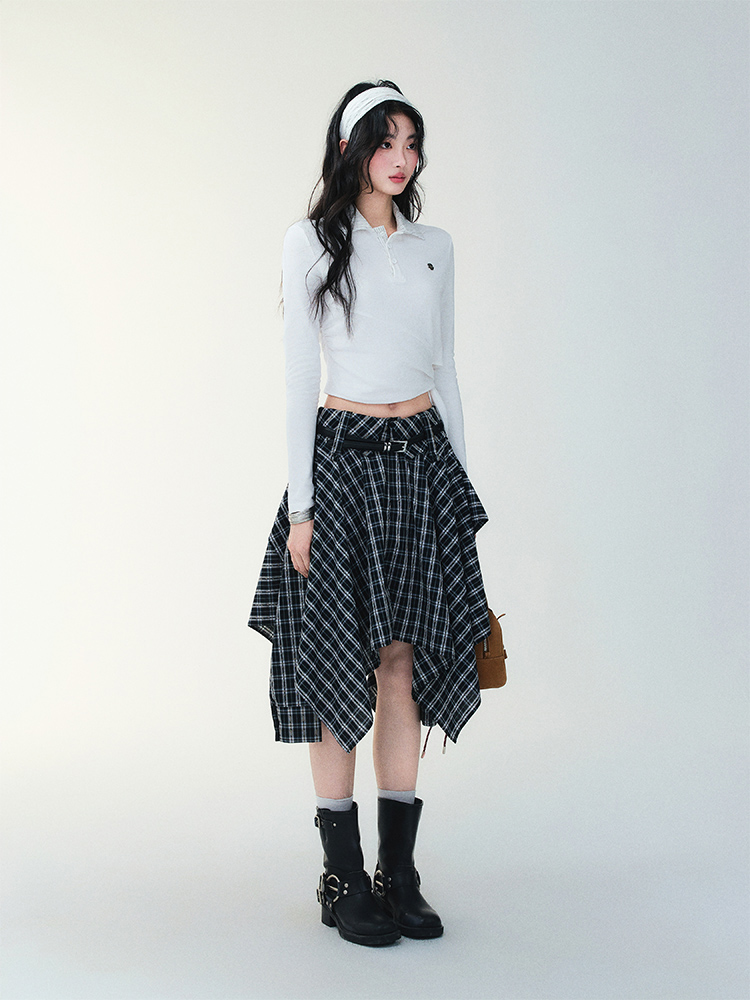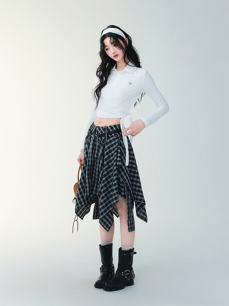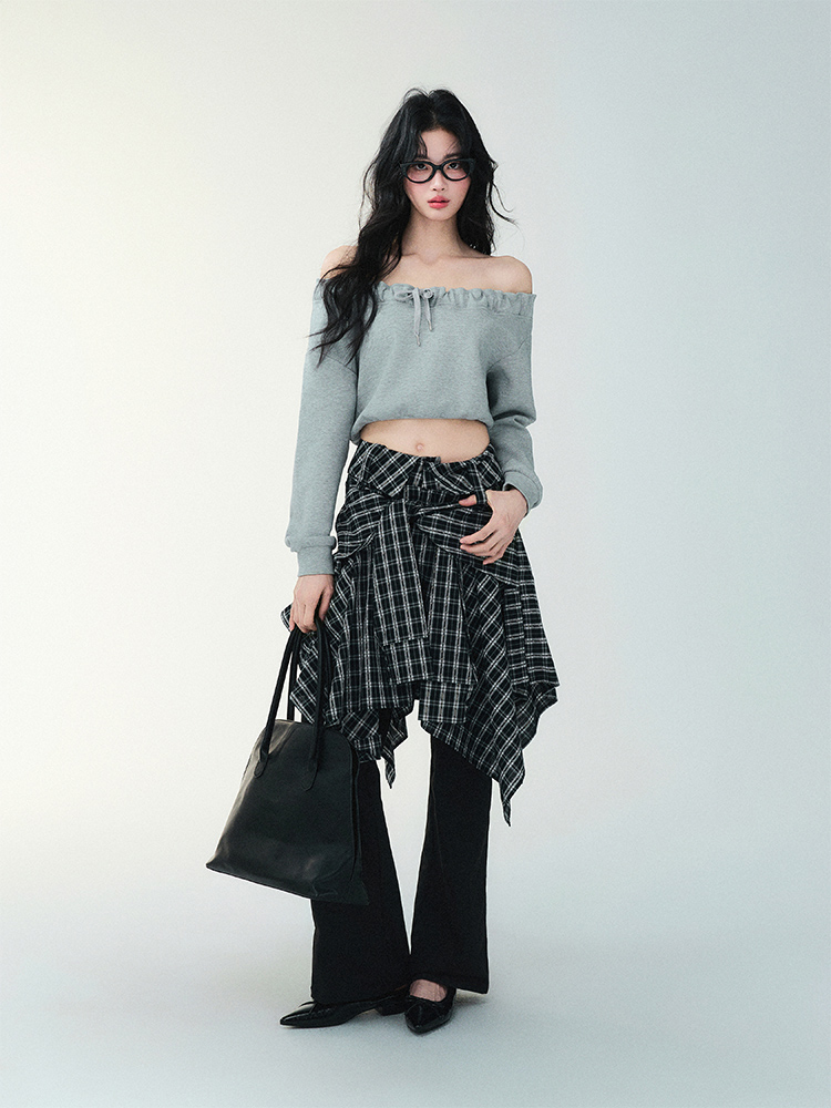 Unblanced Flare Sleeve Strap Plaid Skirt