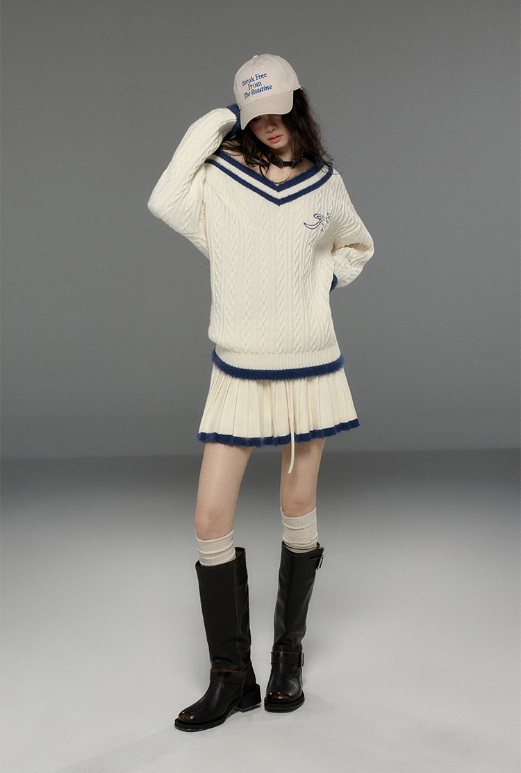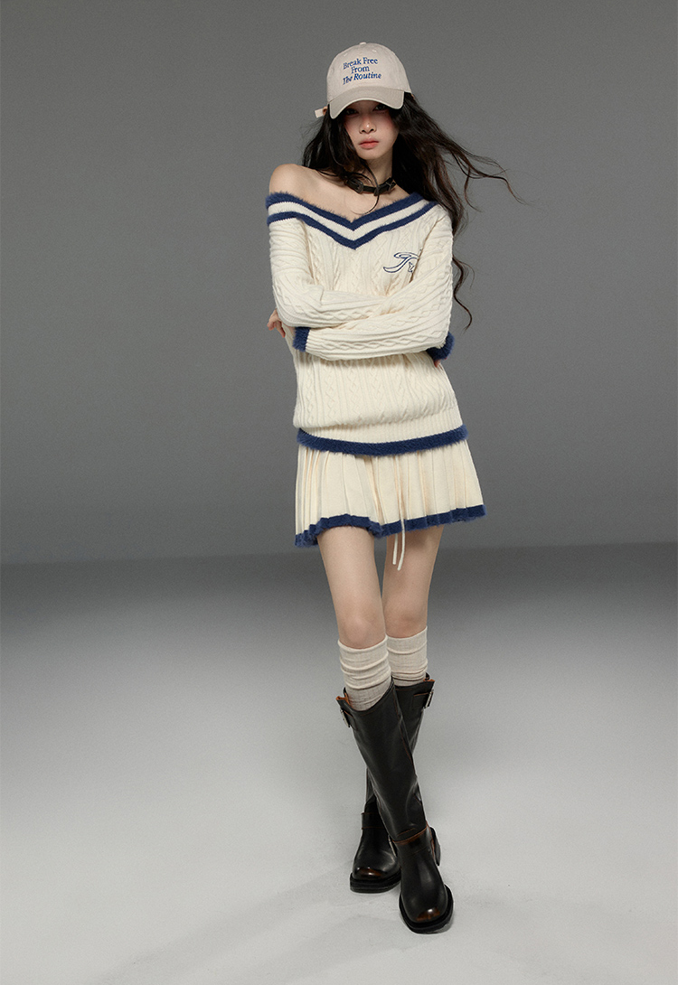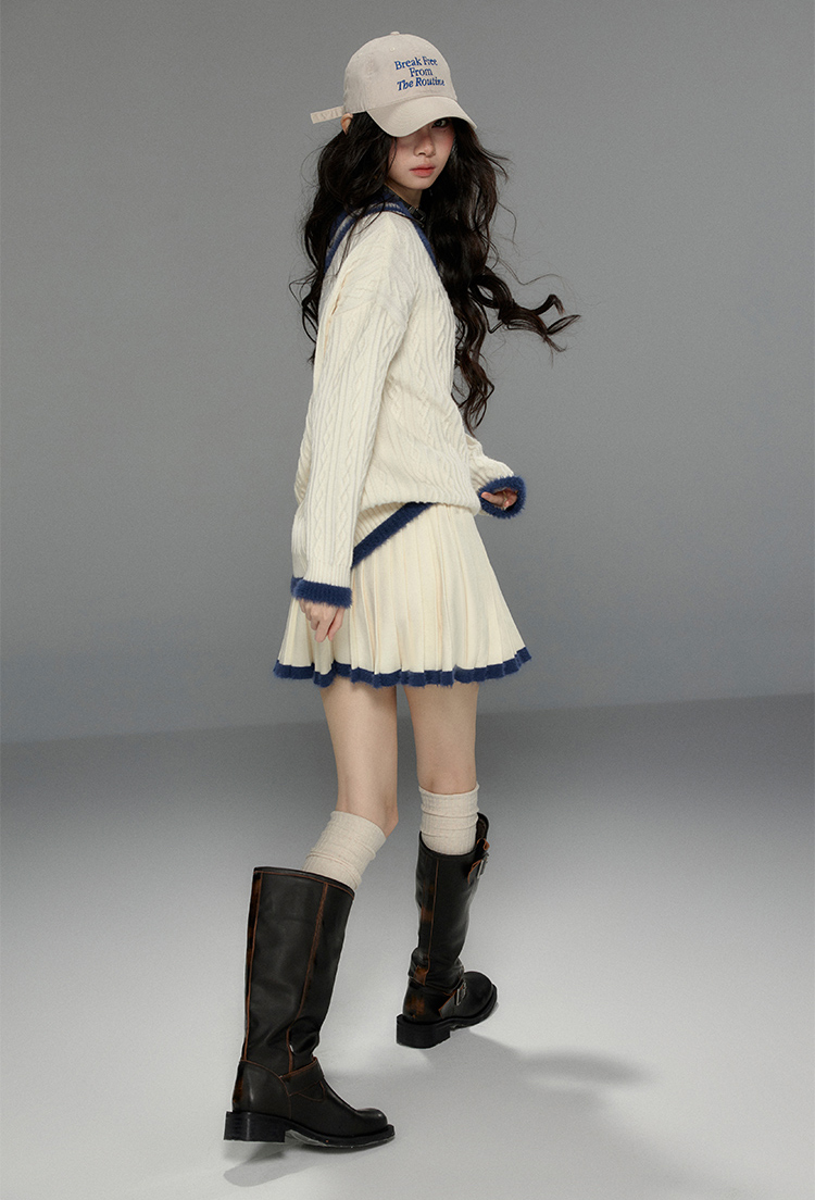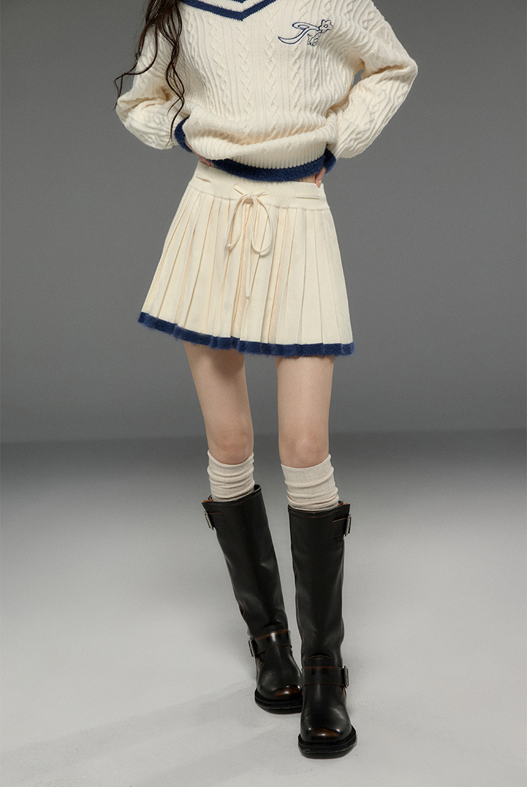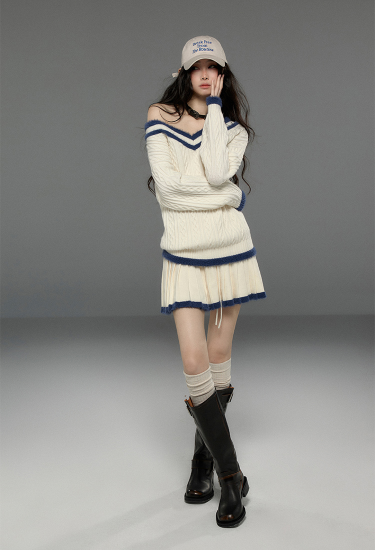 브이넥 니트&플리츠 스커트 셋업입니다.