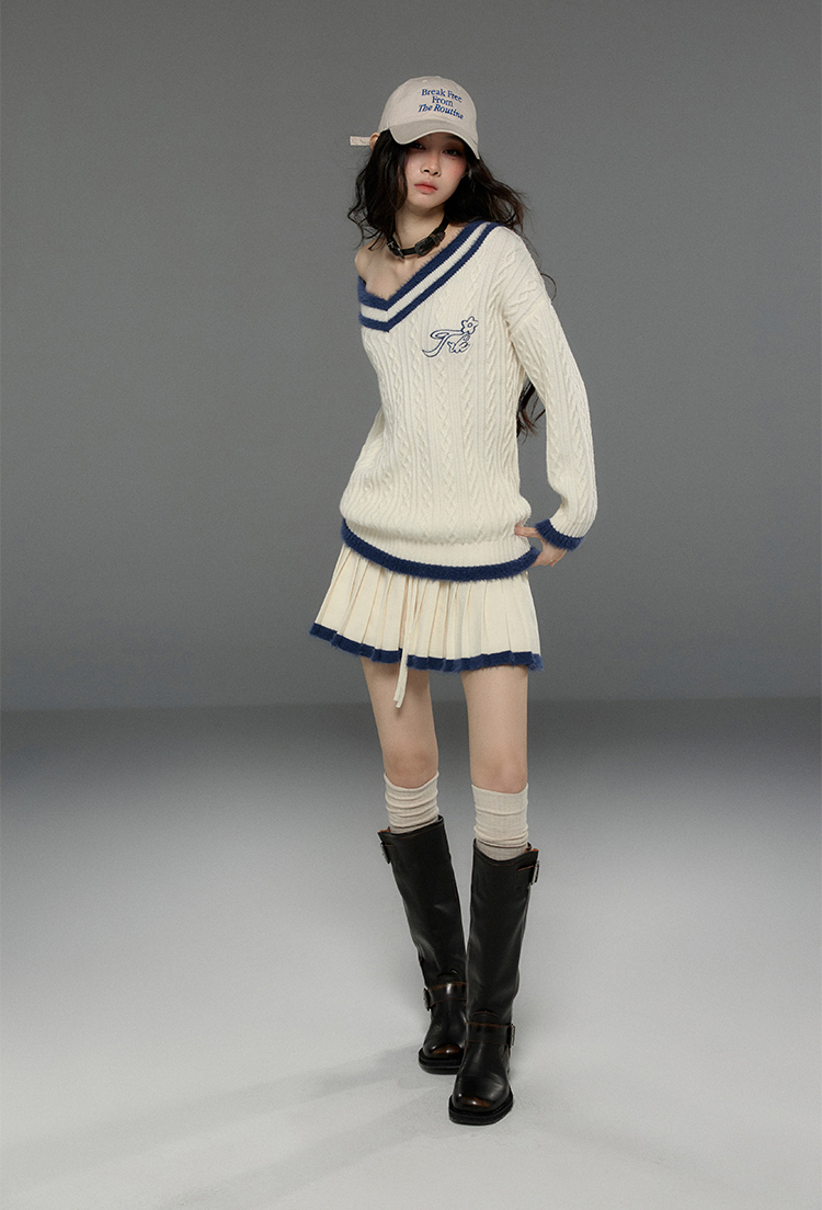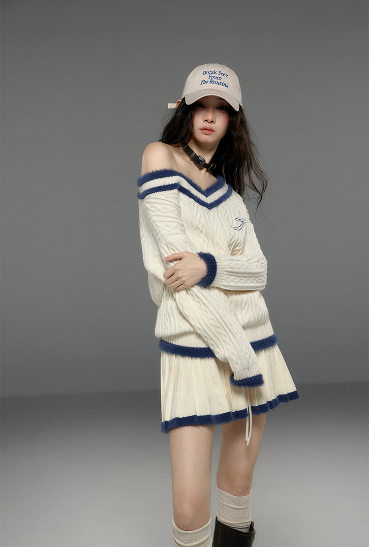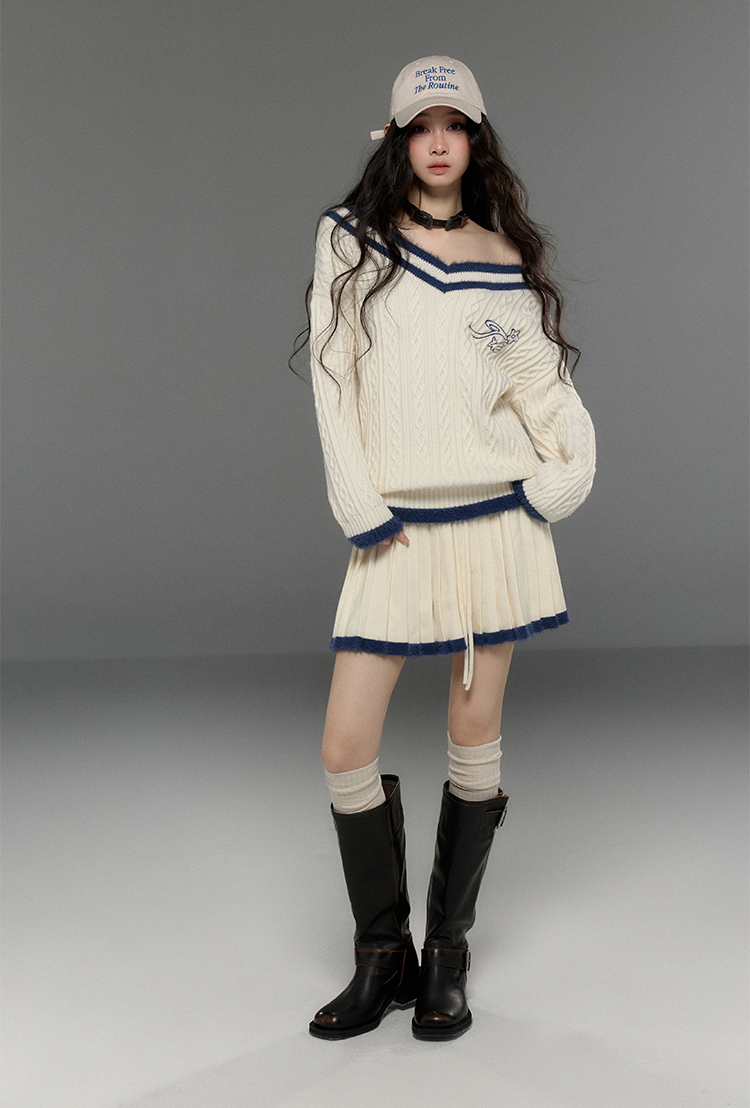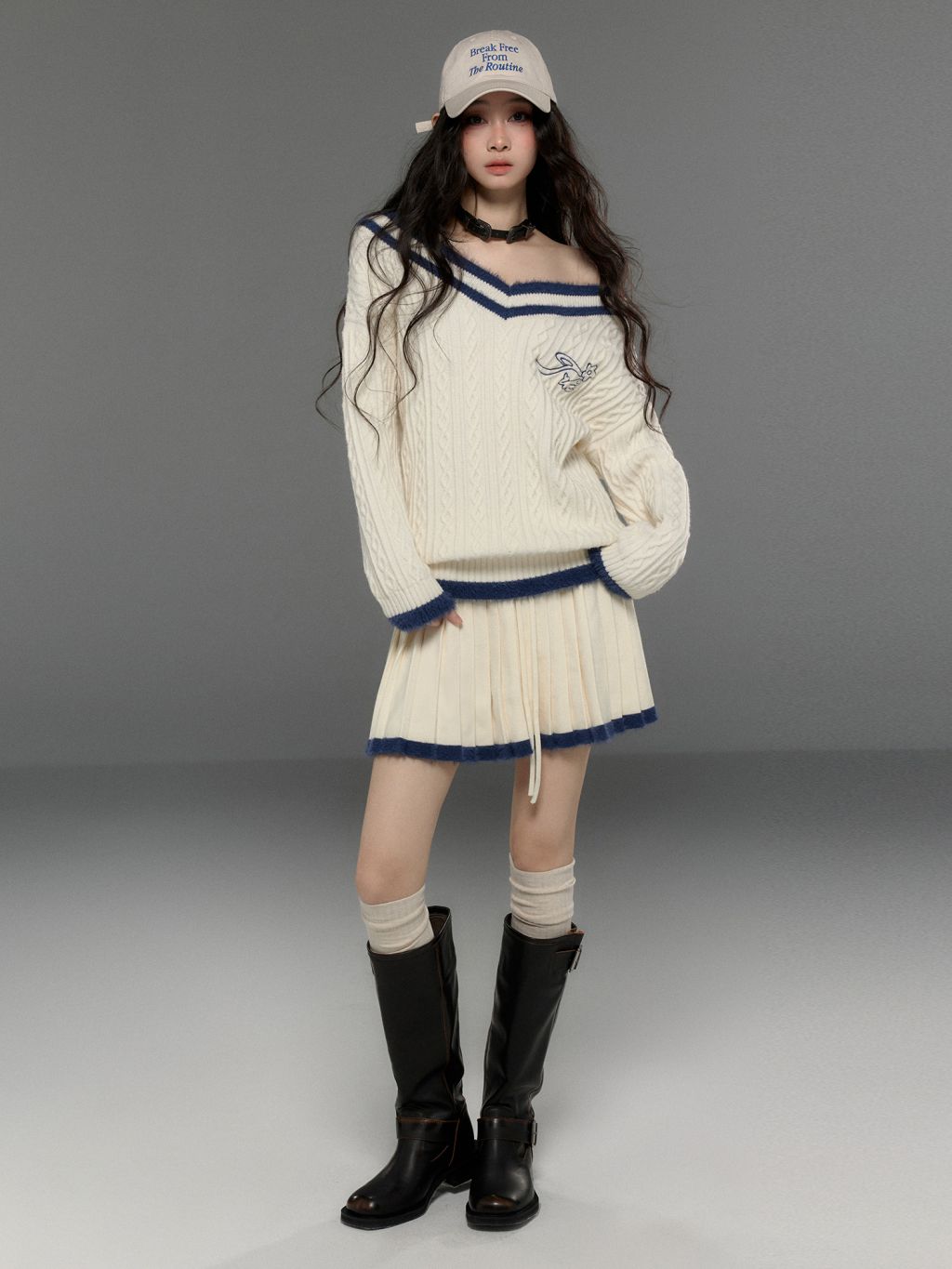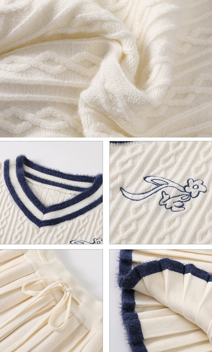 브이넥 니트&플리츠 스커트 셋업입니다.