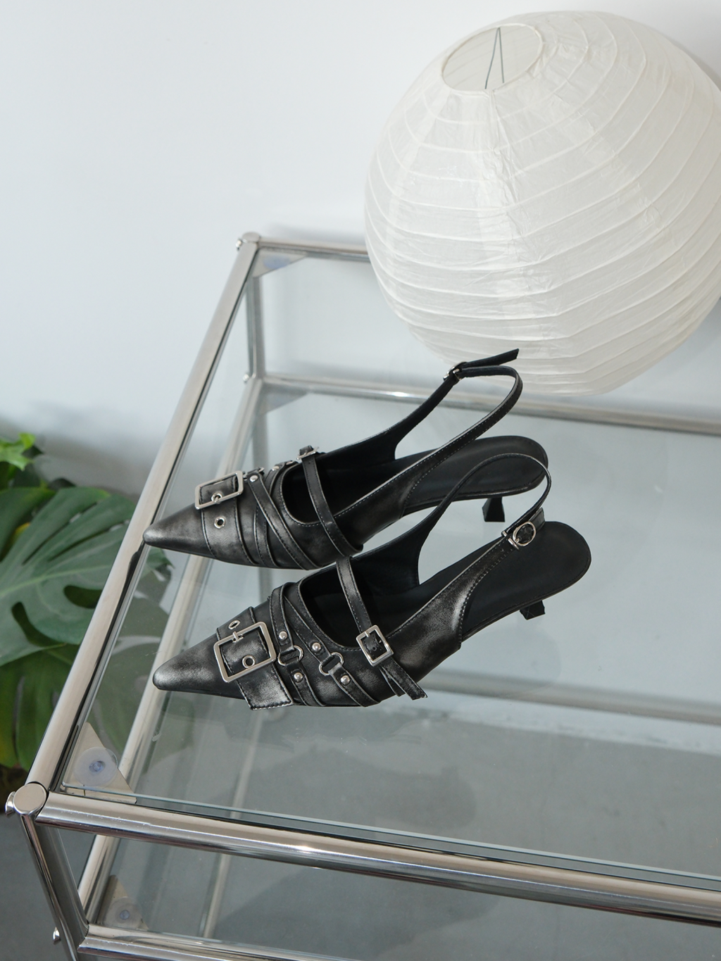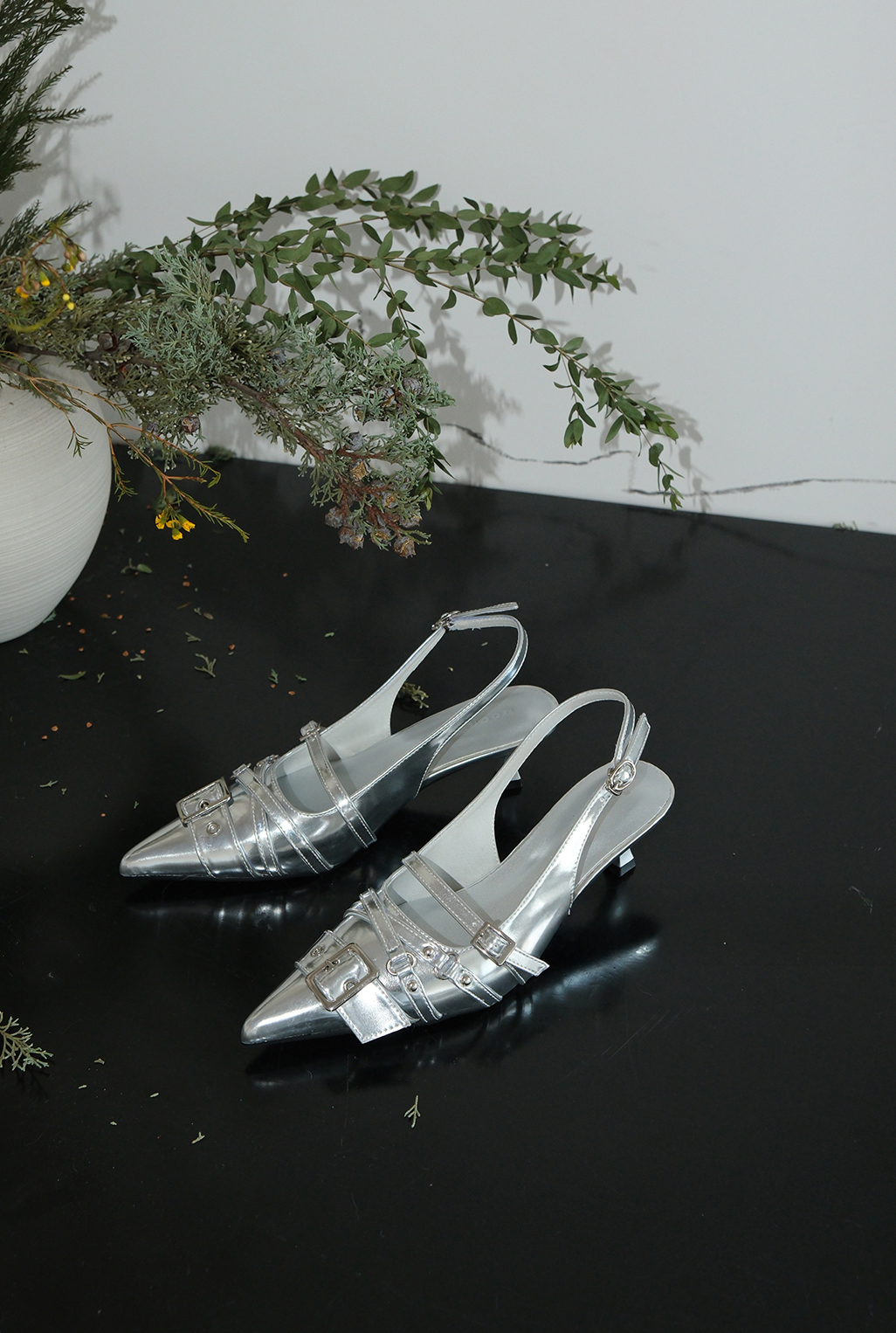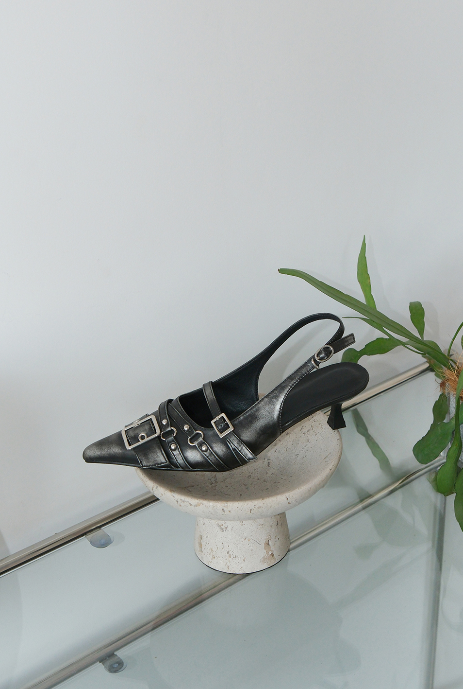 벨트 버클 디테일이 돋보이는 슬링백 힐입니다.
