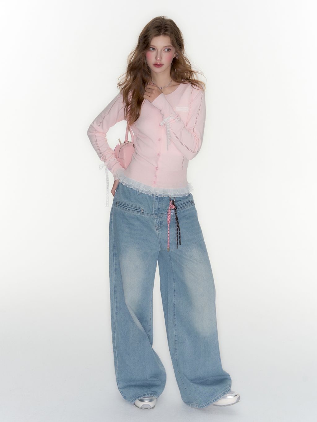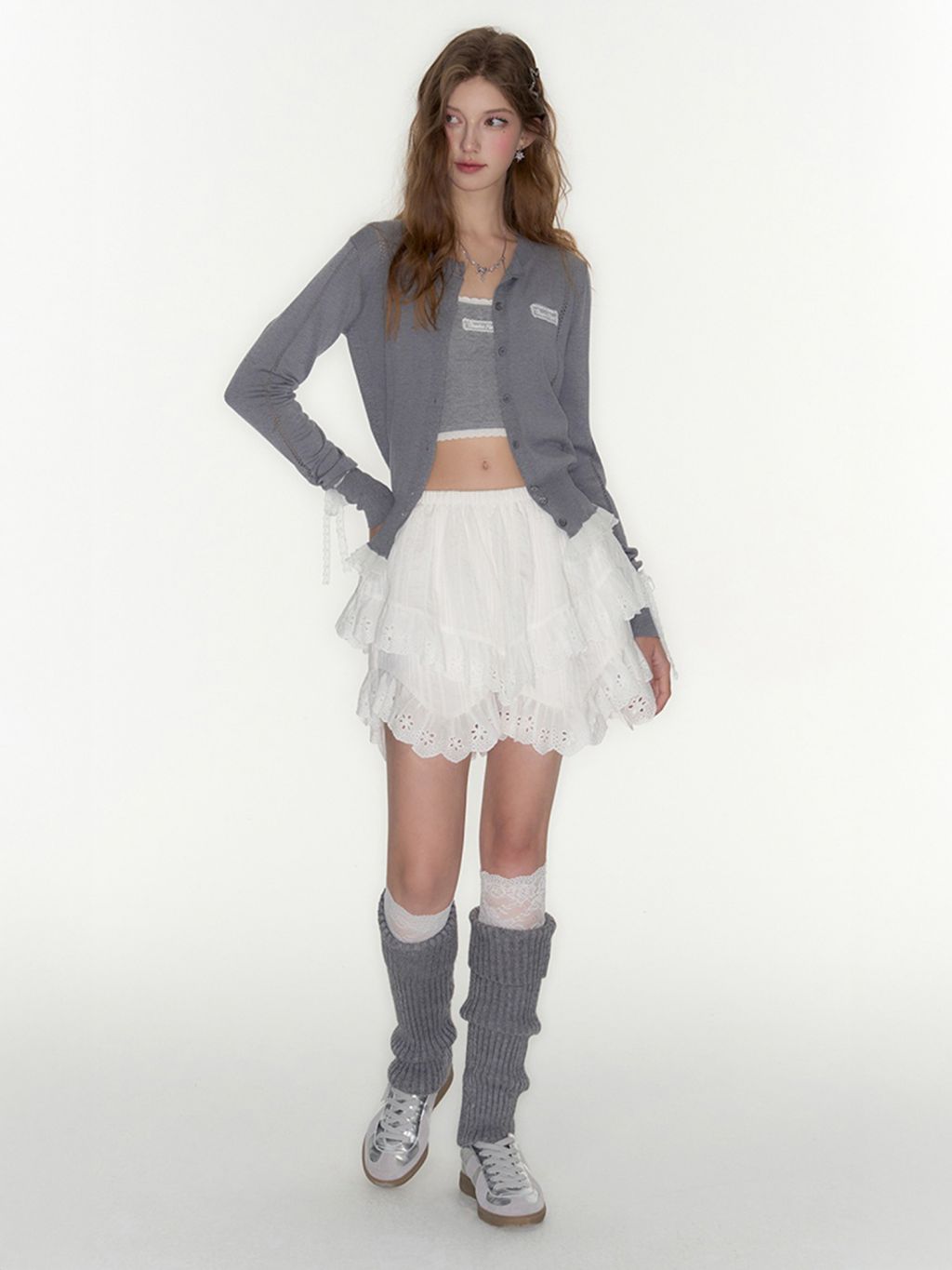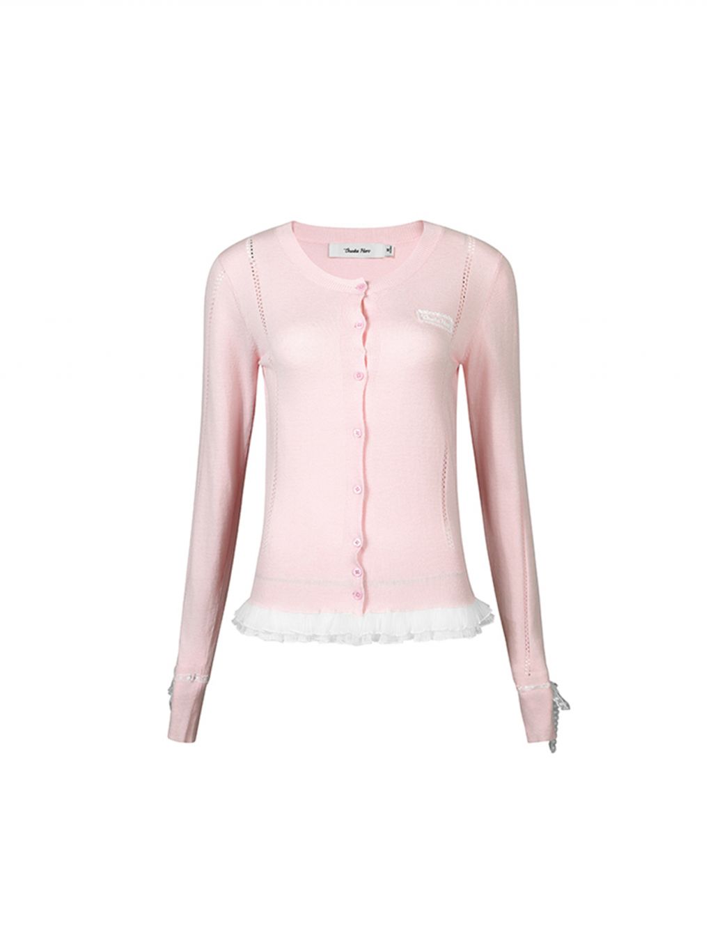 밑단과 소매의 레이스 디테일로 러블리한 무드를 연출하는 가디건