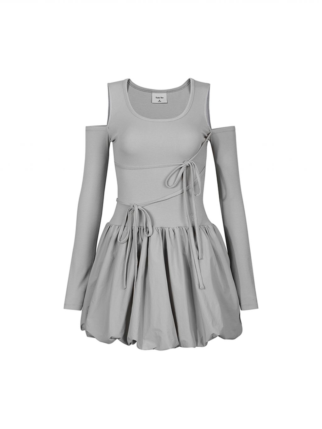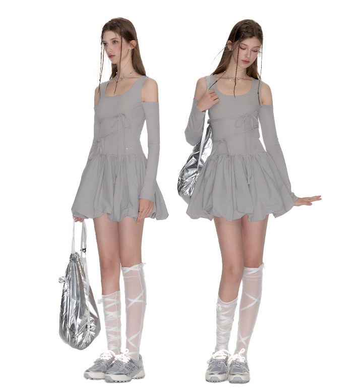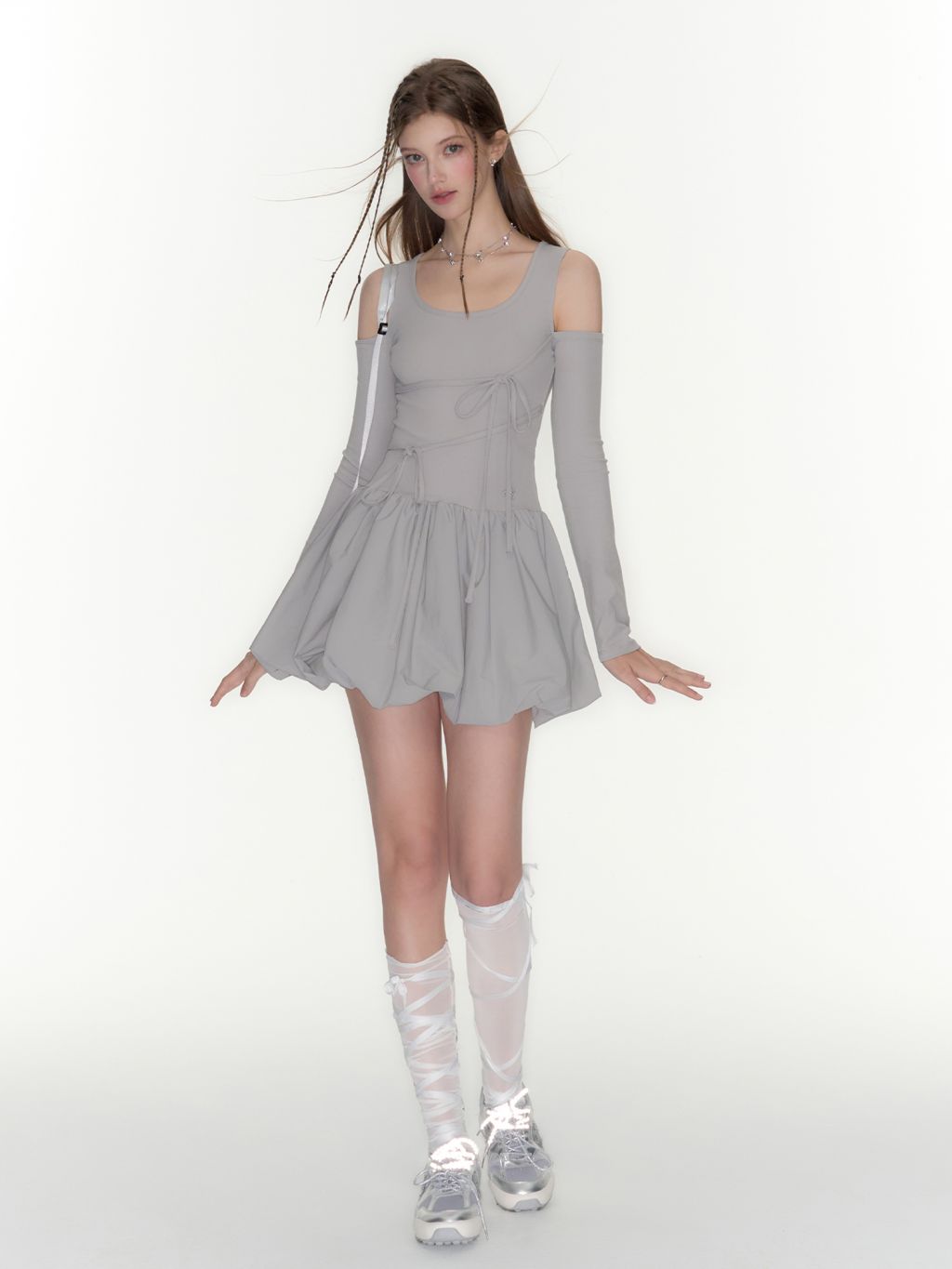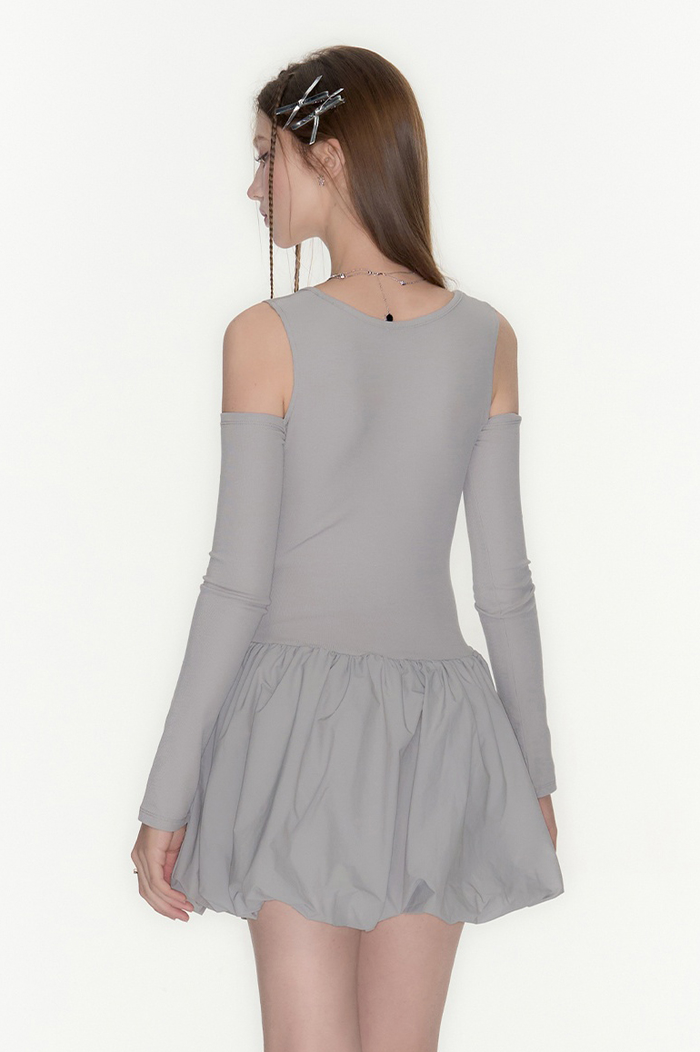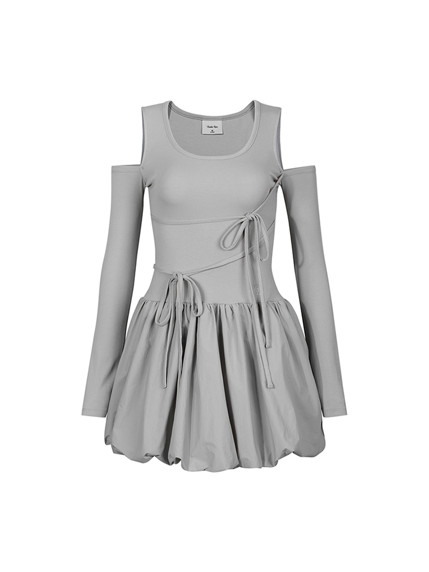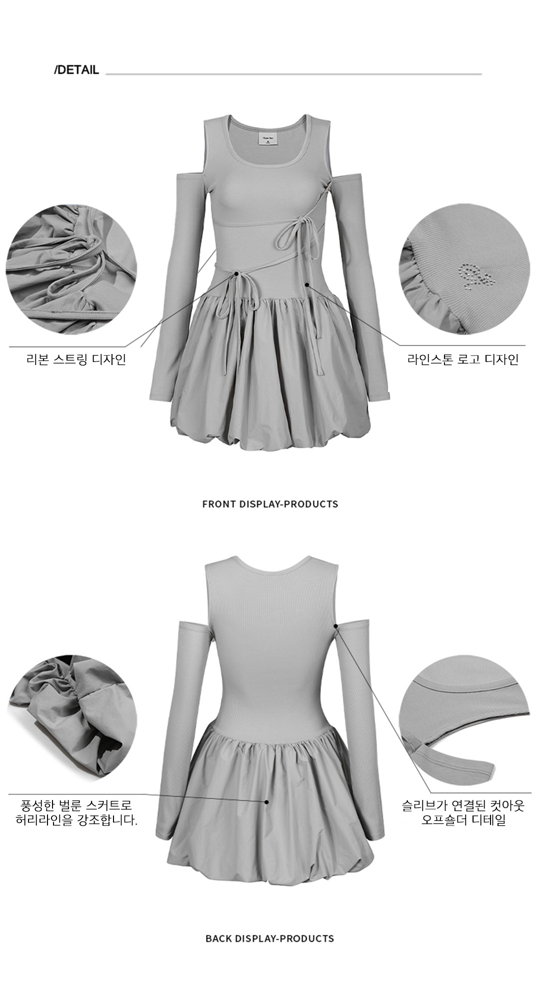 허리 라인을 잡아주는 슬림한 라인과 벌룬 핏 스커트로 몸매 보정 효과의 오프숄더 드레스