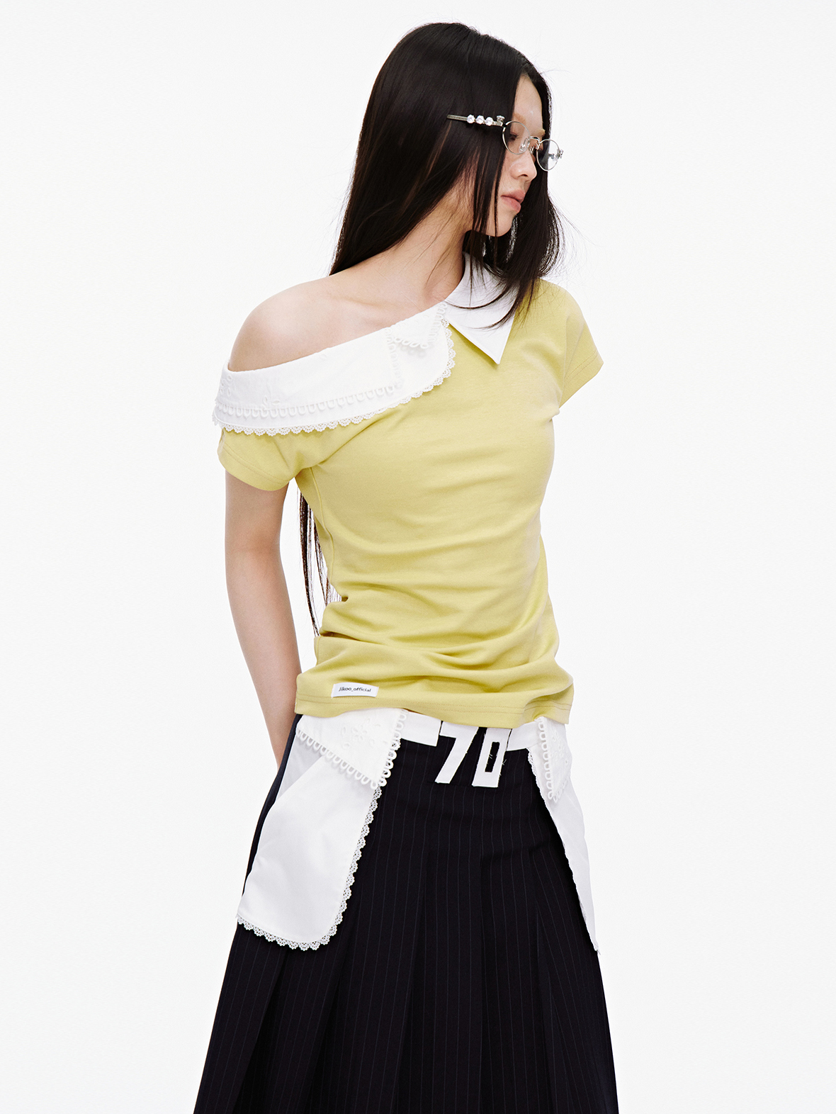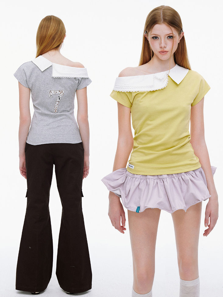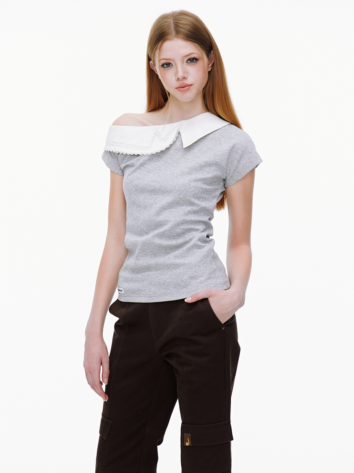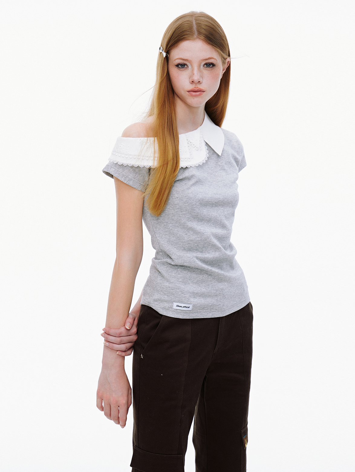 어깨선이 한쪽은 자연스럽게 드러나도록 디자인되어 여리여리한 실루엣을 강조하며 넥카라 부분은 섬세한 레이스 디테일을 추가하여 러블리한 매력을 더한 아이템