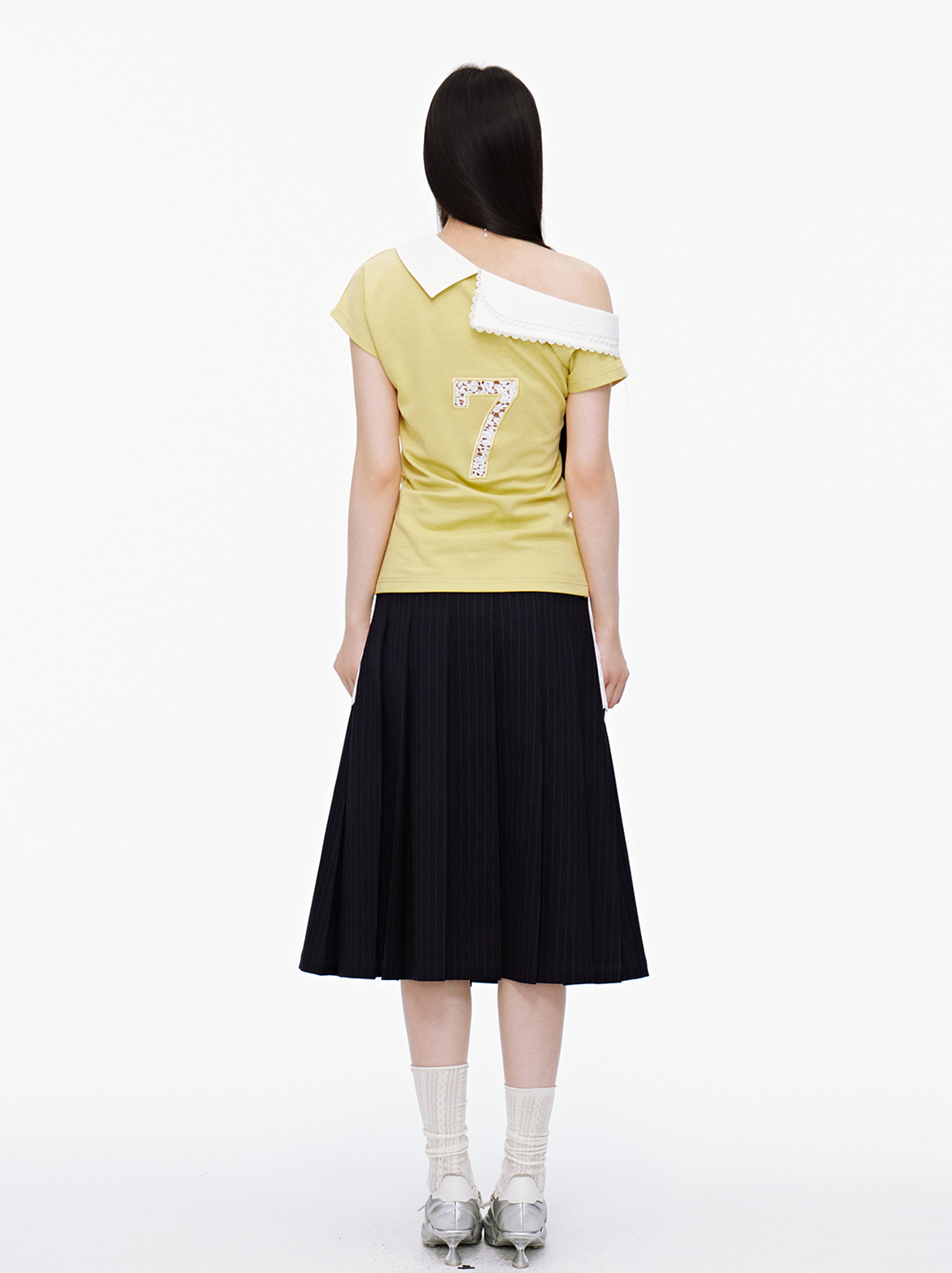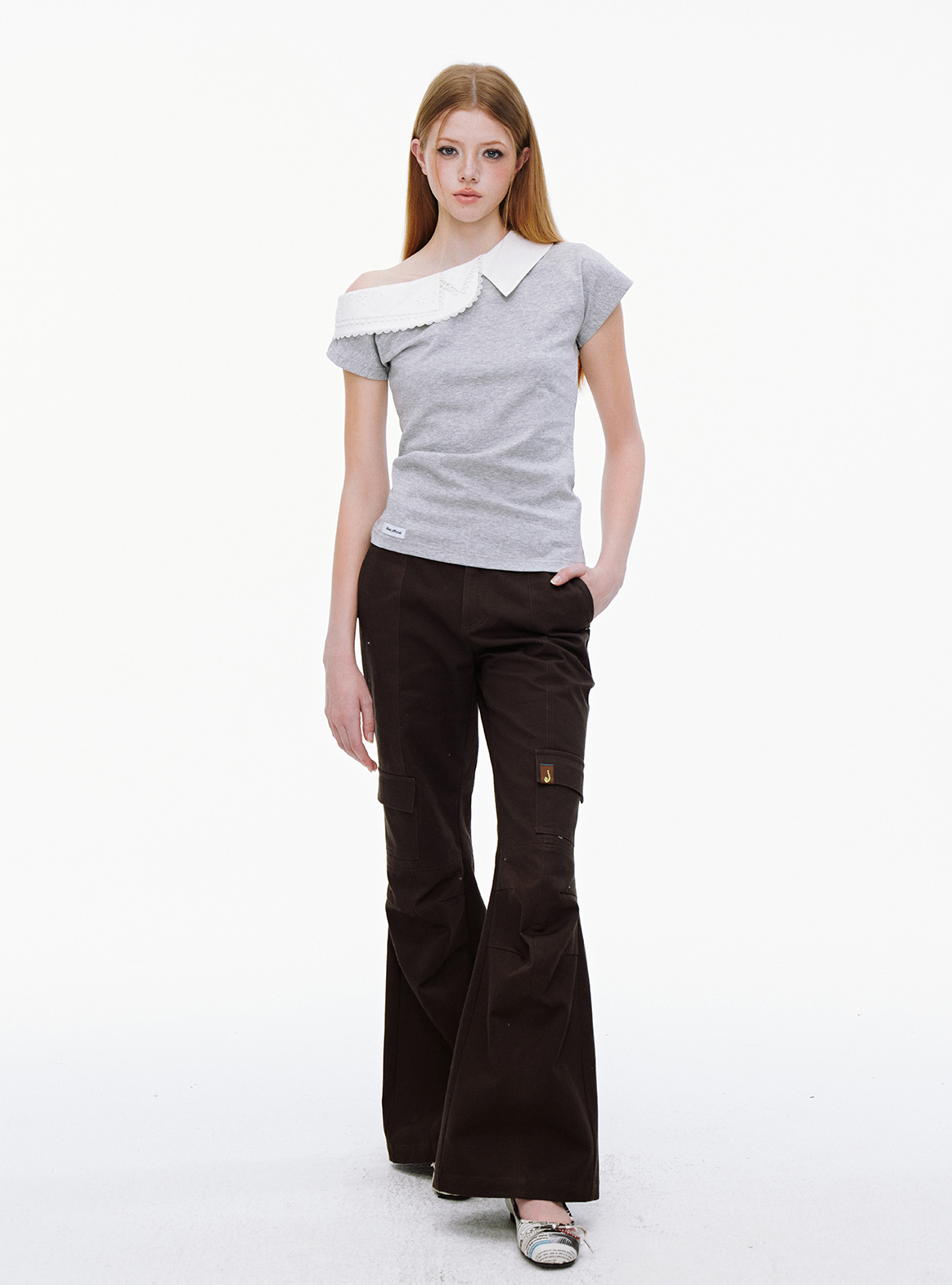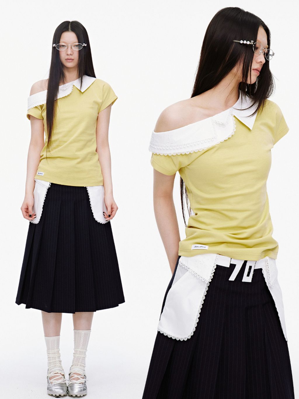 어깨선이 한쪽은 자연스럽게 드러나도록 디자인되어 여리여리한 실루엣을 강조하며 넥카라 부분은 섬세한 레이스 디테일을 추가하여 러블리한 매력을 더한 아이템