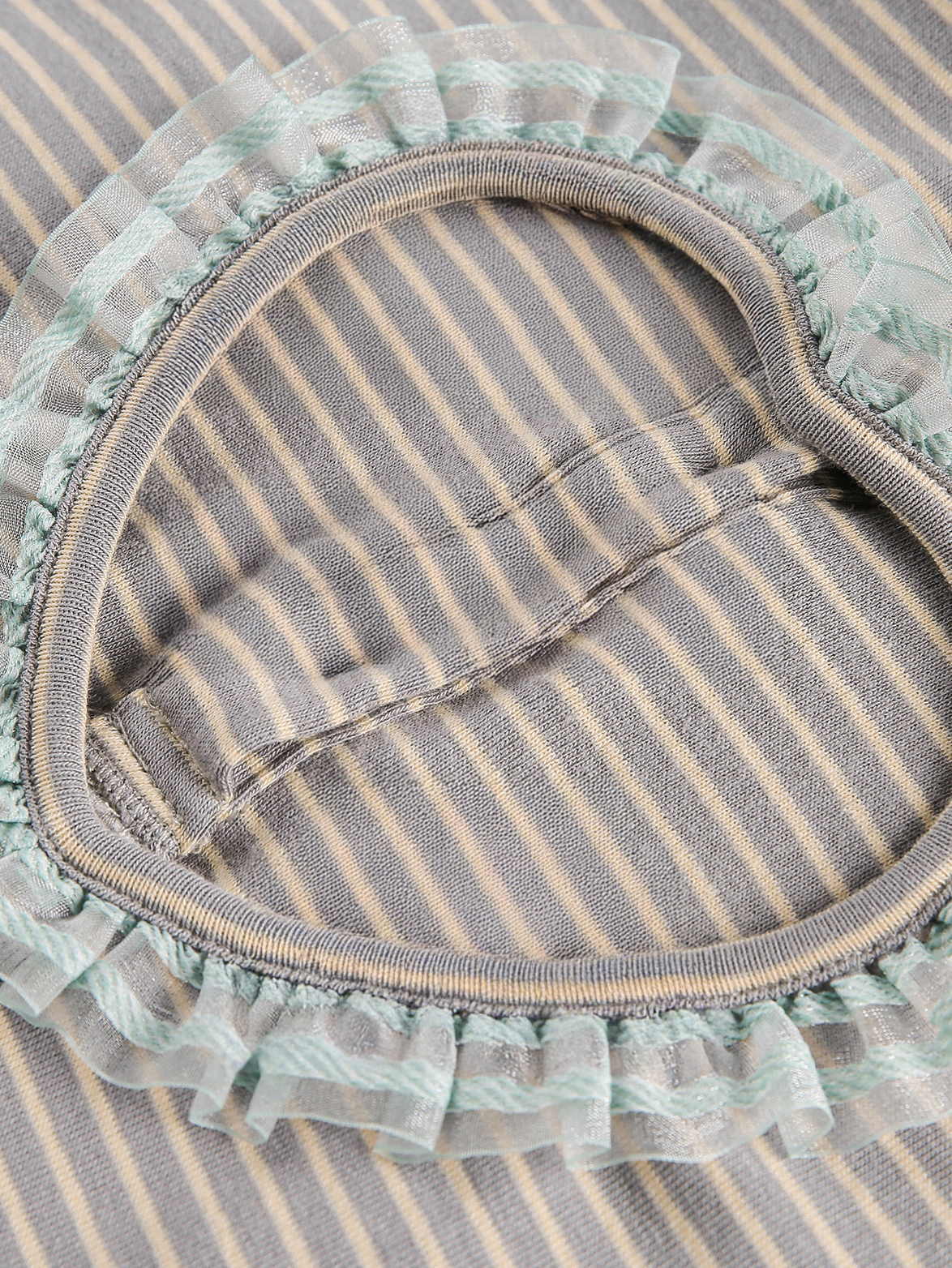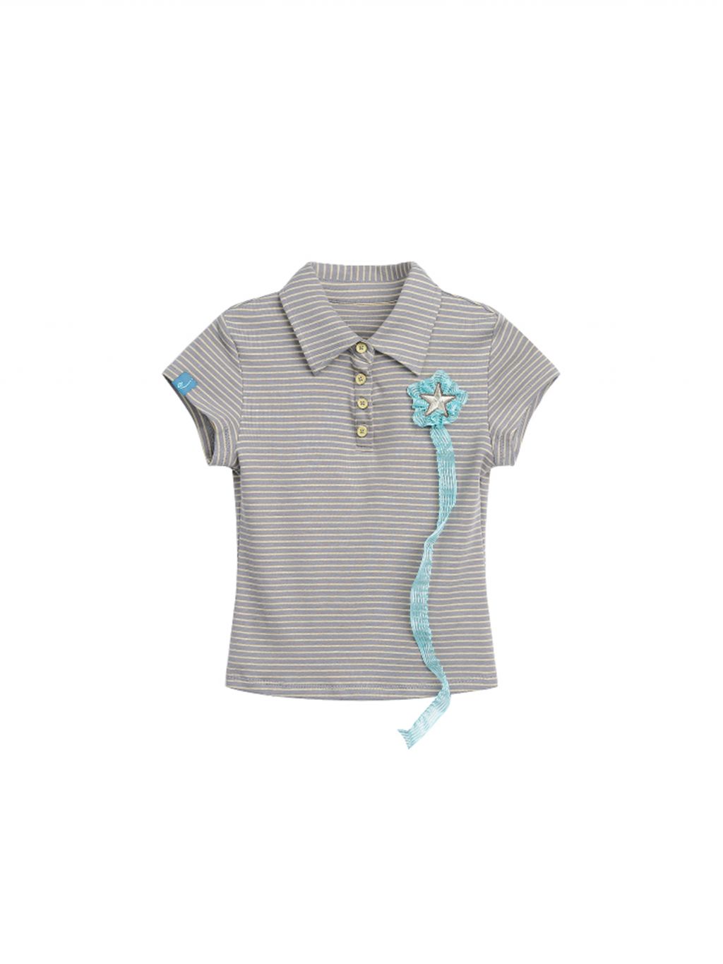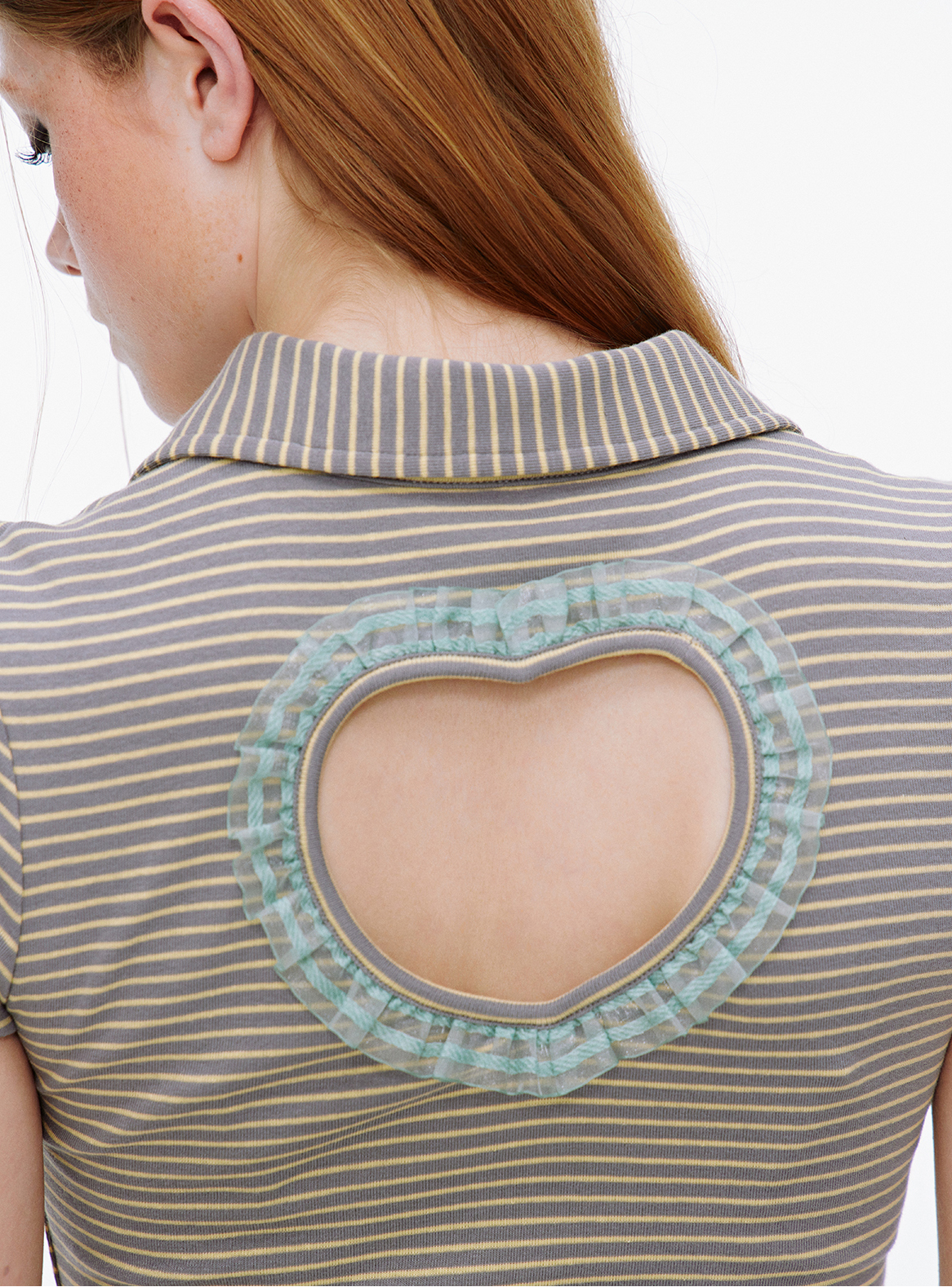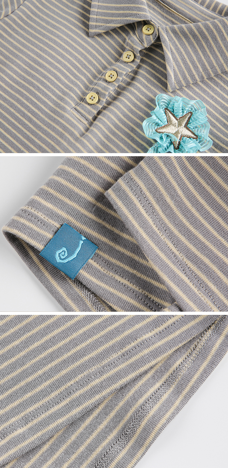 그레이와 옐로우 스트라이프 패턴을 바탕으로 리본과 별 모양의 패치가 유니크한 포인트가 되며 뒤쪽에는 하트 모양의 리본 장식이 있어 뒷모습까지 신경 쓴 디자인이 매력적인 티셔츠