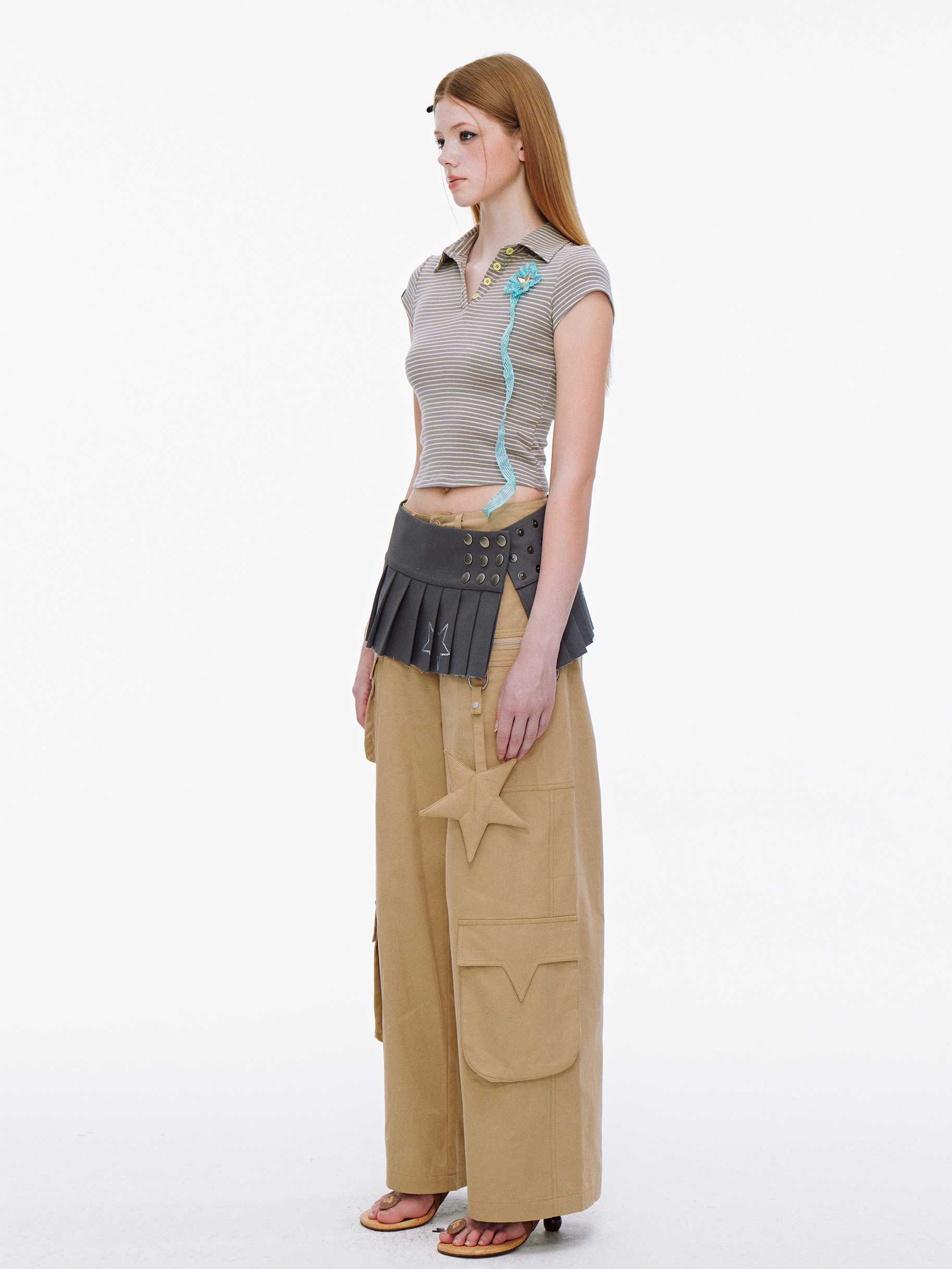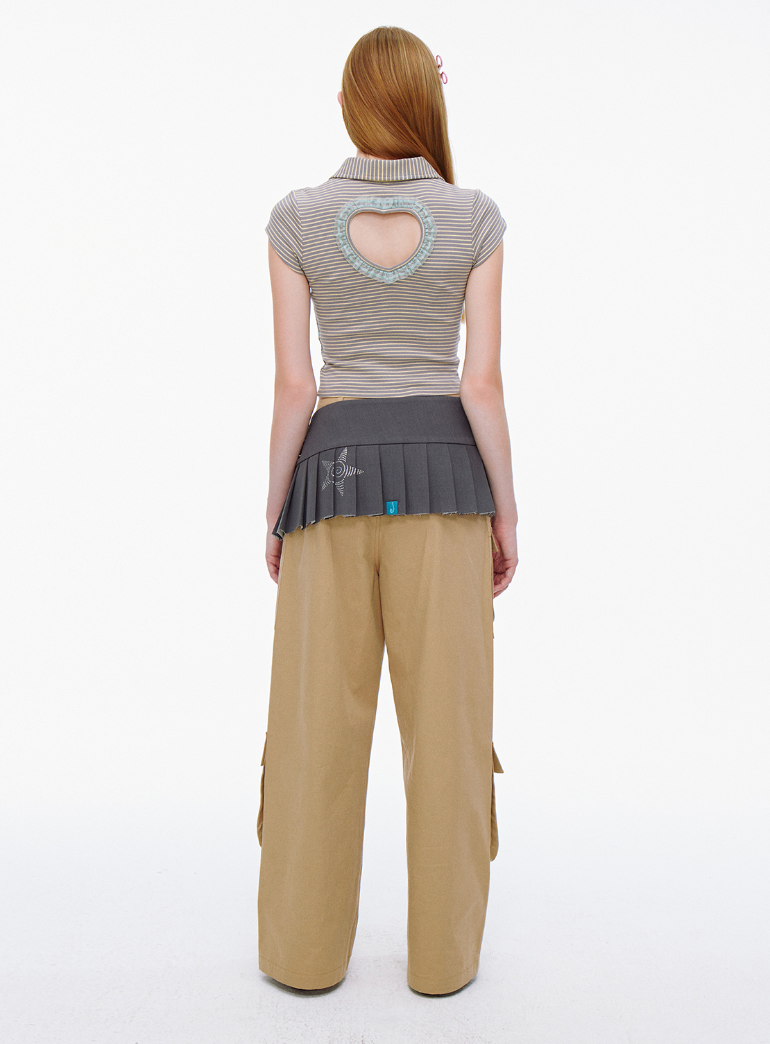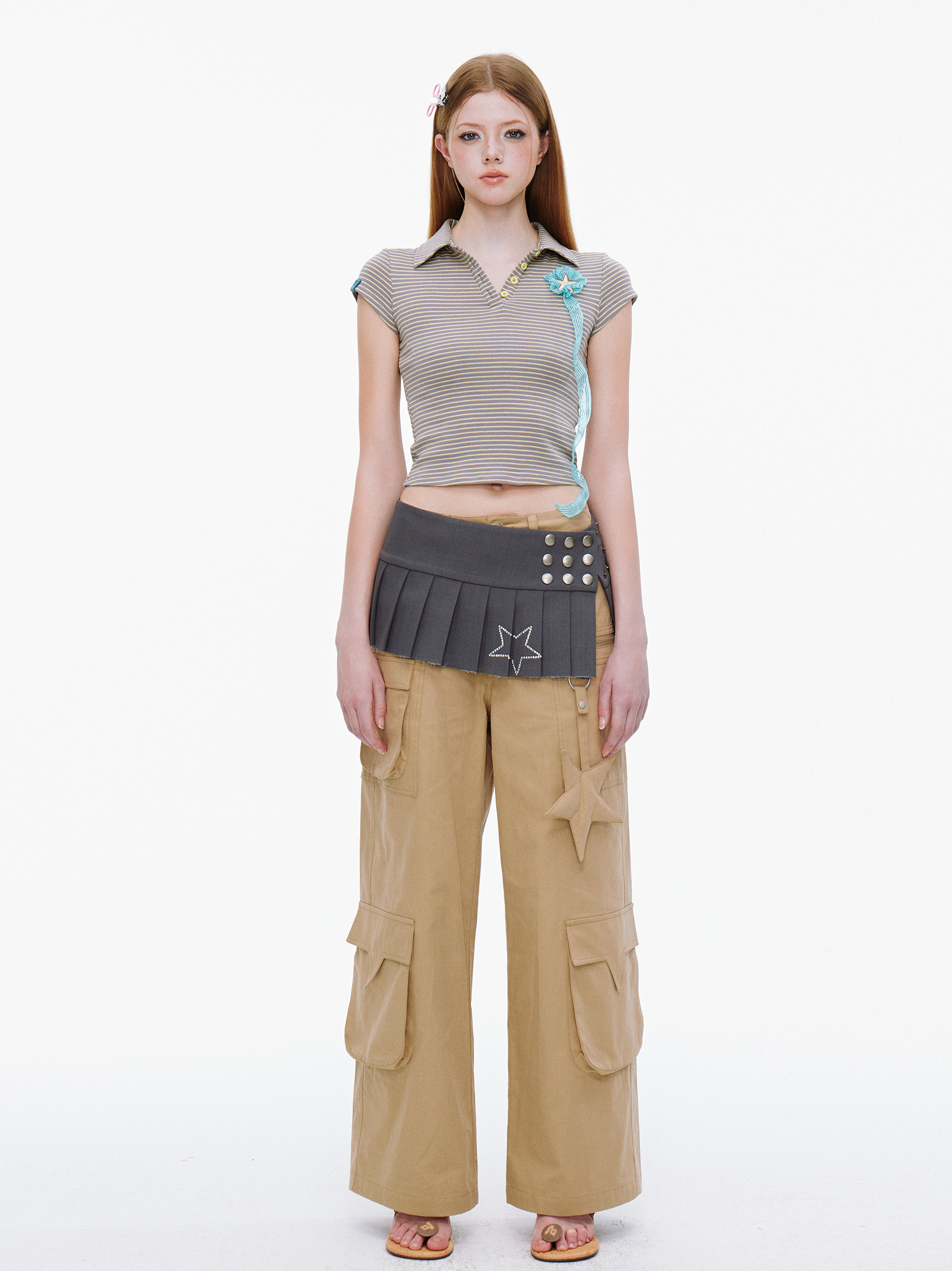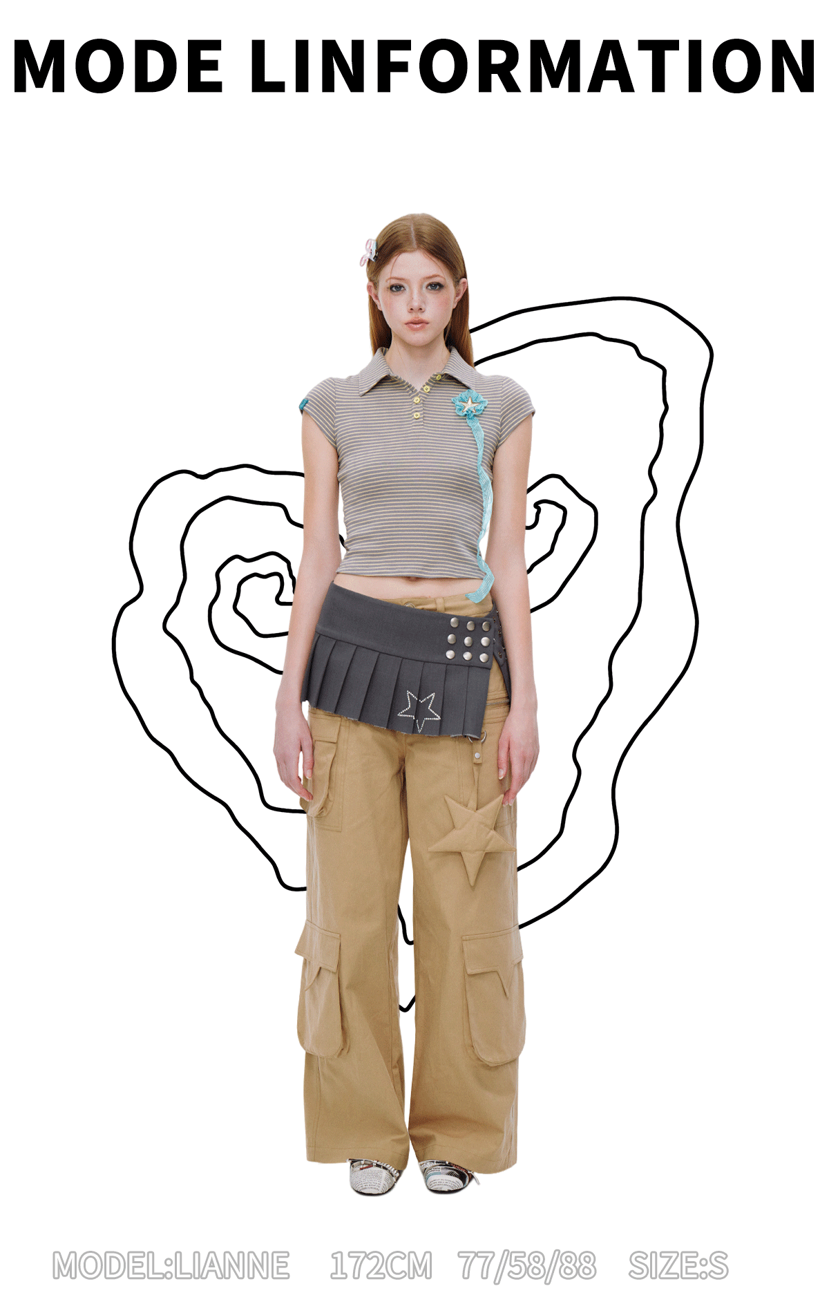 그레이와 옐로우 스트라이프 패턴을 바탕으로 리본과 별 모양의 패치가 유니크한 포인트가 되며 뒤쪽에는 하트 모양의 리본 장식이 있어 뒷모습까지 신경 쓴 디자인이 매력적인 티셔츠