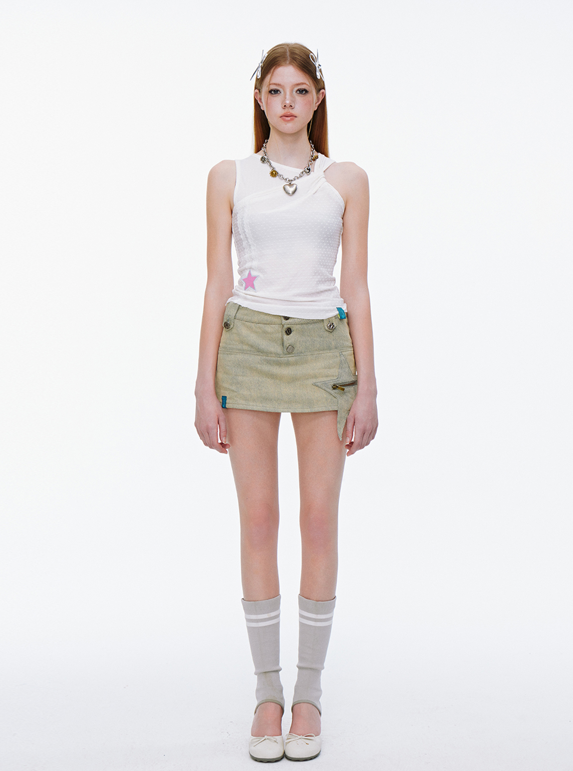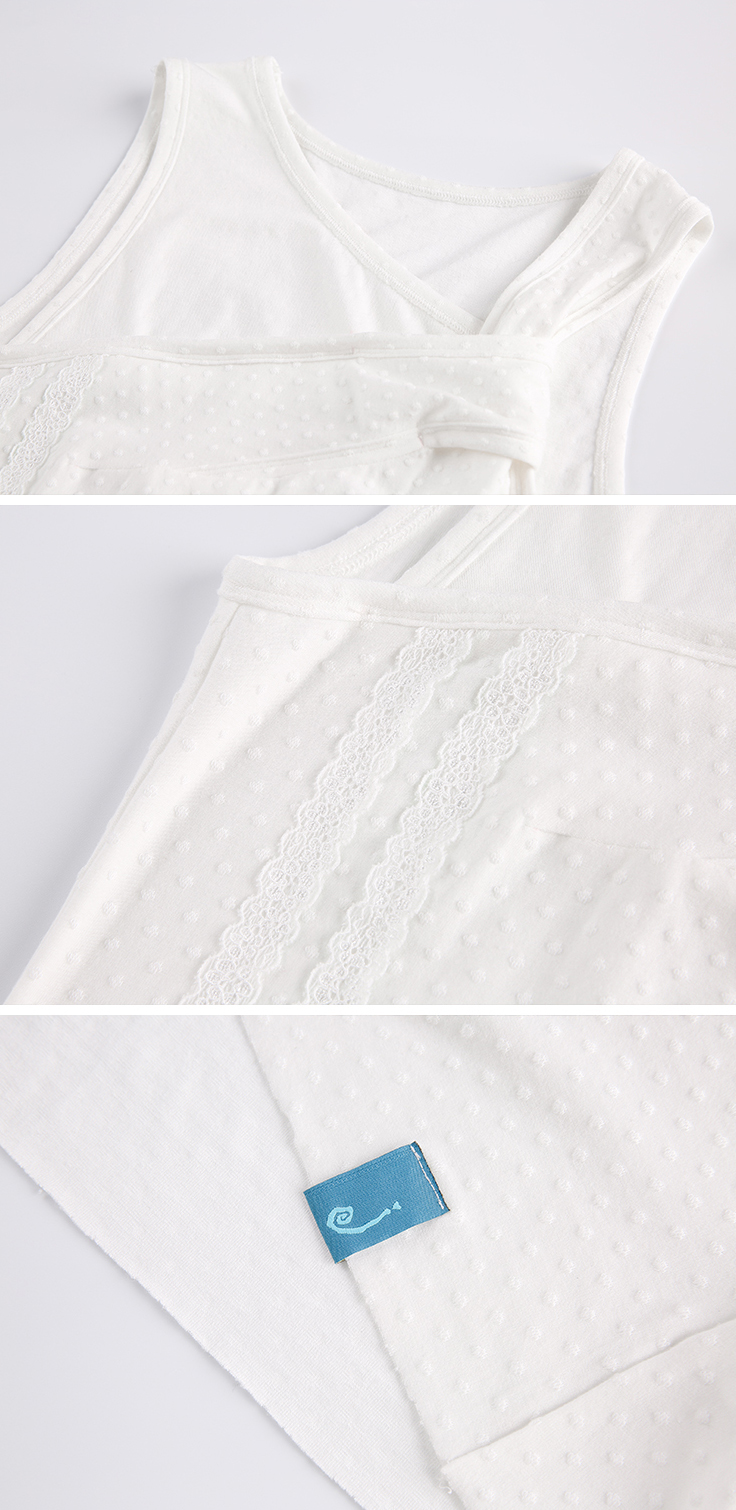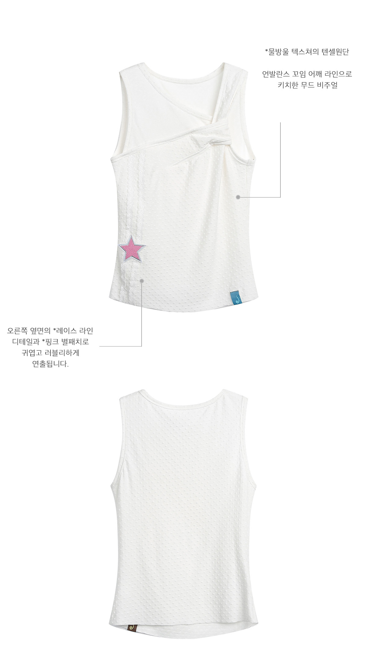 깔끔한 화이트 색상의 디자인에 별 모양 패치와 레이스 장식의 디테일이 더해져 심플하면서도 여성스러운 분위기를 자아내며 부드러운 텍스처로 편안한 착용감을 제공하며 여름철 데일리로 활용하기 좋은 슬리브리스