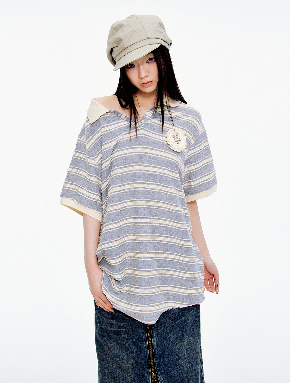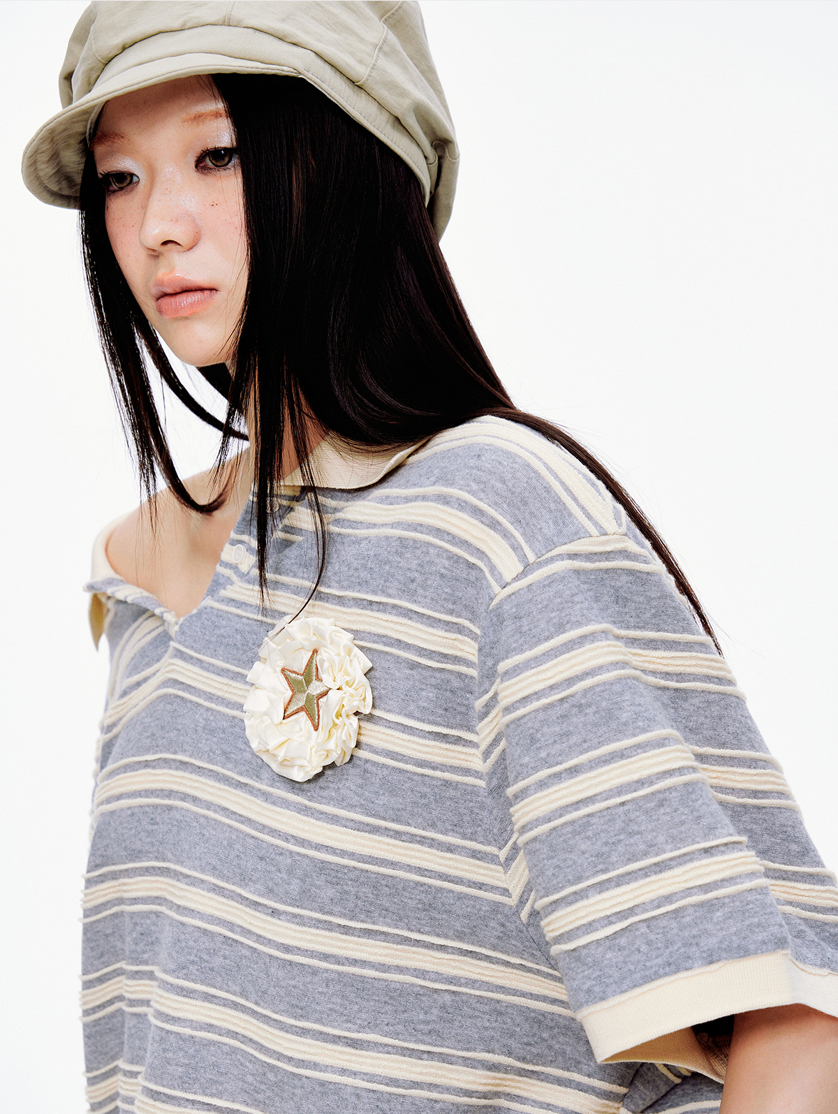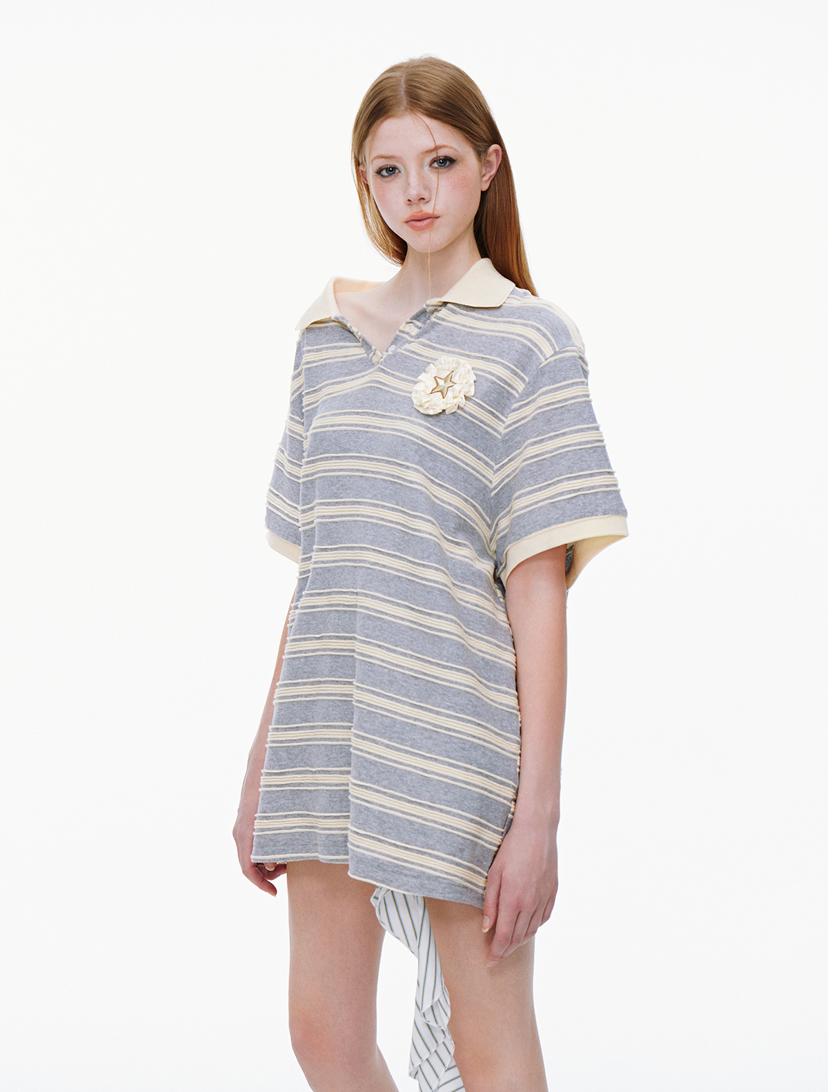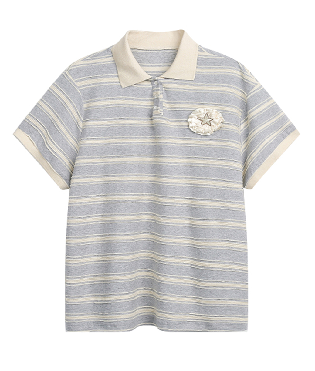 클래식한 스트라이프 패턴과 라운드 넥카라의 루즈핏 티셔츠로 가슴 부분에는 별 모양의 패치와 함께 리본 디테일이 더해져 포인트를 주며 넉넉한 핏과 편안한 착용감으로 일상적인 스타일에 잘 어울리는 아이템