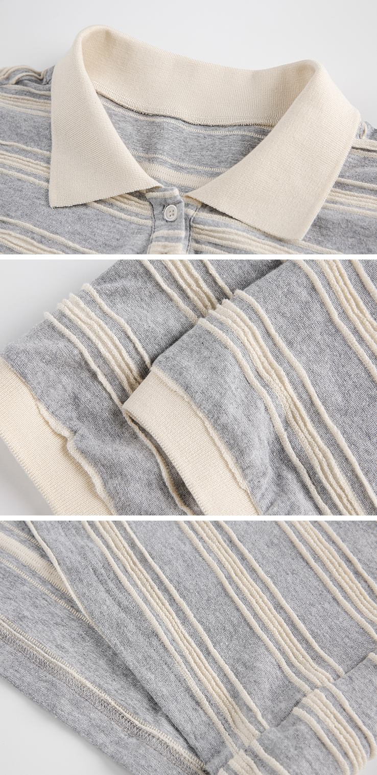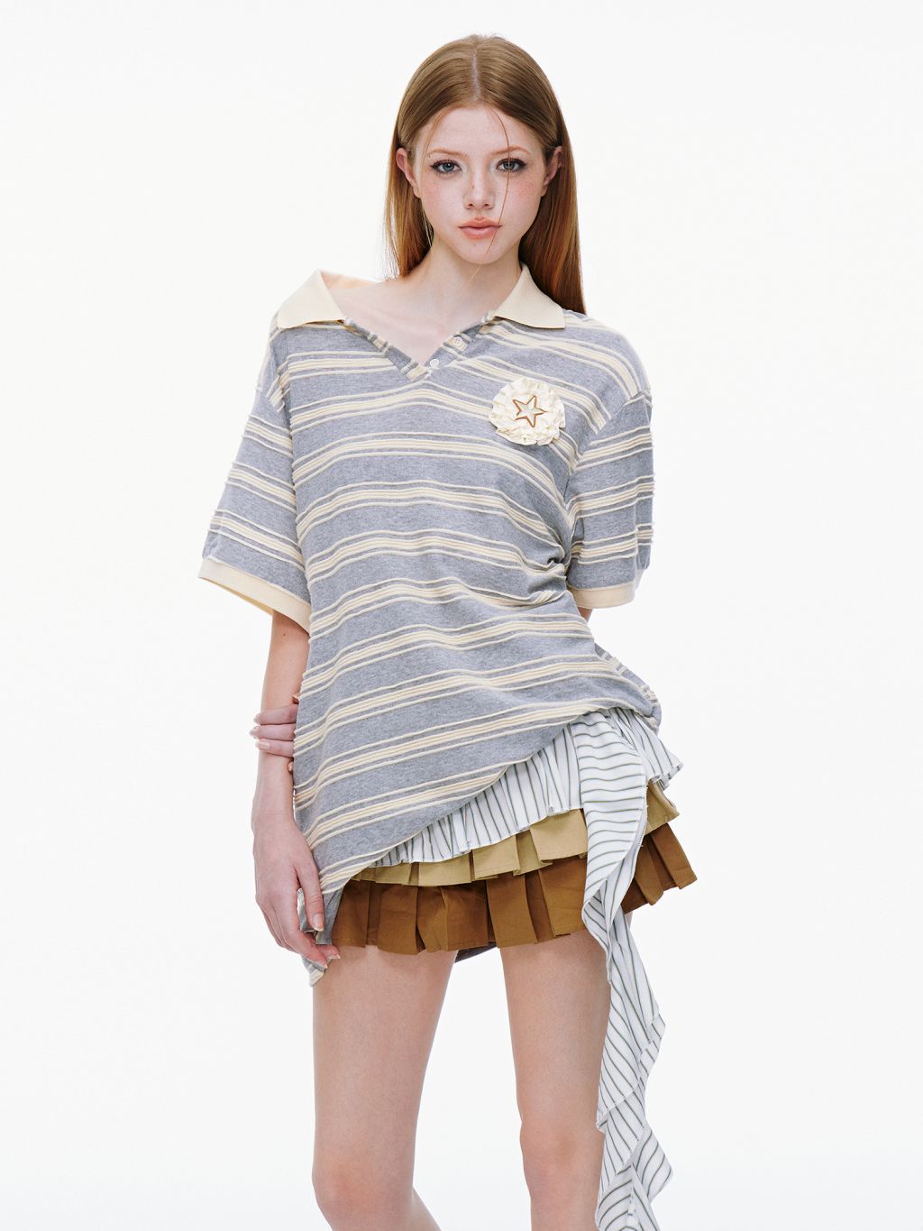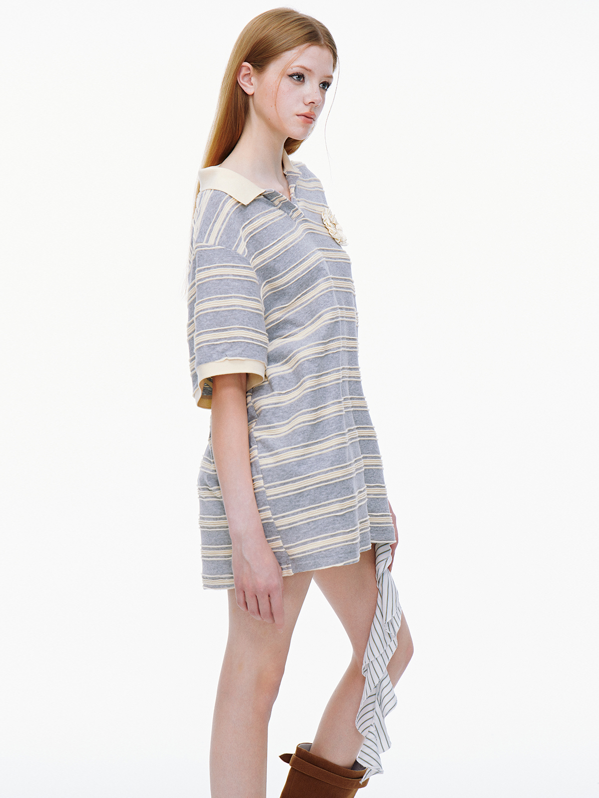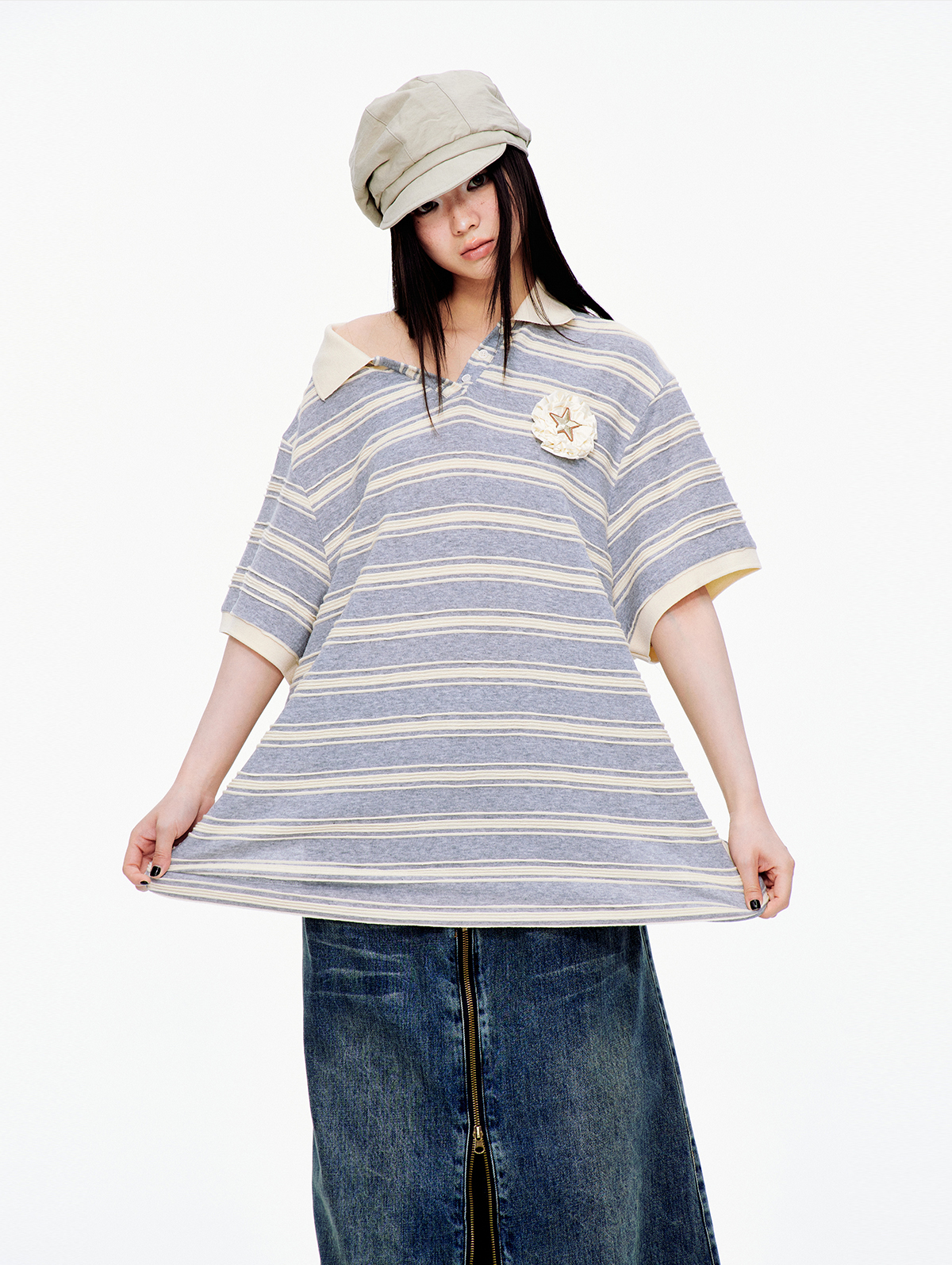 클래식한 스트라이프 패턴과 라운드 넥카라의 루즈핏 티셔츠로 가슴 부분에는 별 모양의 패치와 함께 리본 디테일이 더해져 포인트를 주며 넉넉한 핏과 편안한 착용감으로 일상적인 스타일에 잘 어울리는 아이템