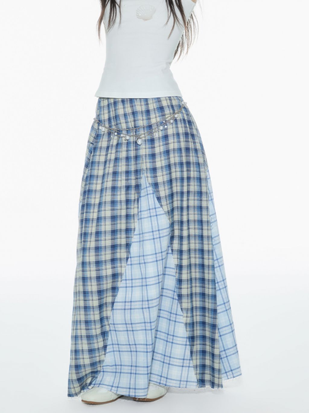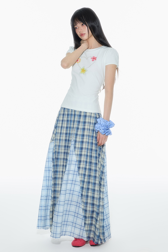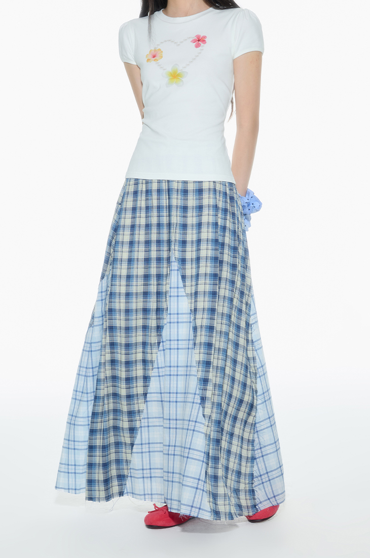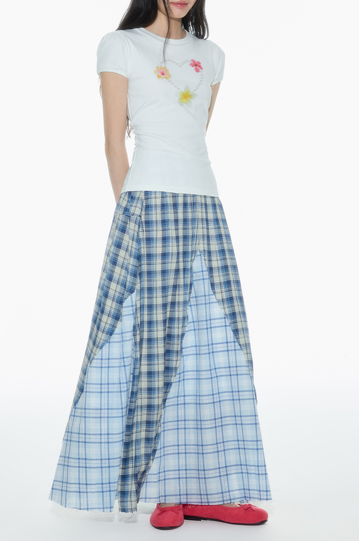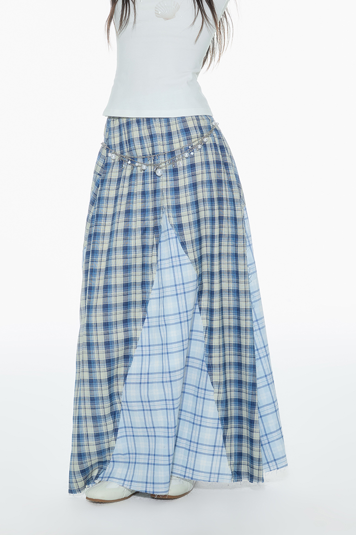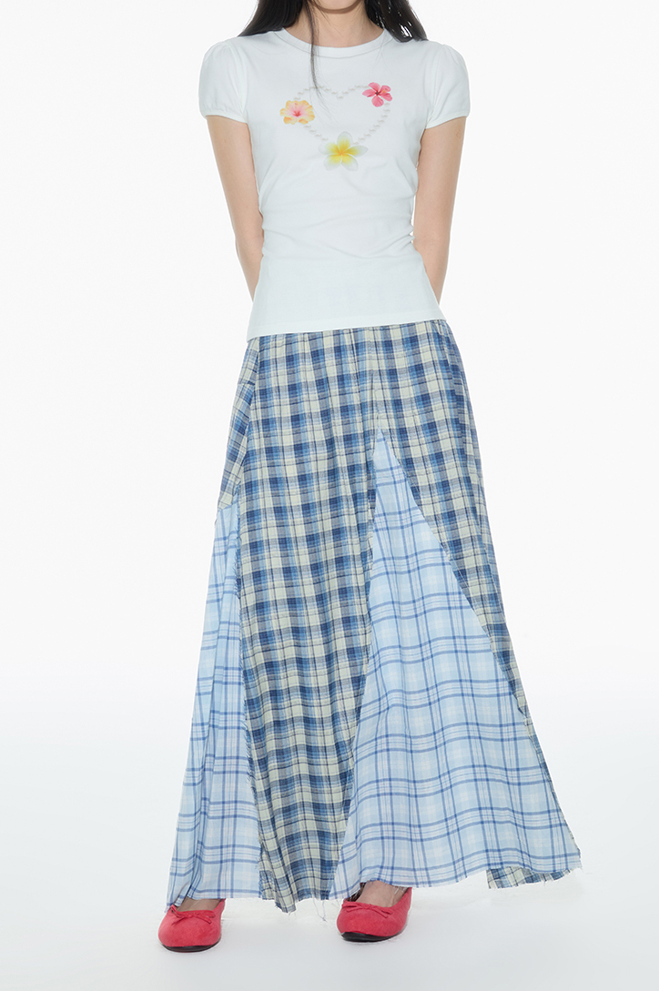 빈티지한 무드의 체크 패턴을 믹스한 롱 스커트로 가볍게 흩날리는 소재로 여름에 시원하게 착용할 수 있으며 걸을 때마다 드러나는 언발 컷팅이 스타일리시한 포인트가 됩니다.