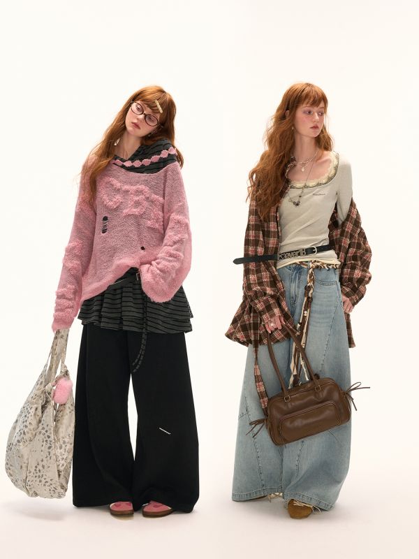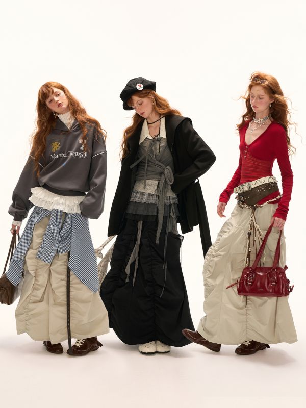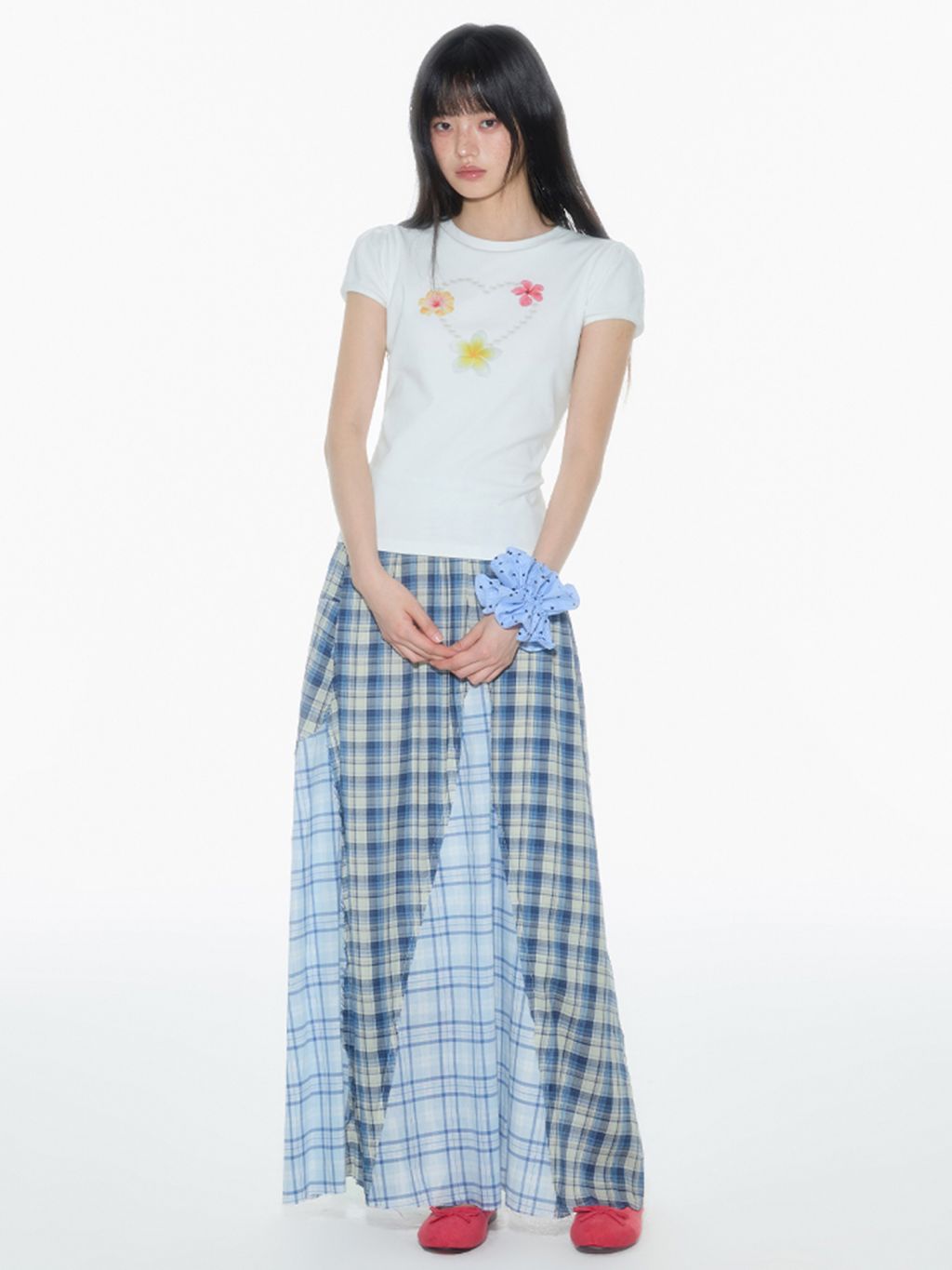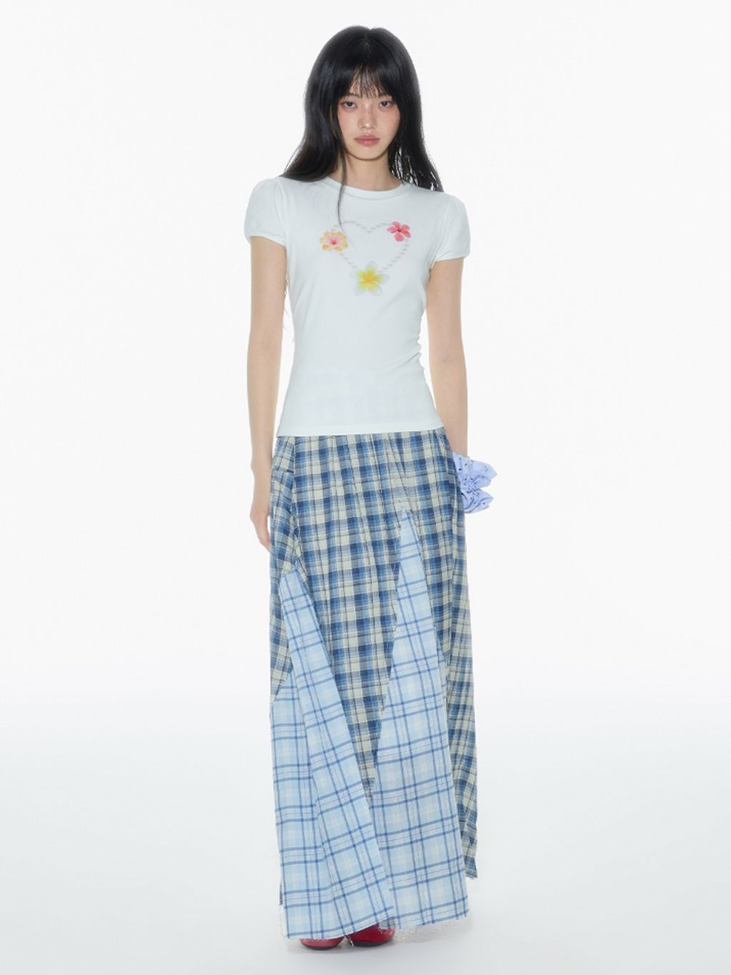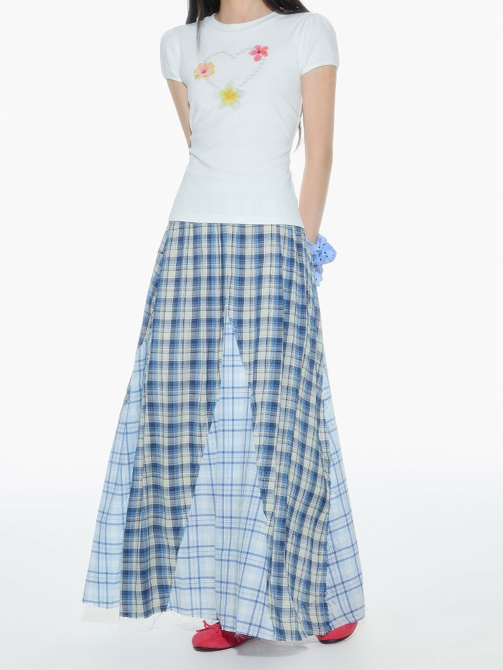 빈티지한 무드의 체크 패턴을 믹스한 롱 스커트로 가볍게 흩날리는 소재로 여름에 시원하게 착용할 수 있으며 걸을 때마다 드러나는 언발 컷팅이 스타일리시한 포인트가 됩니다.