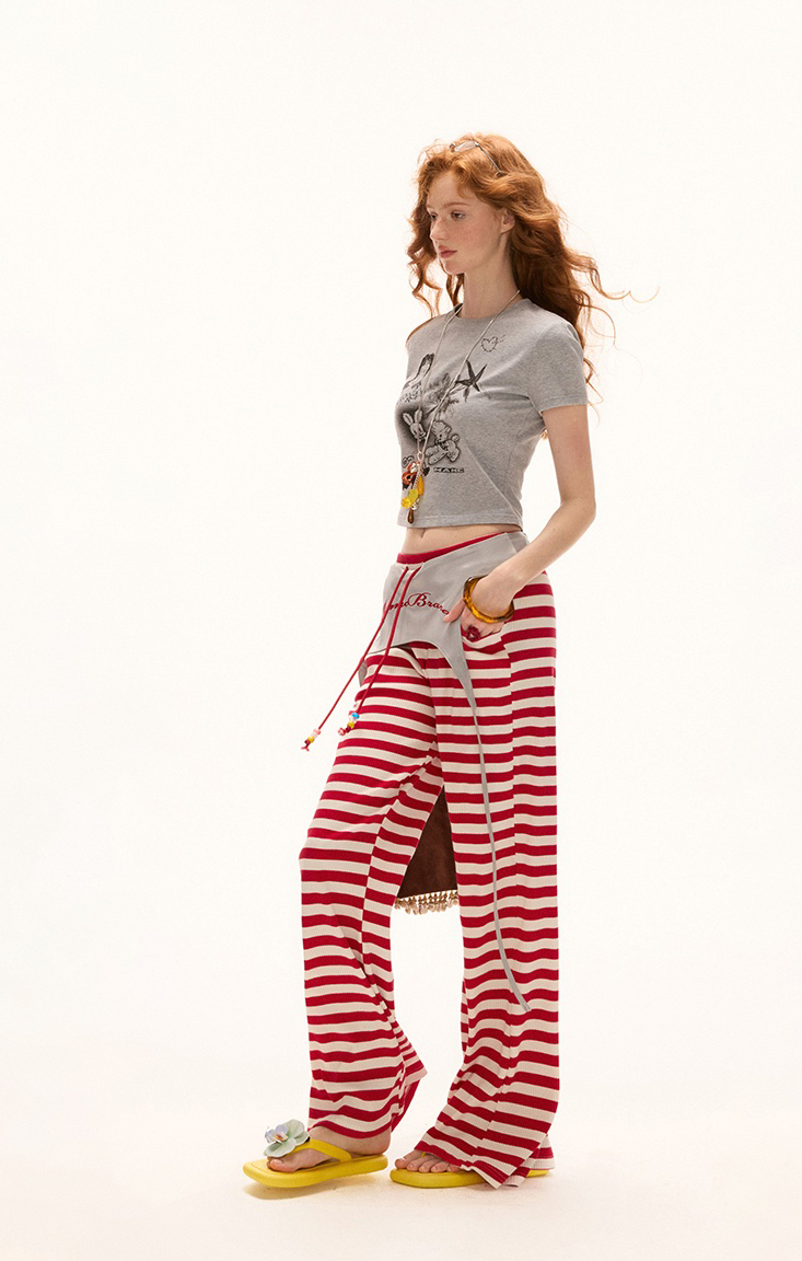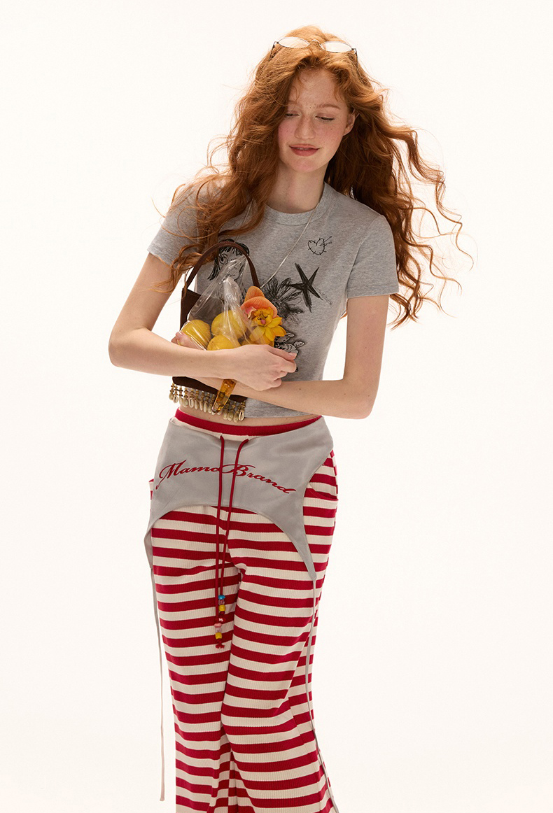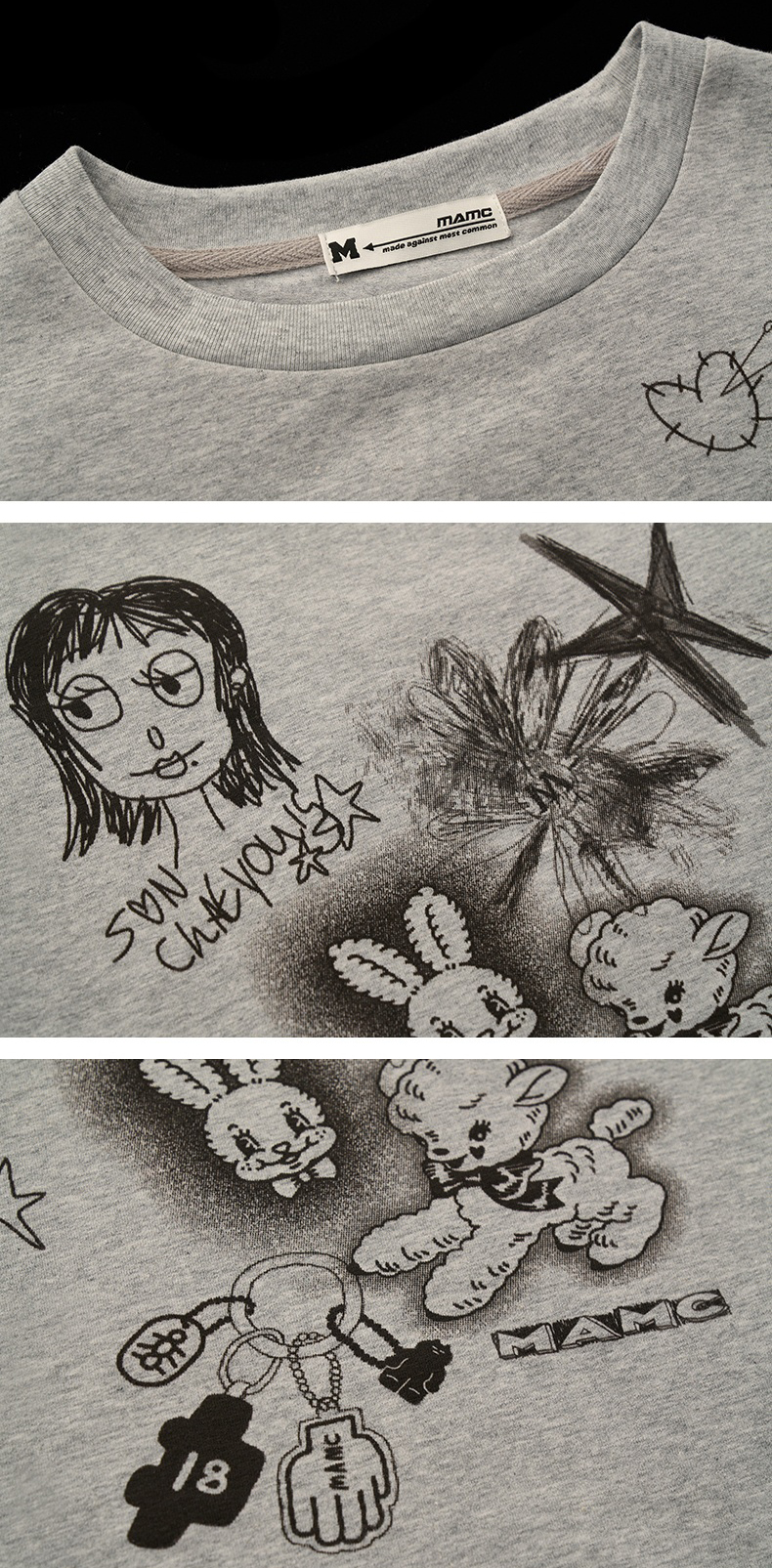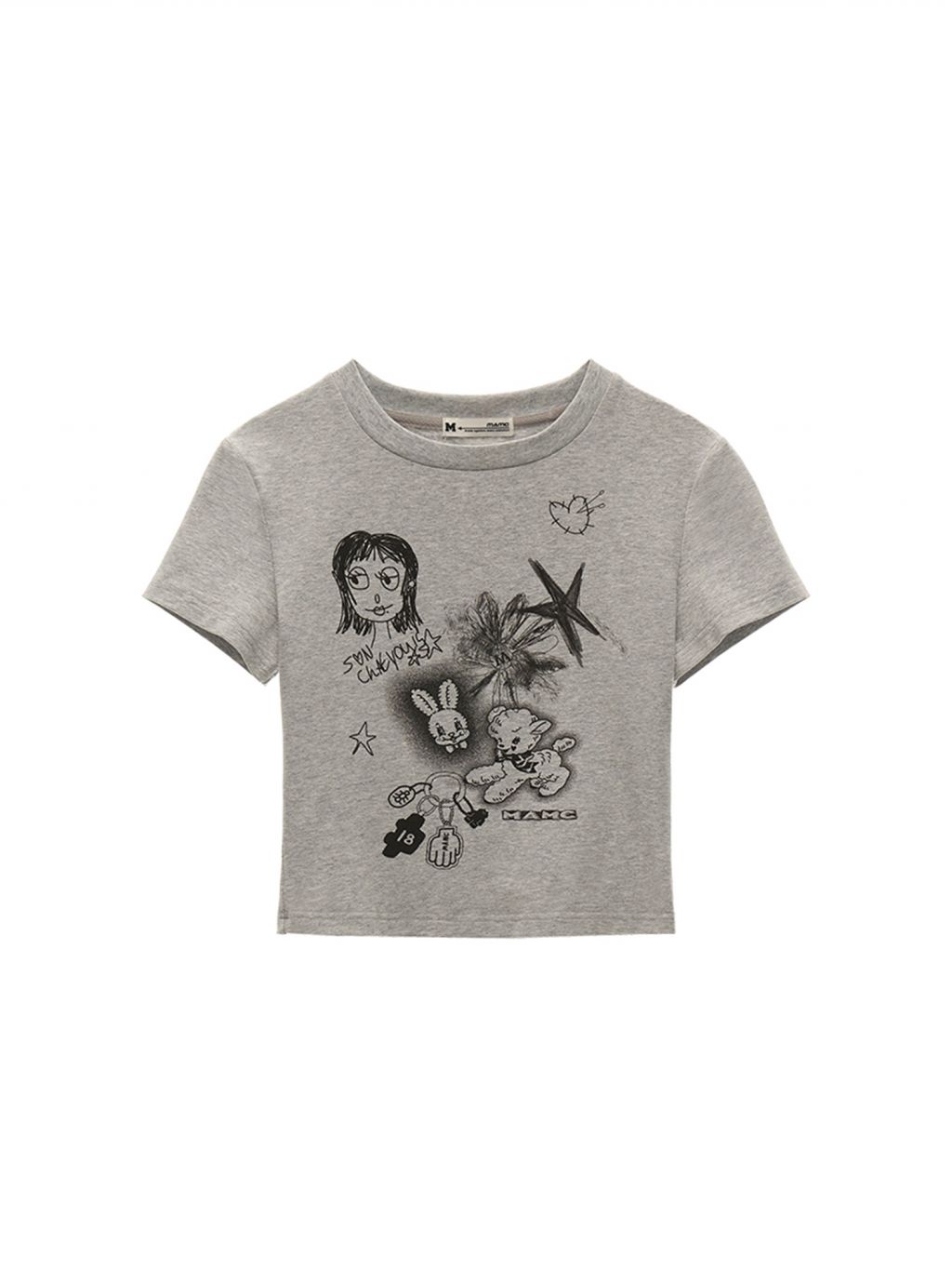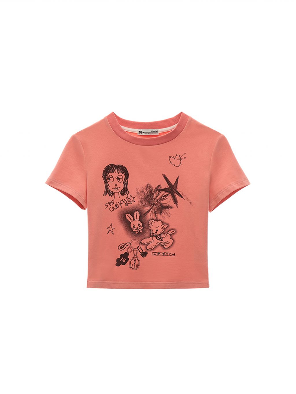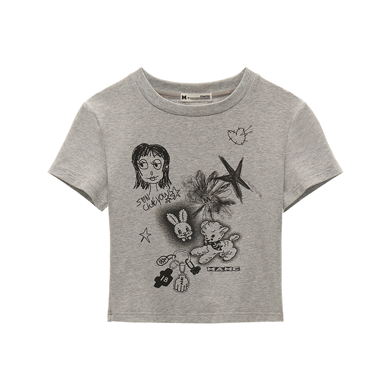 낙서처럼 자유로운 감성을 담은 일러스트 프린트가 유니크한 티셔츠로 크롭 기장감과 슬림한 핏으로 Y2K 무드를 연출하며 귀엽고 키치한 그래픽이 룩에 위트를 더해줍니다.