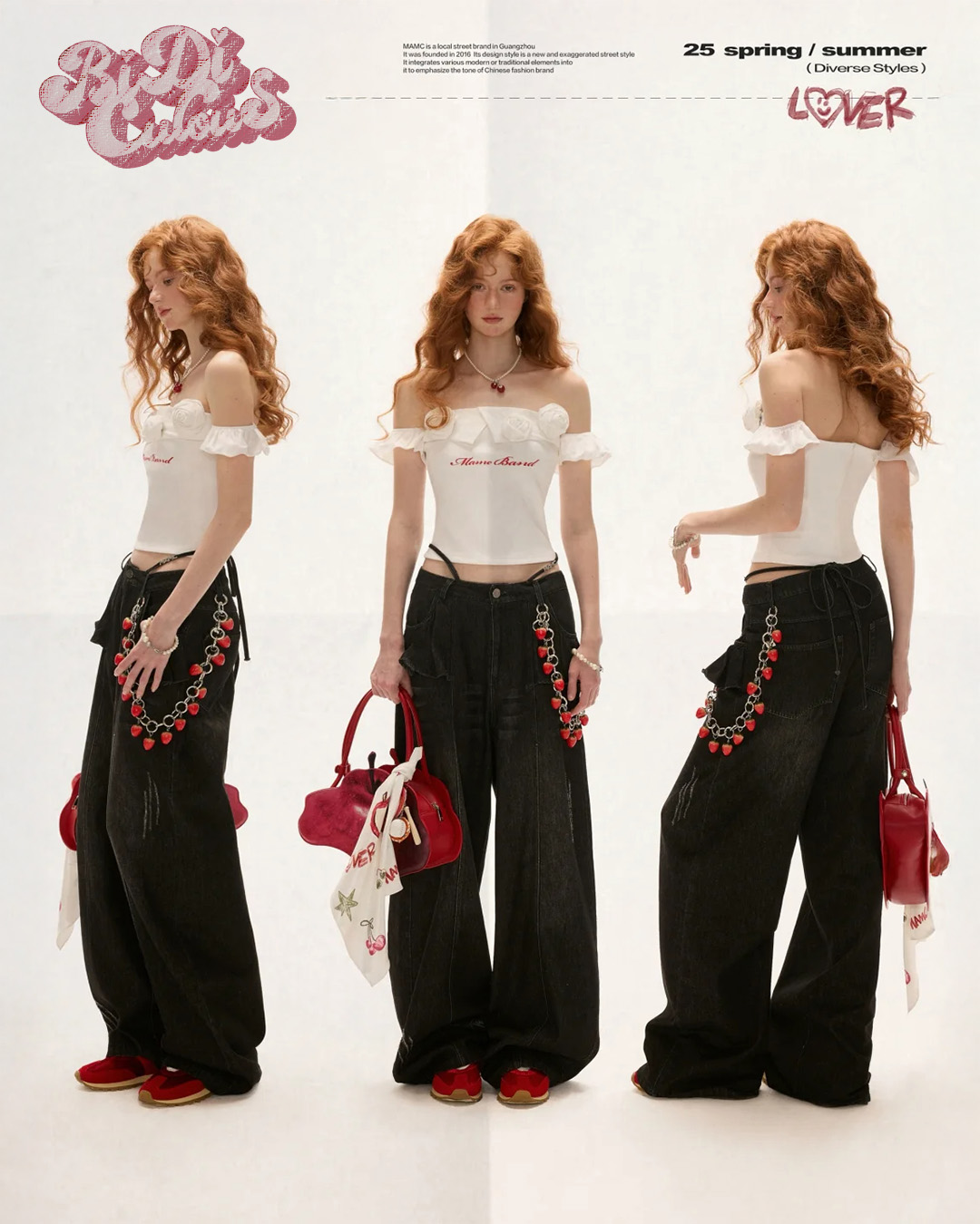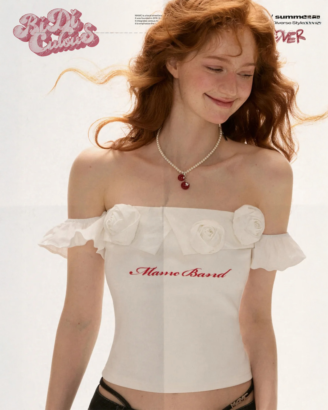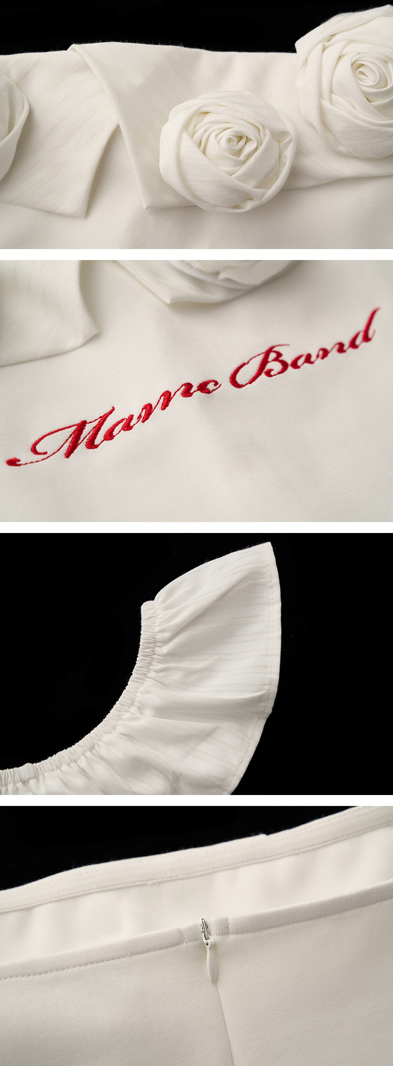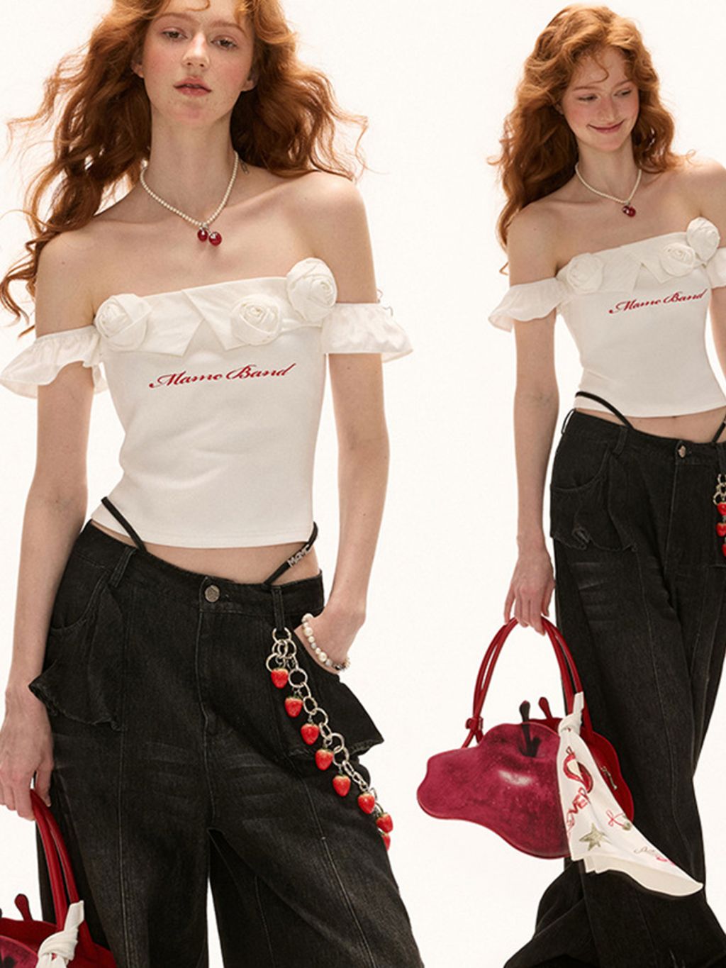 로맨틱한 무드를 극대화한 오프숄더 탑으로 어깨선을 감싸는 프릴과 리얼한 장미 플라워 디테일, 레터링 자수가 어우러져 고급스럽고도 사랑스러운 분위기를 연출하며 바디를 자연스럽게 감싸는 슬림핏으로 데님이나 롱스커트에 매치해 페미닌한 스타일링을 완성할 수 있습니다.