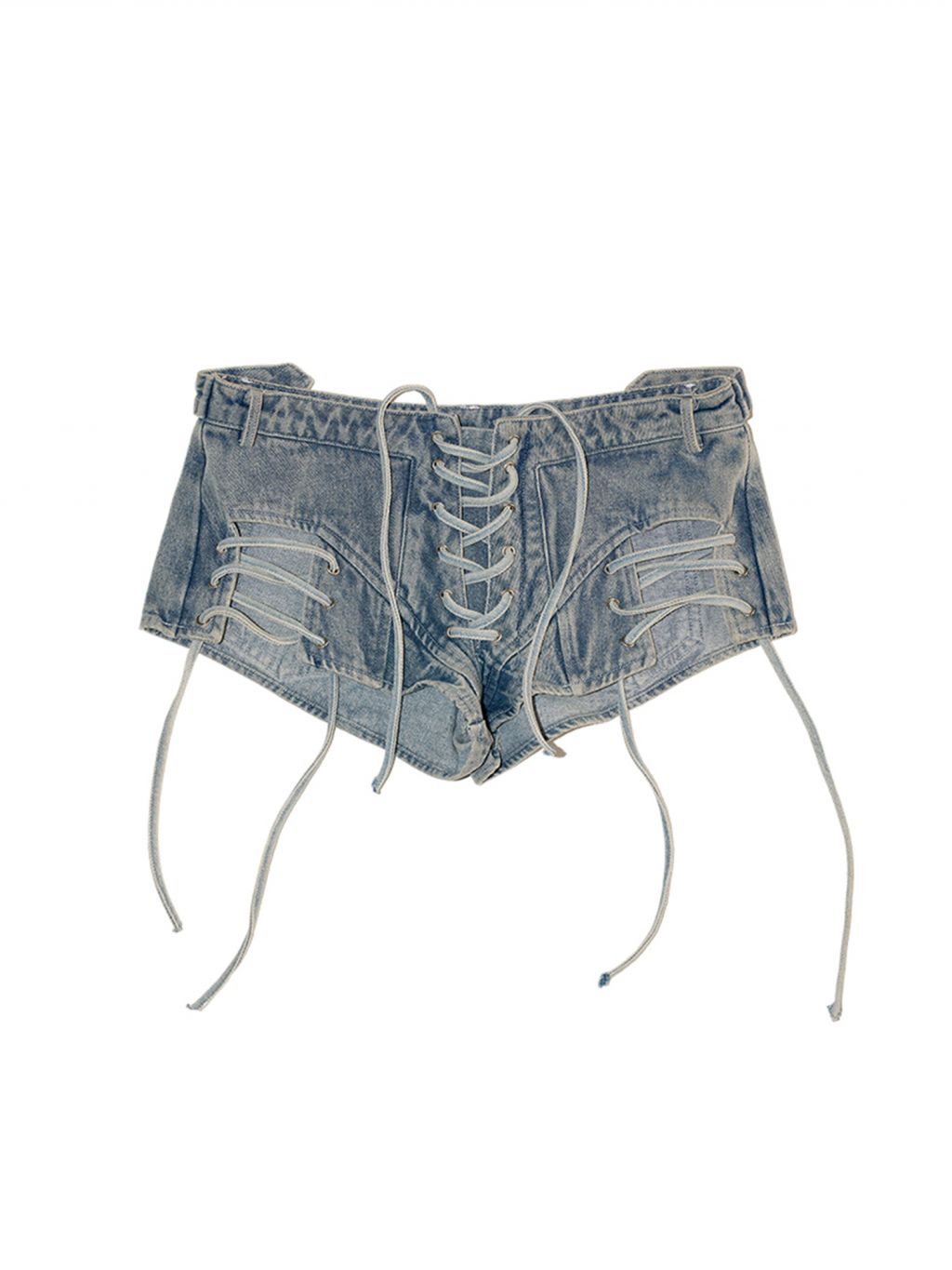 과감한 레이스업 디테일과 컷아웃 디자인이 돋보이는 Y2K 감성의 데님 쇼츠로 양쪽 허벅지에 배치된 스트랩과 사이드 오픈 디테일이 시선을 사로잡으며 빈티지한 워싱으로 트렌디한 분위기를 더했습니다.