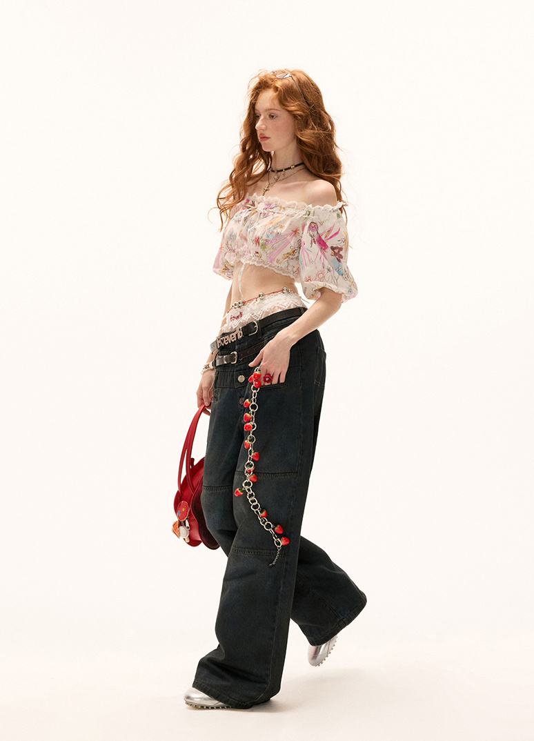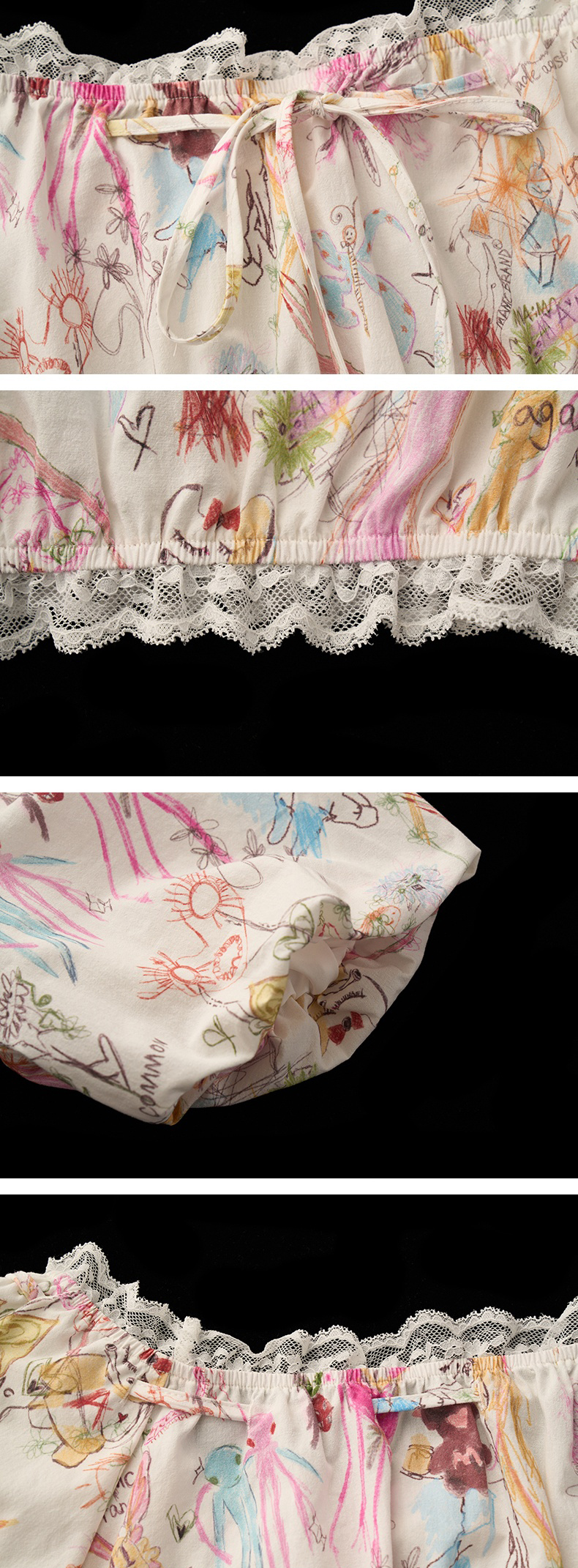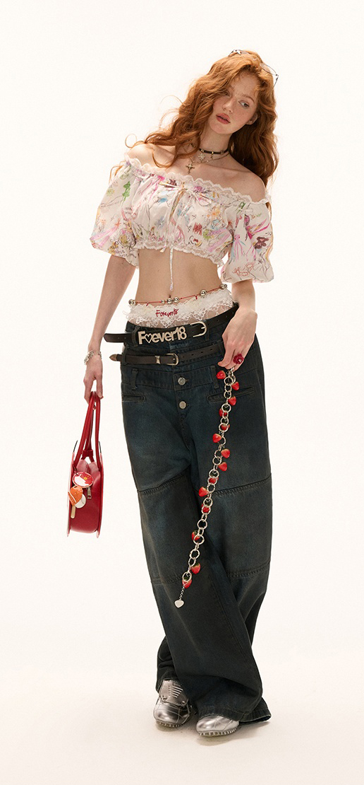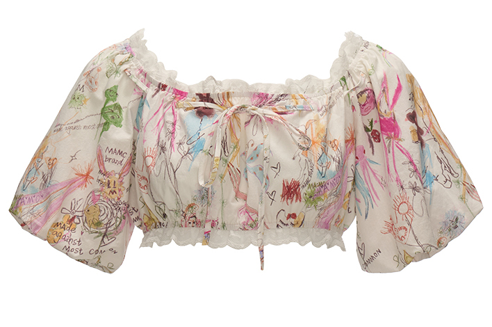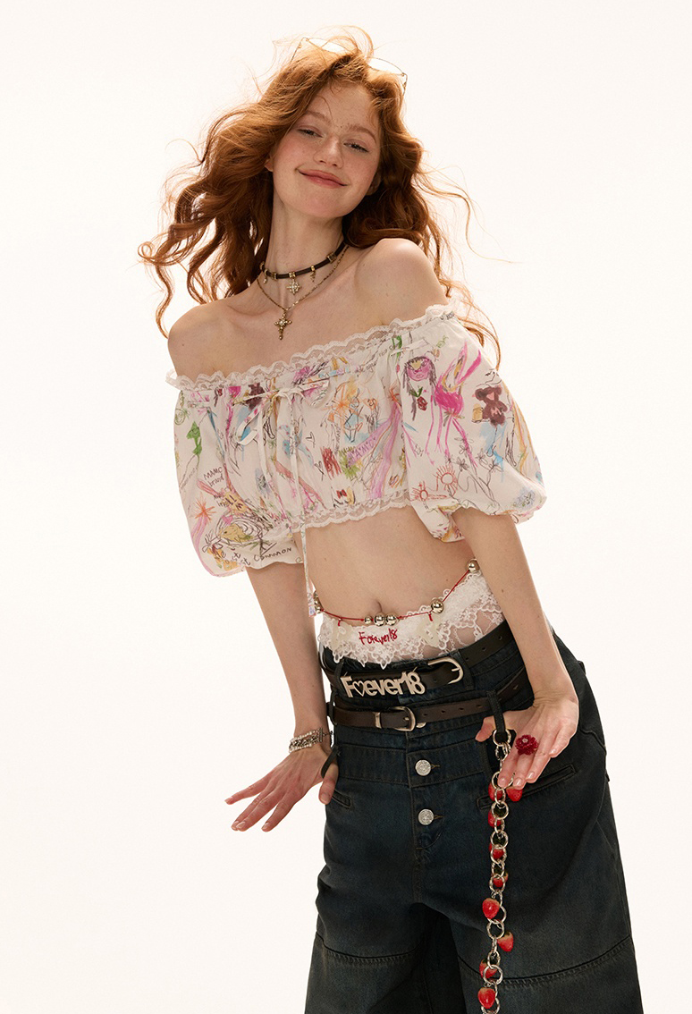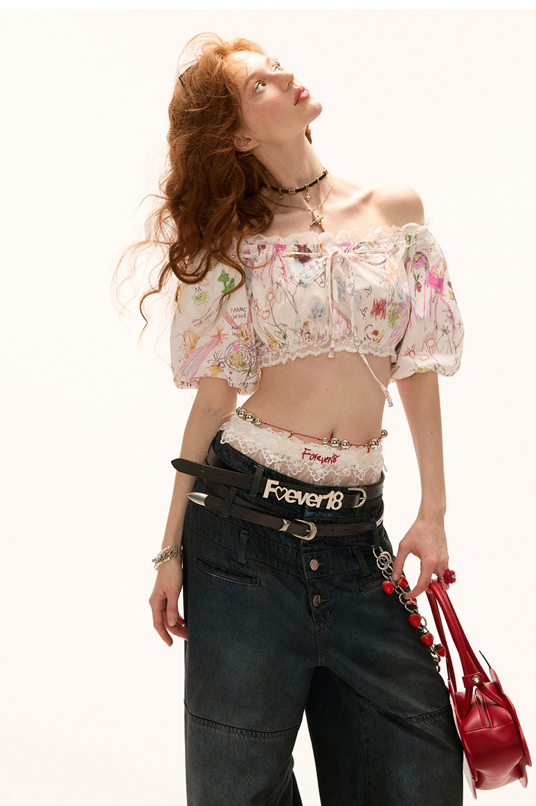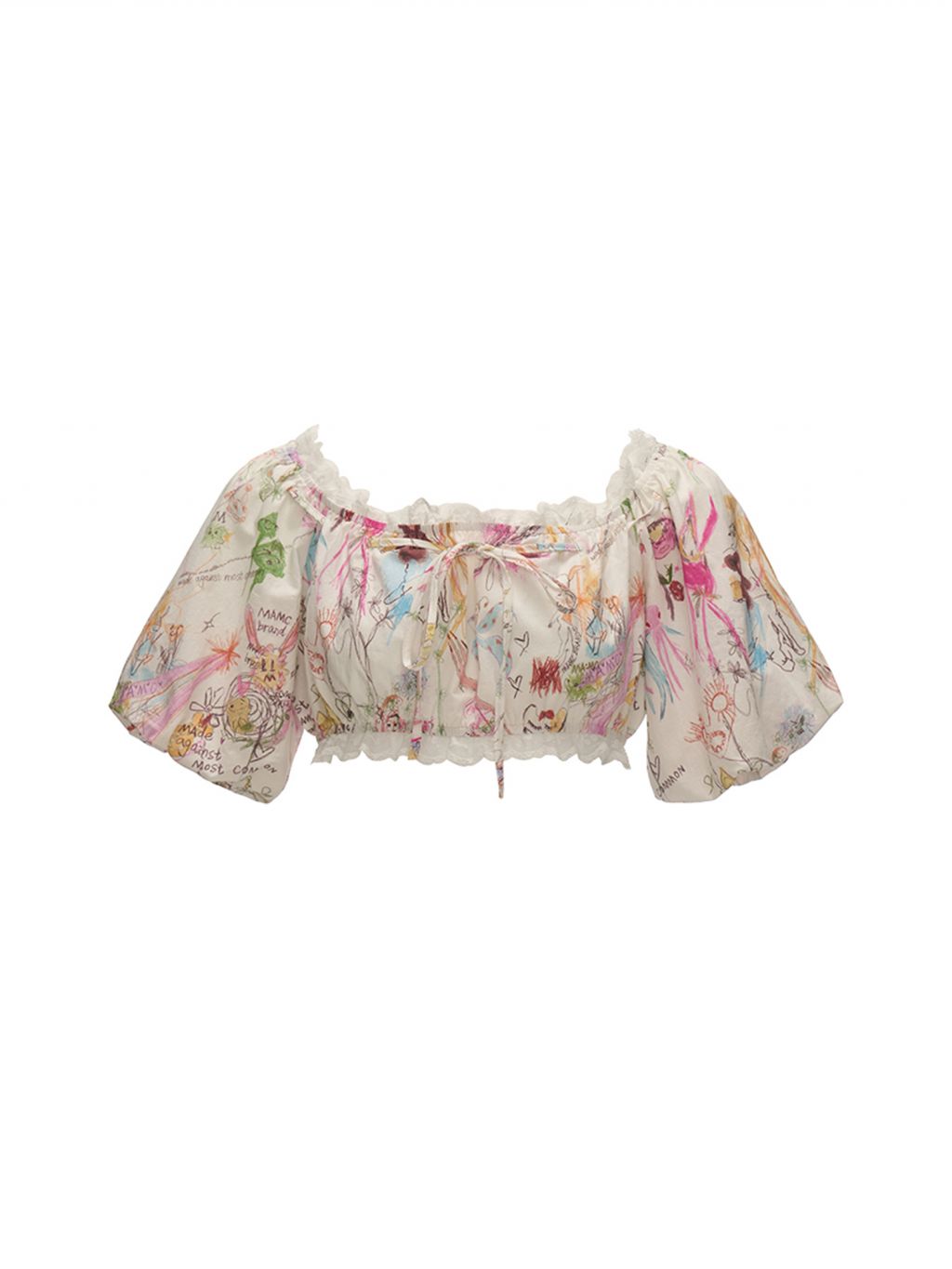 동화 속에서 튀어나온 듯한 낙서 그래픽과 풍성한 퍼프 소매가 어우러진 크롭 오프숄더 블라우스로 빈티지하면서도 키치한 무드를 담아내며 러플과 리본 디테일로 사랑스러움을 더했습니다.