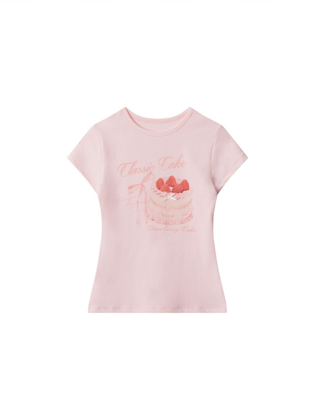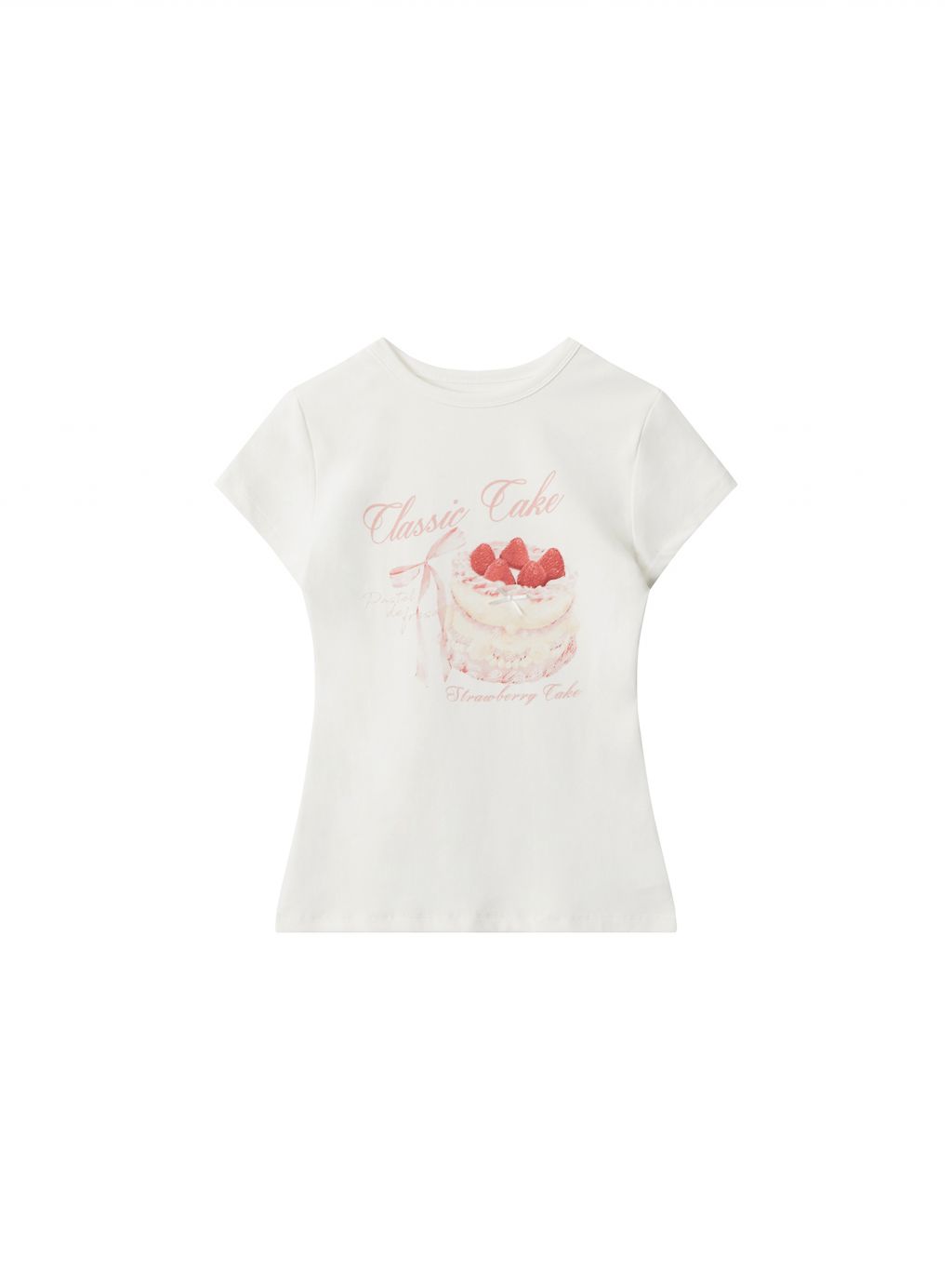 - 전면 스트로베리 케이크 일러스트와 ‘Classic Cake’ 레터링이 프린트된 키치한 그래픽