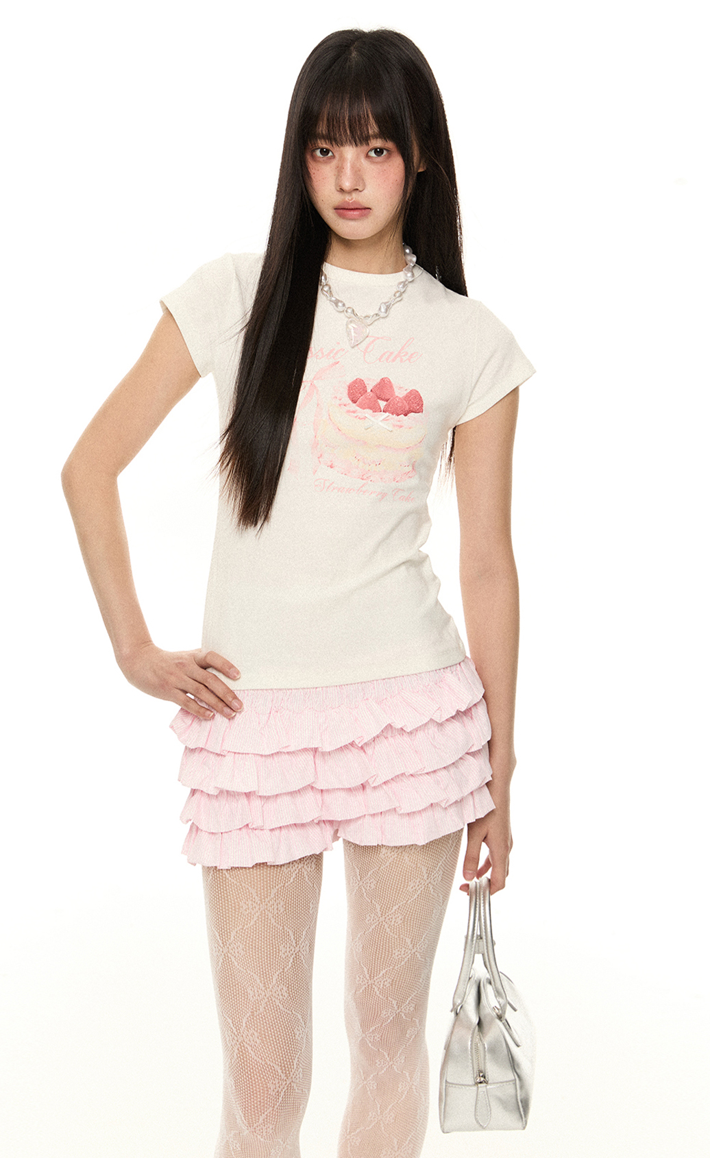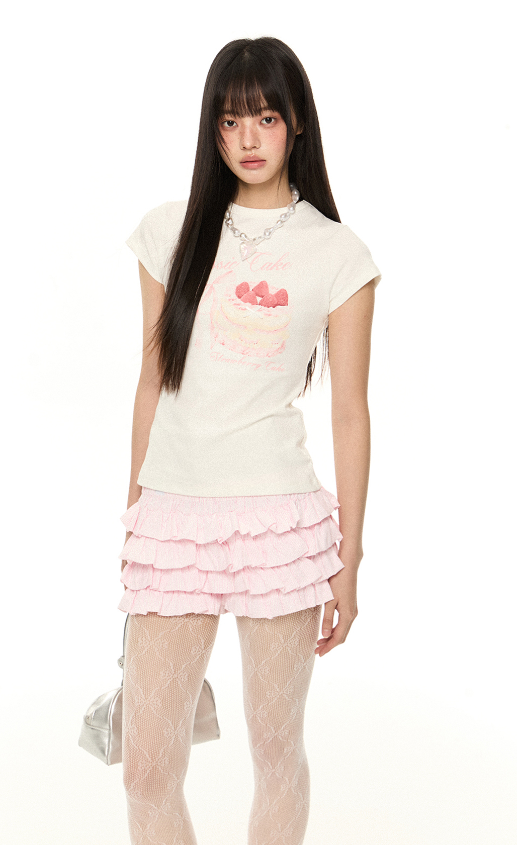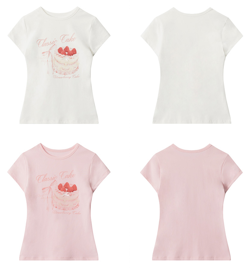 딸기 케이크처럼 사랑스러운 무드가 가득한 반팔 티셔츠로 레트로 감성의 프린팅과 은은한 파스텔 컬러 조합이 키치하면서도 빈티지한 하이틴 룩을 완성해주는 포인트 아이템입니다.