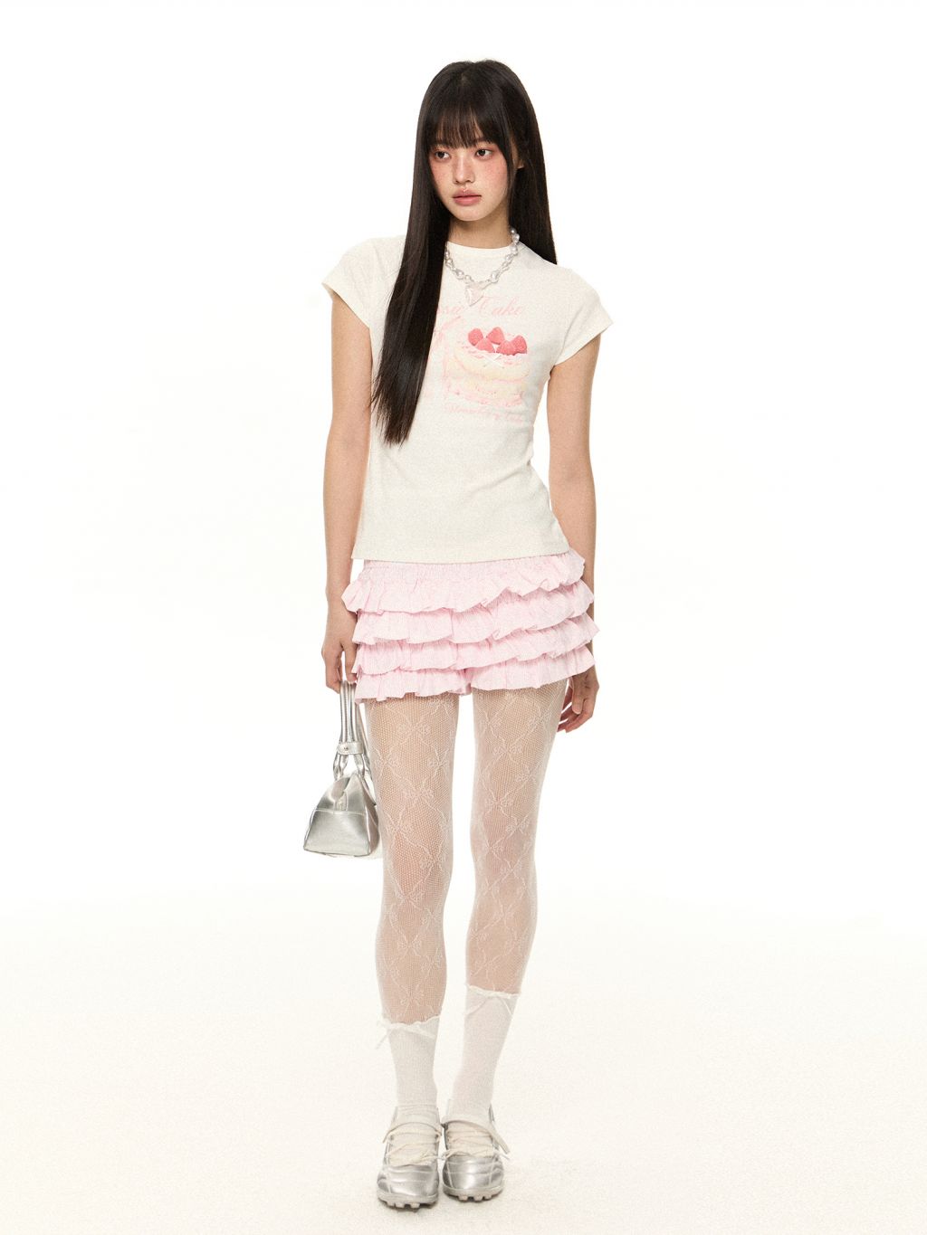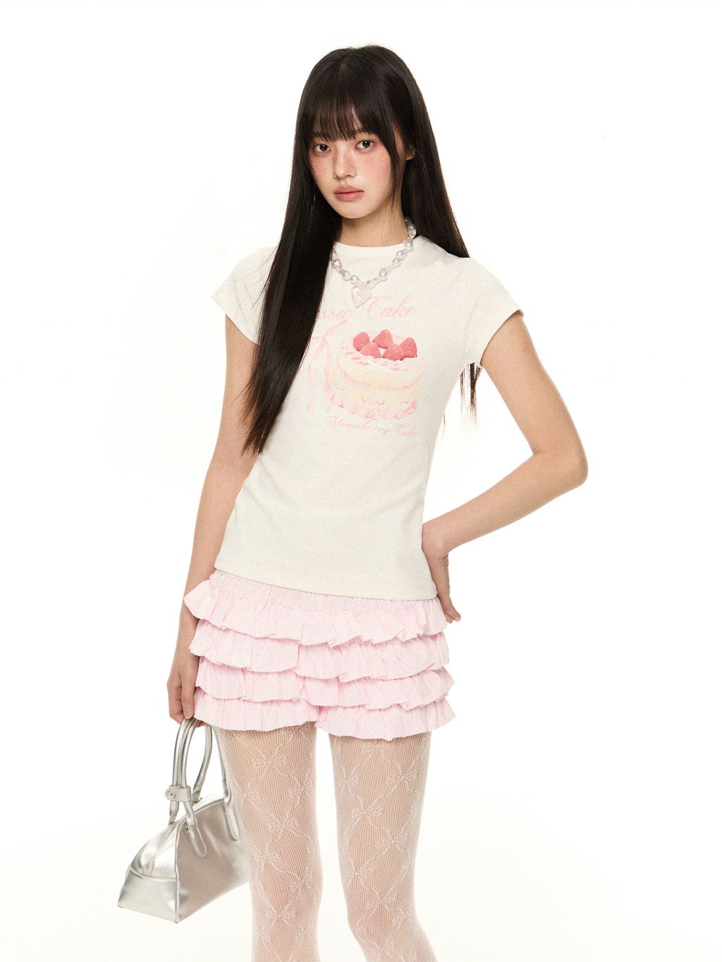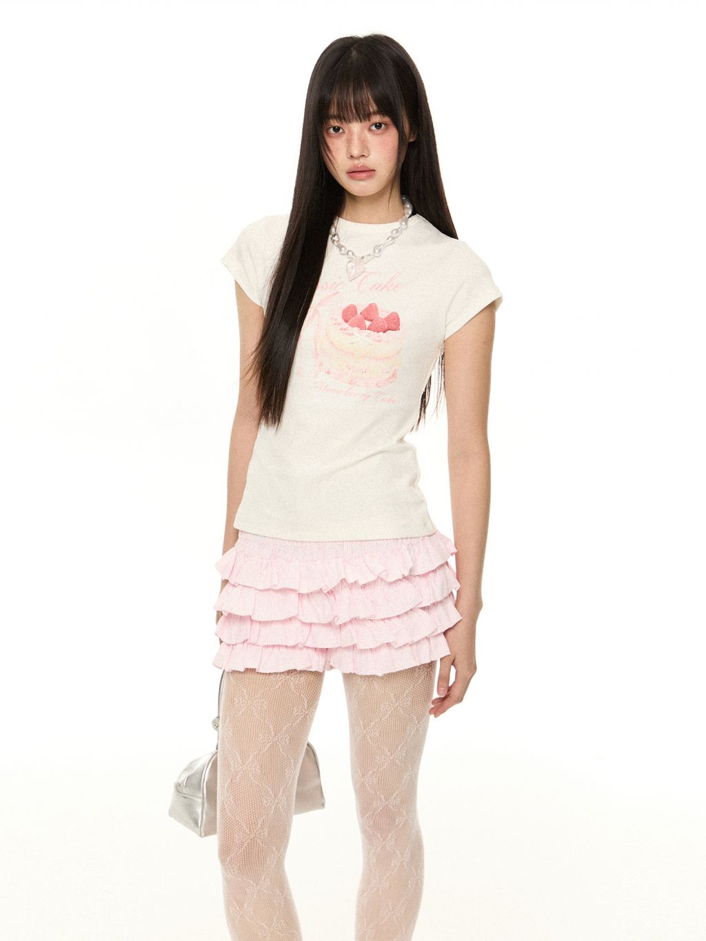 딸기 케이크처럼 사랑스러운 무드가 가득한 반팔 티셔츠로 레트로 감성의 프린팅과 은은한 파스텔 컬러 조합이 키치하면서도 빈티지한 하이틴 룩을 완성해주는 포인트 아이템입니다.