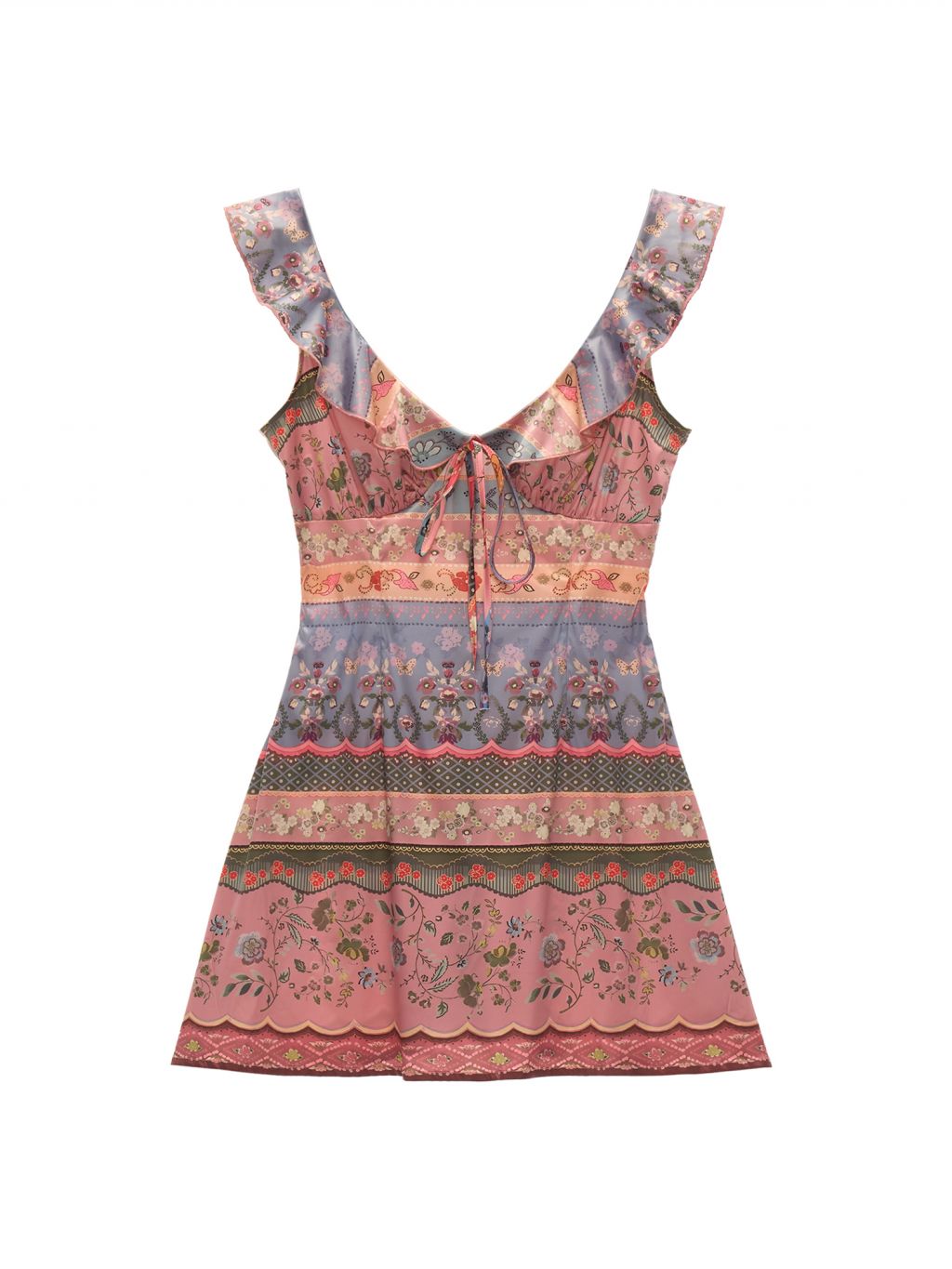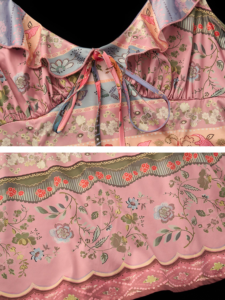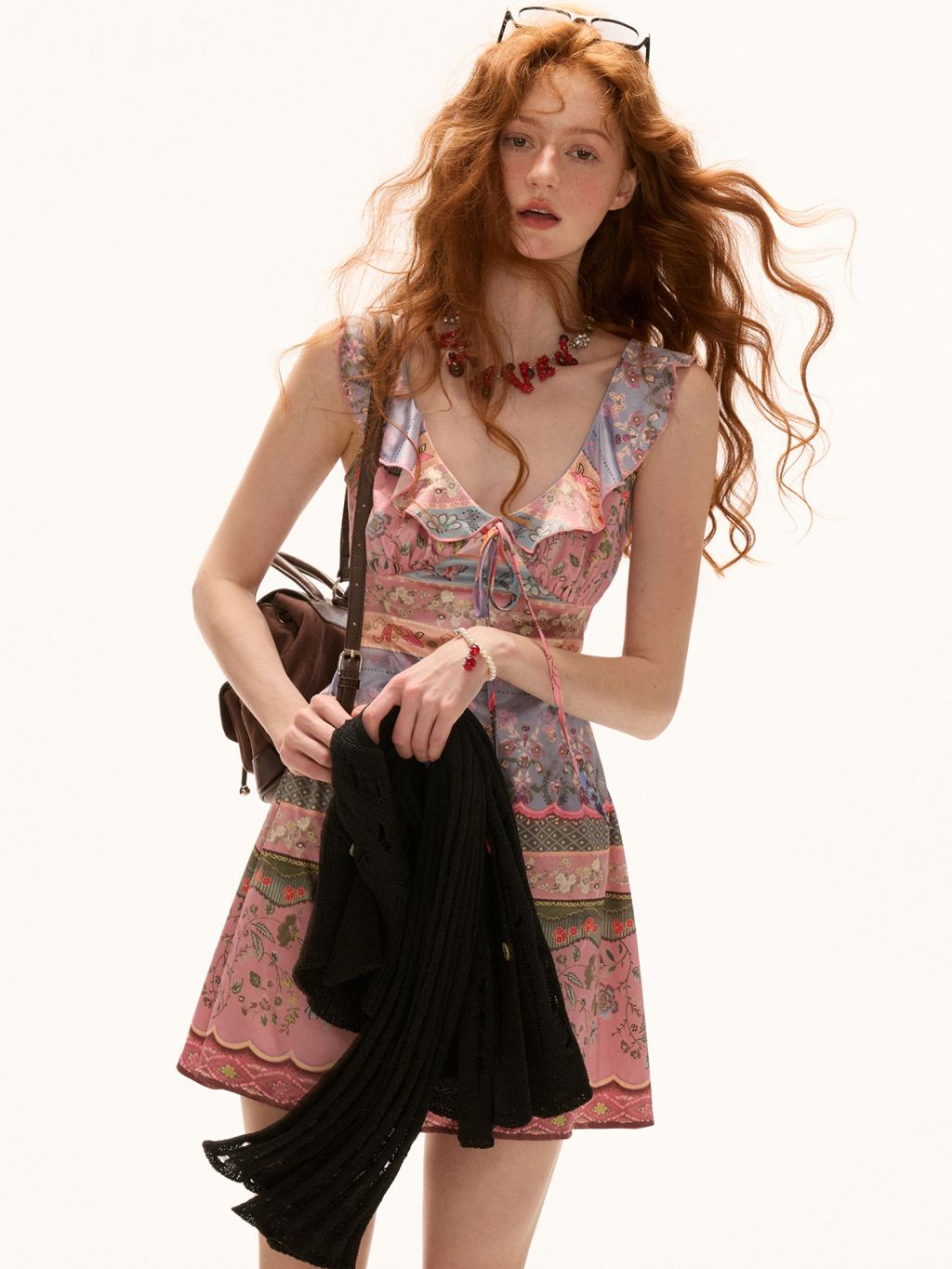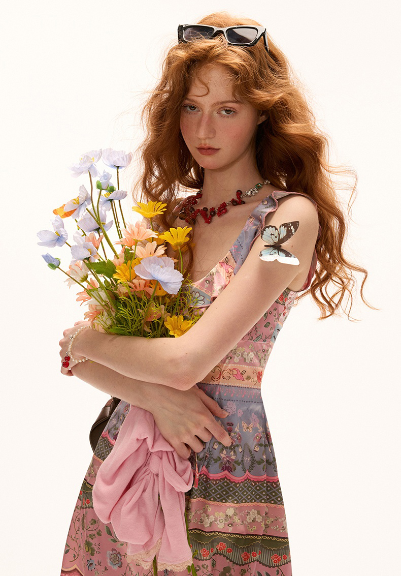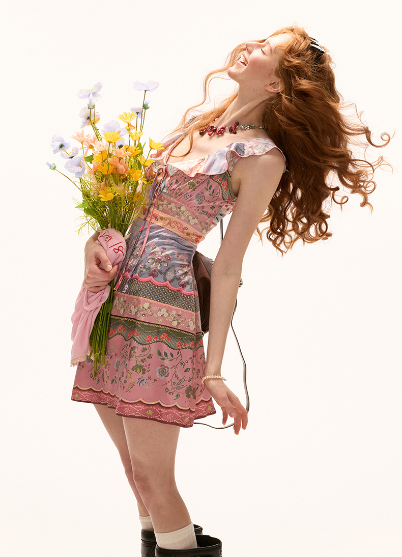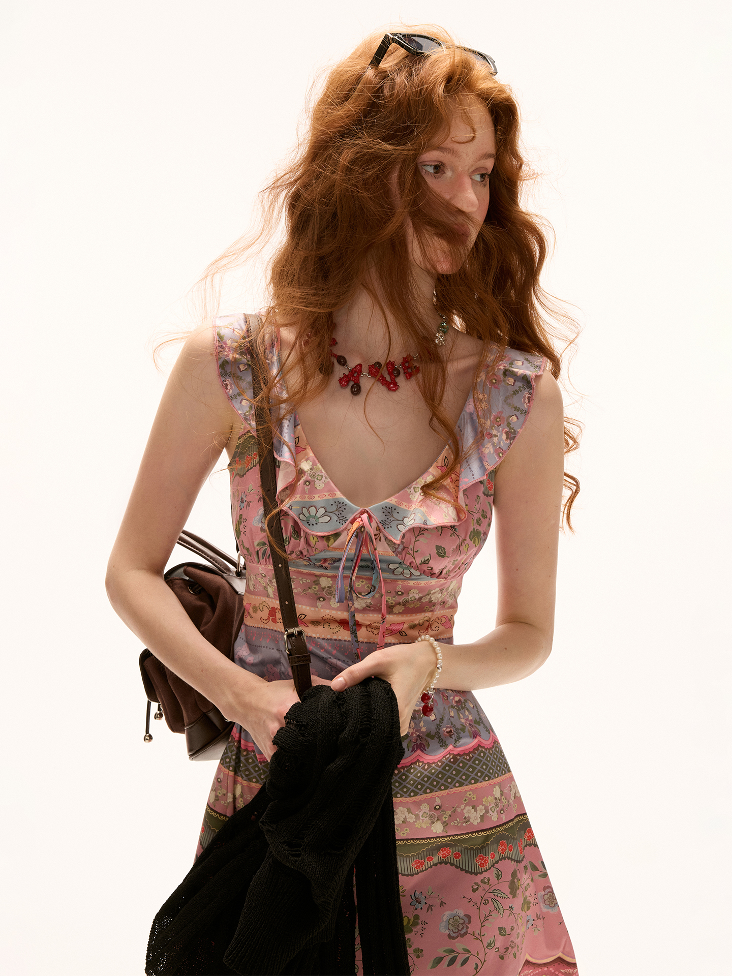 레트로 감성과 보헤미안 무드가 어우러진 빈티지 플로럴 드레스로 다채로운 플라워 패턴과 톤온톤의 배색이 레트로한 감성을 자아내며 깊게 파인 넥라인과 러플 디테일 그리고 프론트 스트링으로 사랑스럽고도 페미닌한 무드를 극대화해줍니다. 가벼운 소재와 A라인 실루엣이 만들어내는 자연스러운 드레이프는 걸을 때마다 흐르는 듯한 실루엣이 포인트가 됩니다.