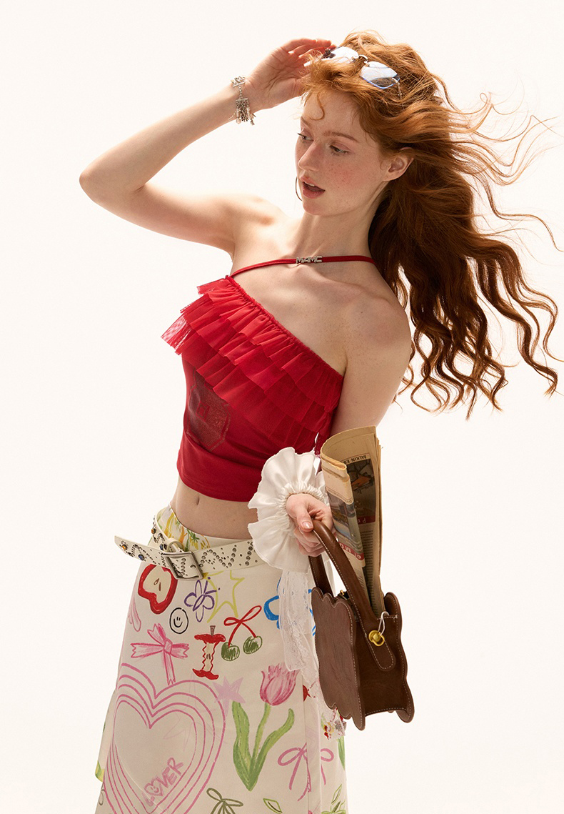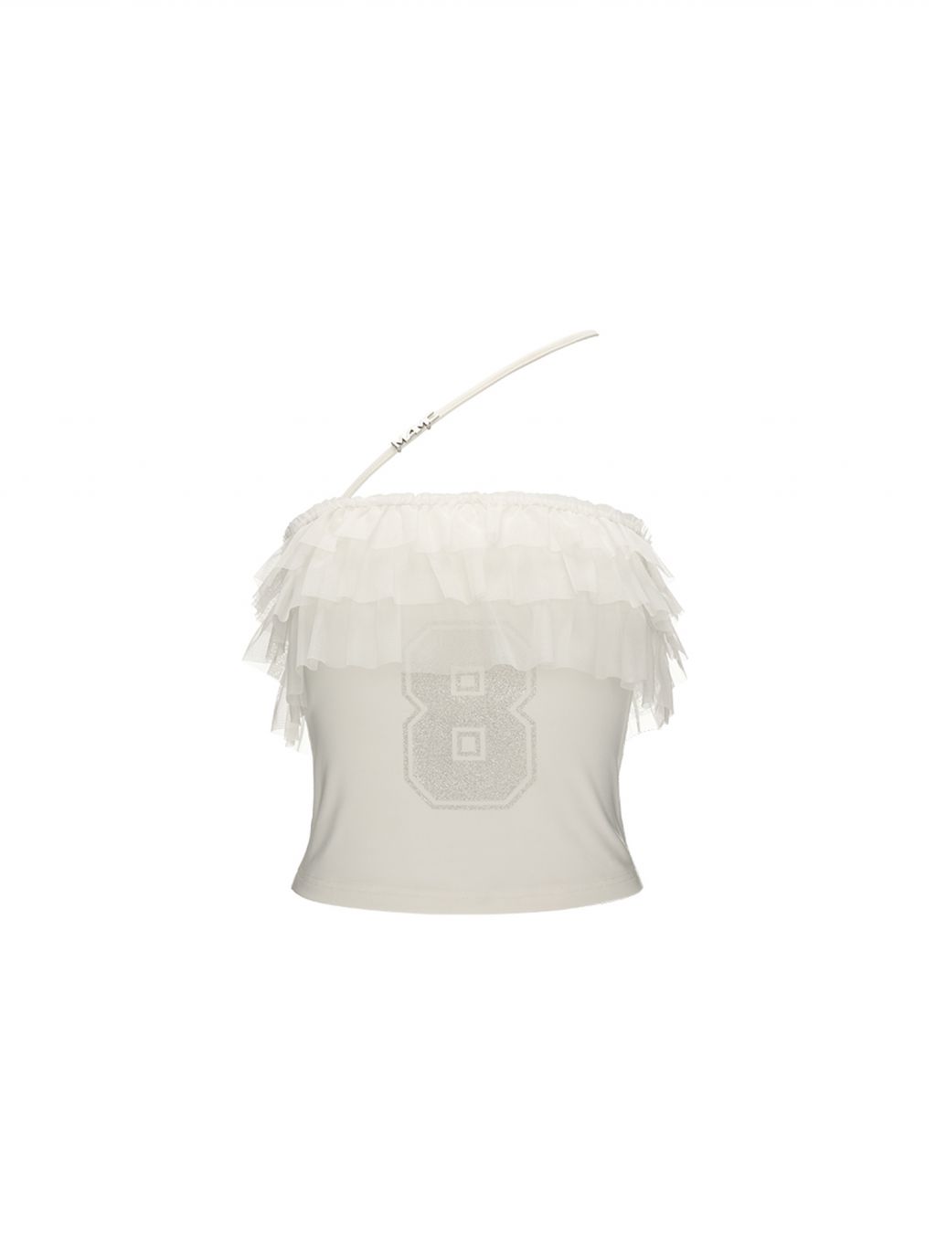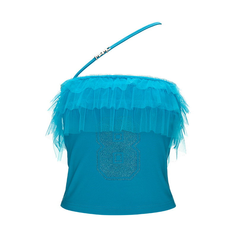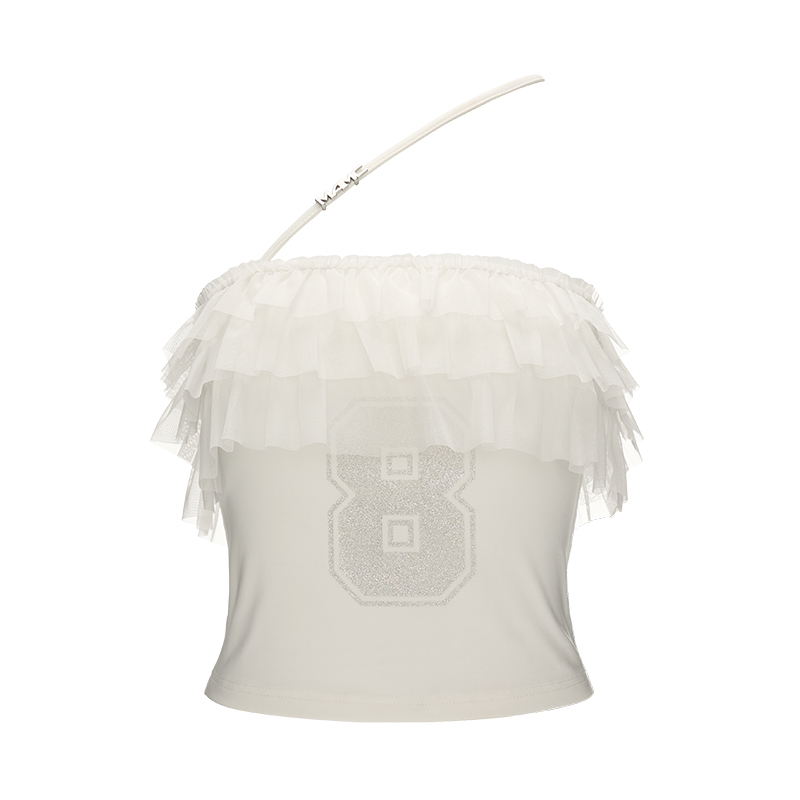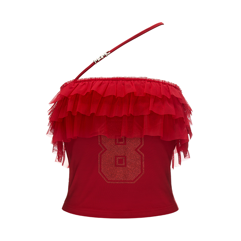 걸리시함과 스트리트 무드를 동시에 담은 레이스 프릴 튜브탑으로 풍성한 프릴이 바스트를 감싸 러블리한 실루엣을 만들고 한쪽에만 더해진 얇은 스트랩이 유니크한 포인트를 더합니다. 전면의 숫자 그래픽은 키치한 매력을 강조해 러블리하게도, 힙하게도 연출 가능한 여름 시즌 포인트 탑입니다.