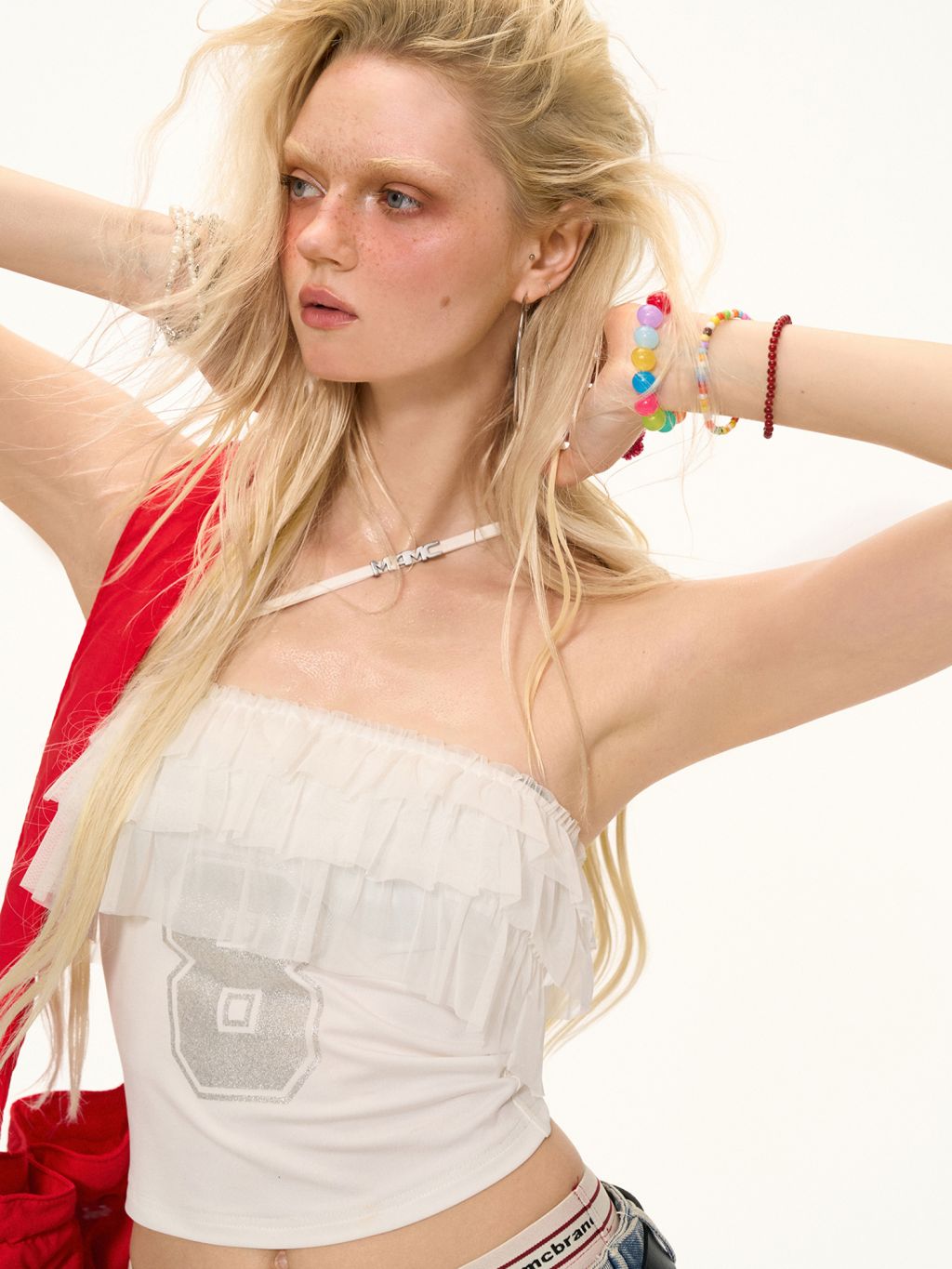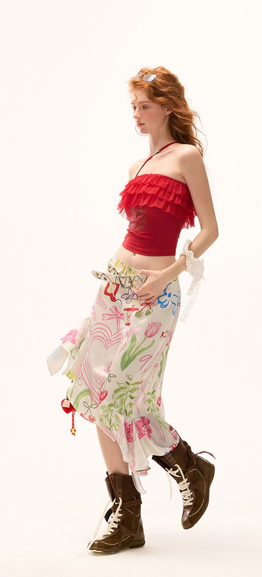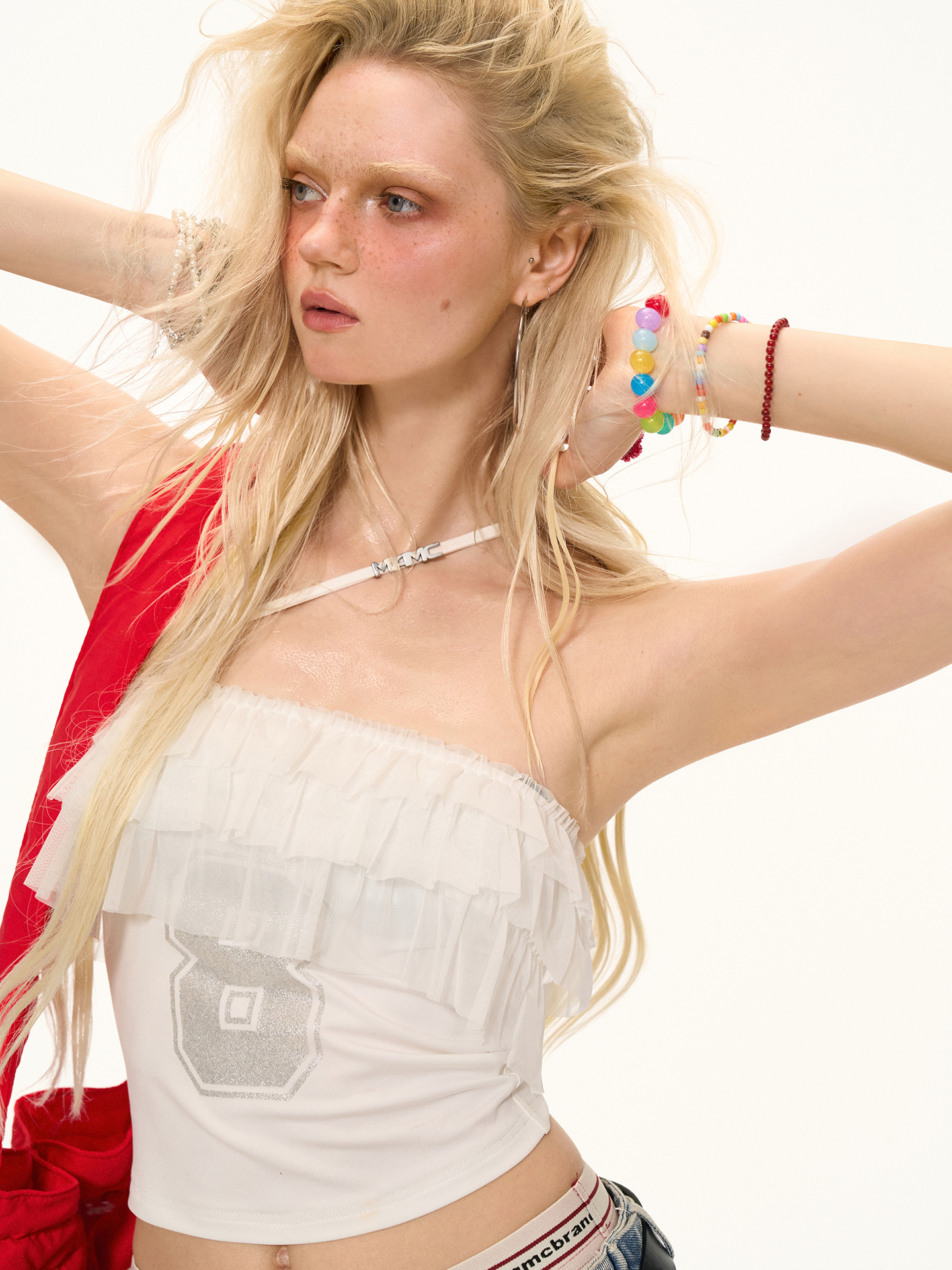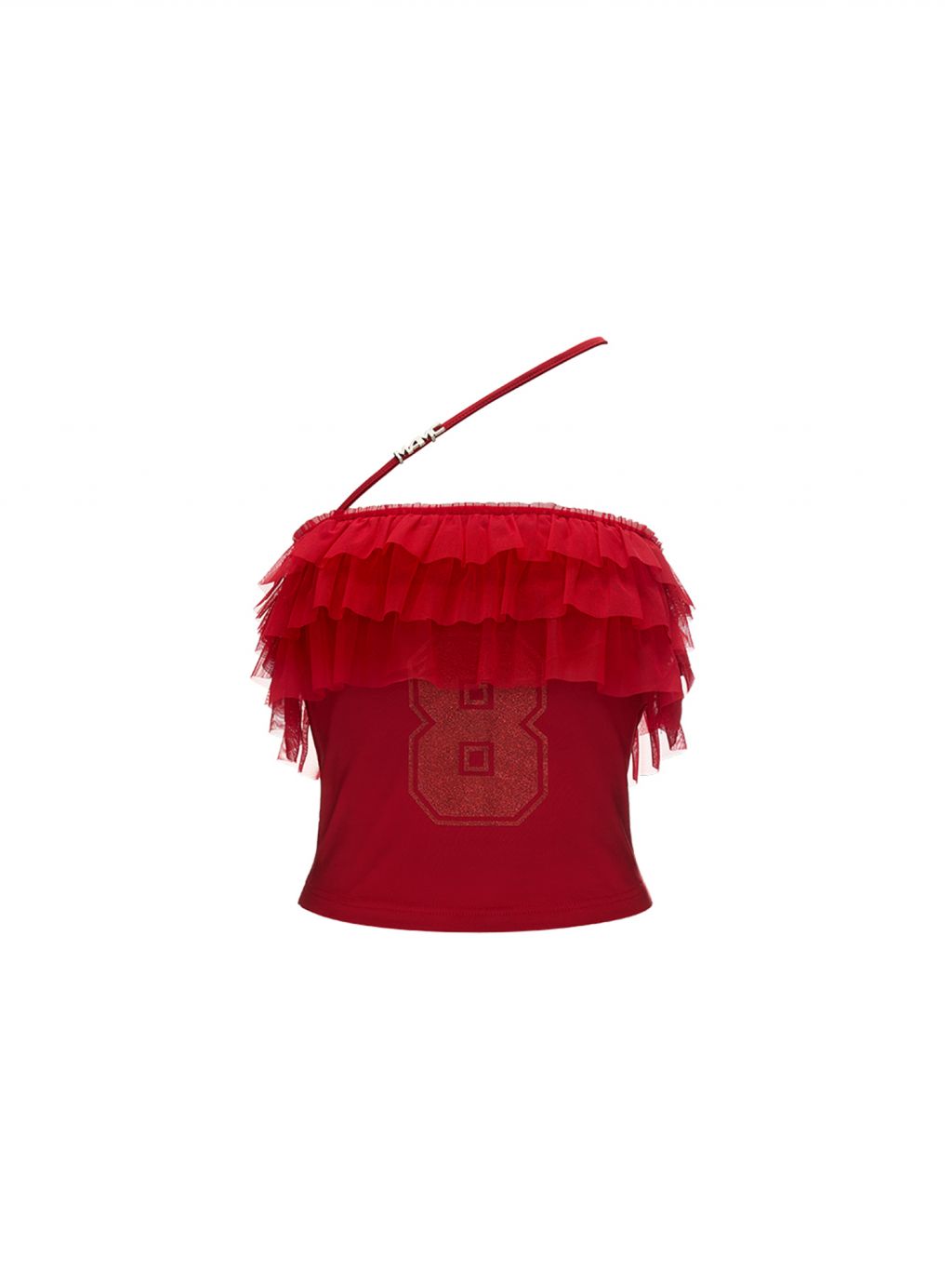걸리시함과 스트리트 무드를 동시에 담은 레이스 프릴 튜브탑으로 풍성한 프릴이 바스트를 감싸 러블리한 실루엣을 만들고 한쪽에만 더해진 얇은 스트랩이 유니크한 포인트를 더합니다. 전면의 숫자 그래픽은 키치한 매력을 강조해 러블리하게도, 힙하게도 연출 가능한 여름 시즌 포인트 탑입니다.