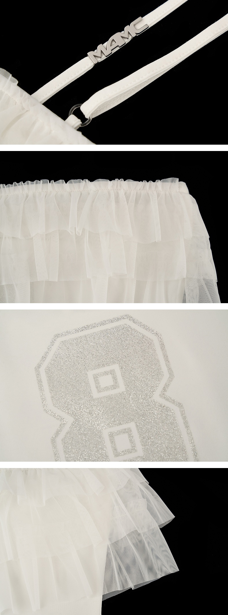- 숫자 '8'을 중심으로 한 스팽글 스타일 프린트가 키치하면서도 스포티한 무드