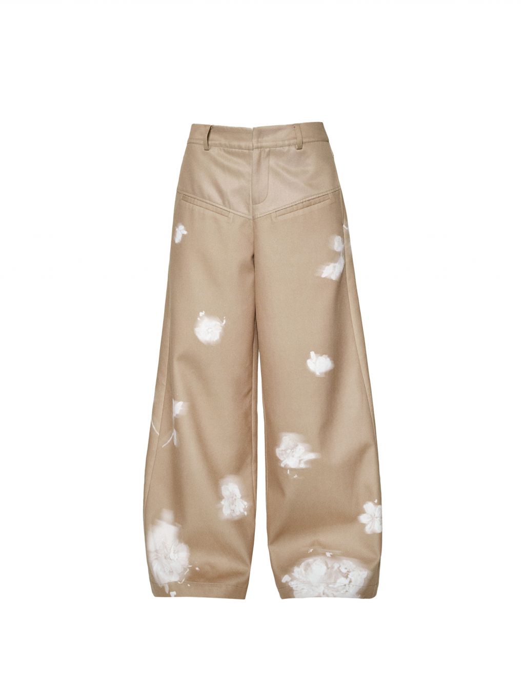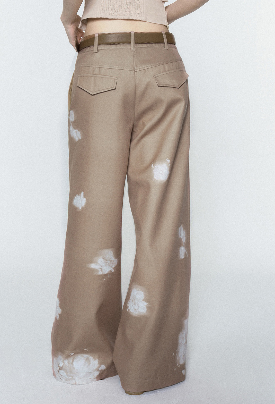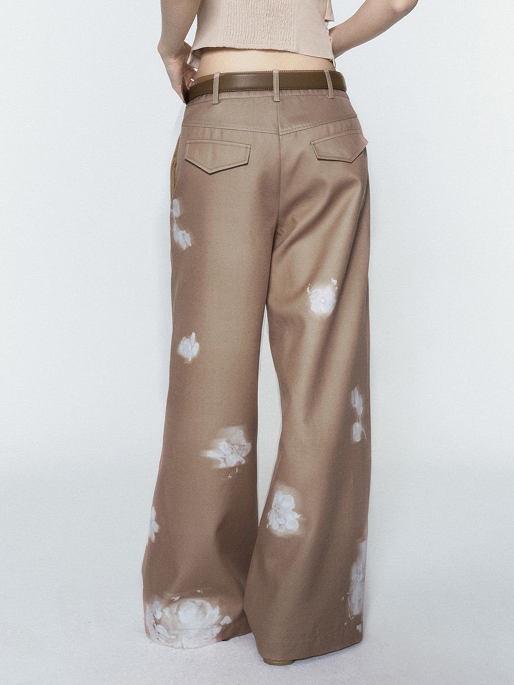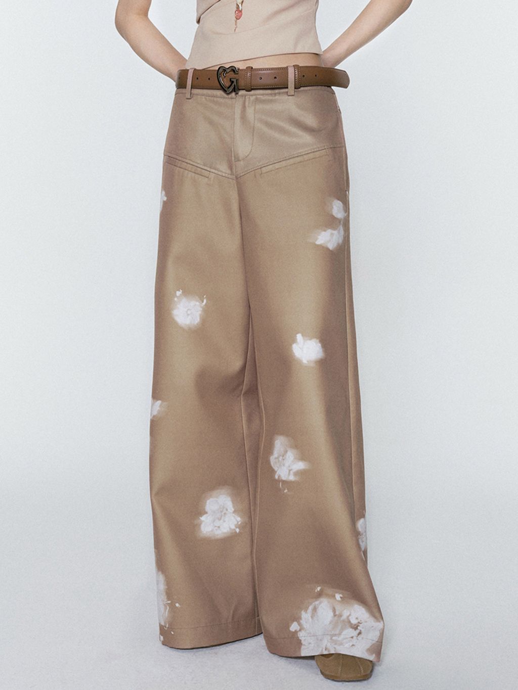 빈티지한 플라워 워싱의 와이드 팬츠로 자연스럽게 떨어지는 여유로운 핏은 다리를 길어 보이게 하고, 허리부터 골반을 따라 부드럽게 잡힌 라인이 여성스러운 무드를 완성합니다. 부드러운 베이지 톤 위에 번진 듯한 화이트 플라워 디테일이