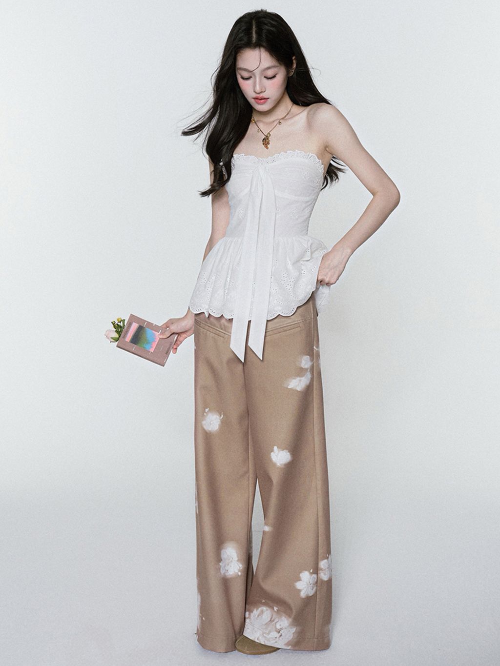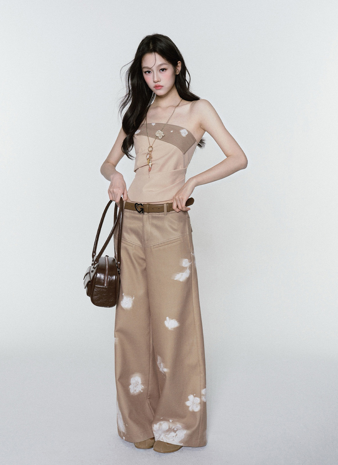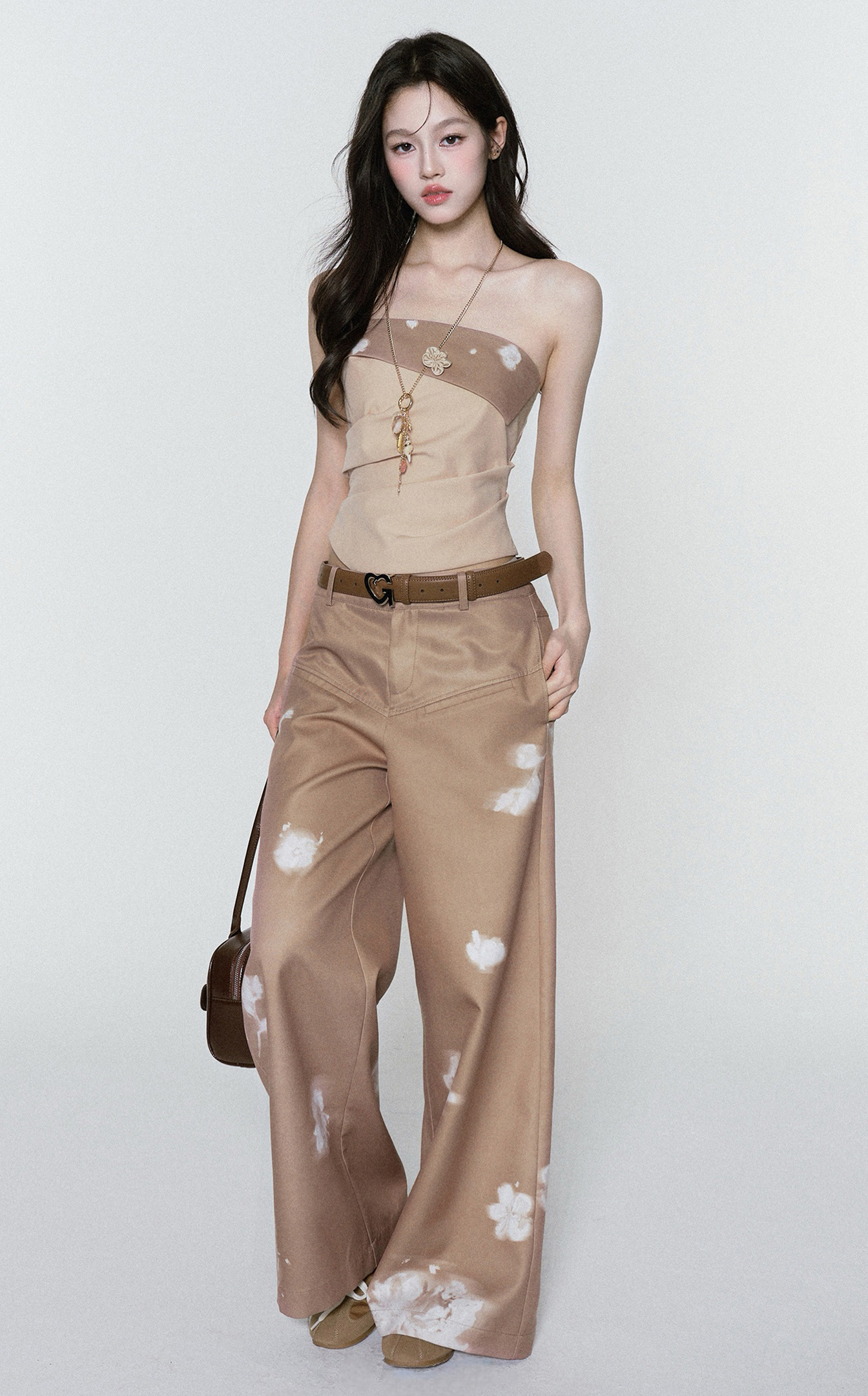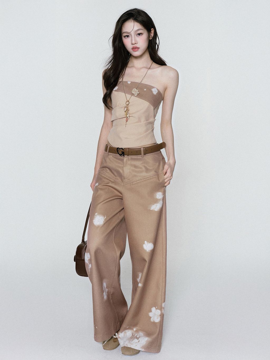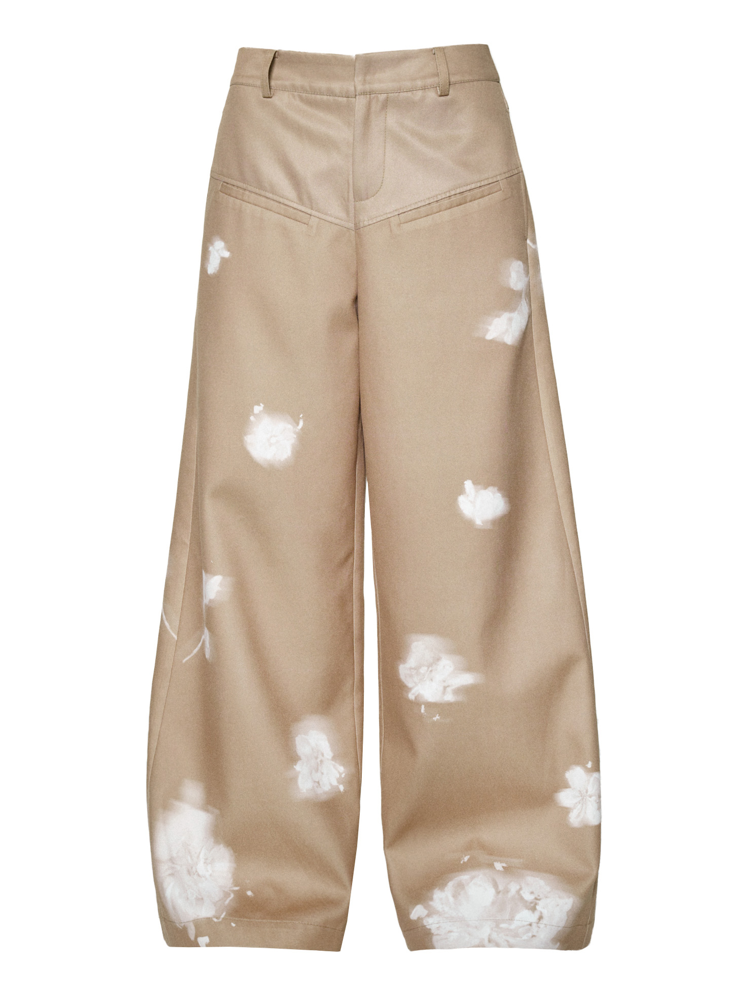 빈티지한 플라워 워싱의 와이드 팬츠로 자연스럽게 떨어지는 여유로운 핏은 다리를 길어 보이게 하고, 허리부터 골반을 따라 부드럽게 잡힌 라인이 여성스러운 무드를 완성합니다. 부드러운 베이지 톤 위에 번진 듯한 화이트 플라워 디테일이