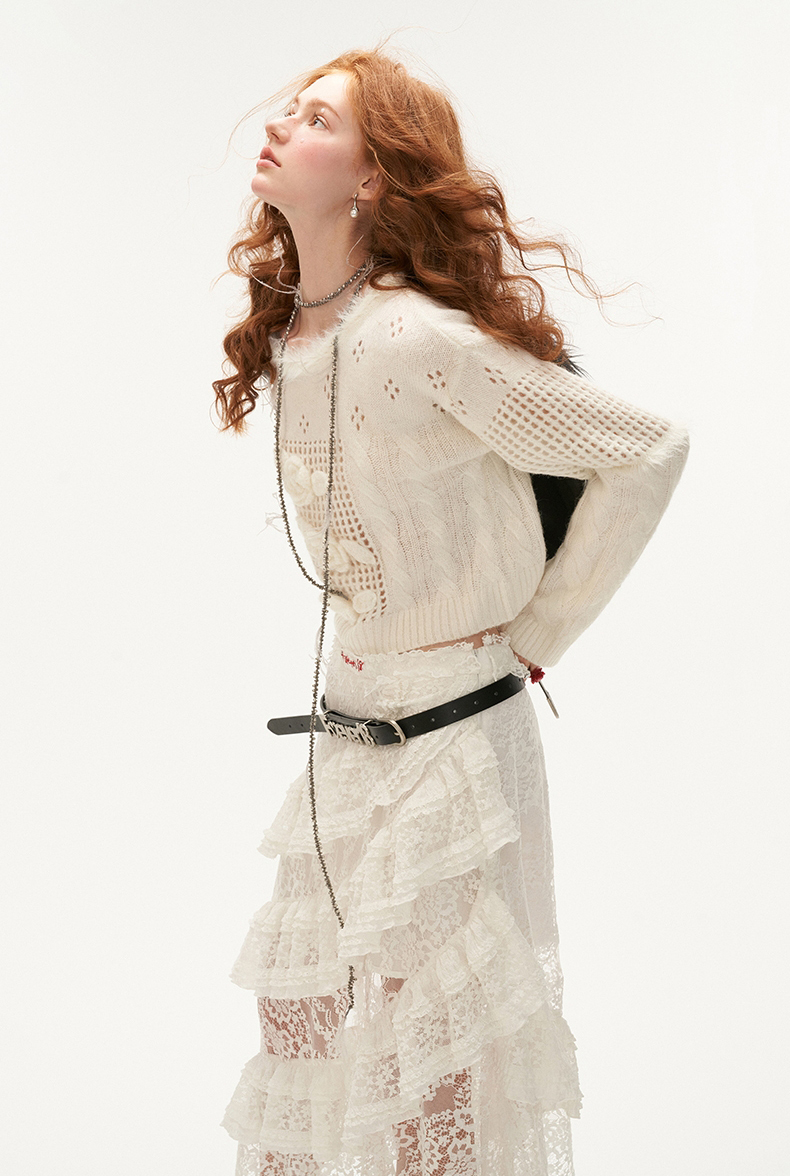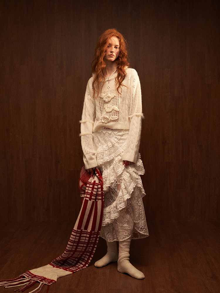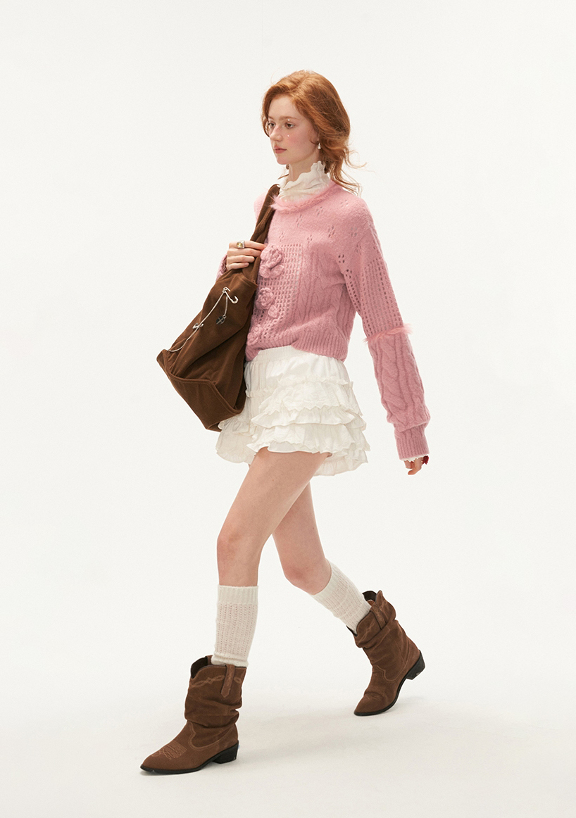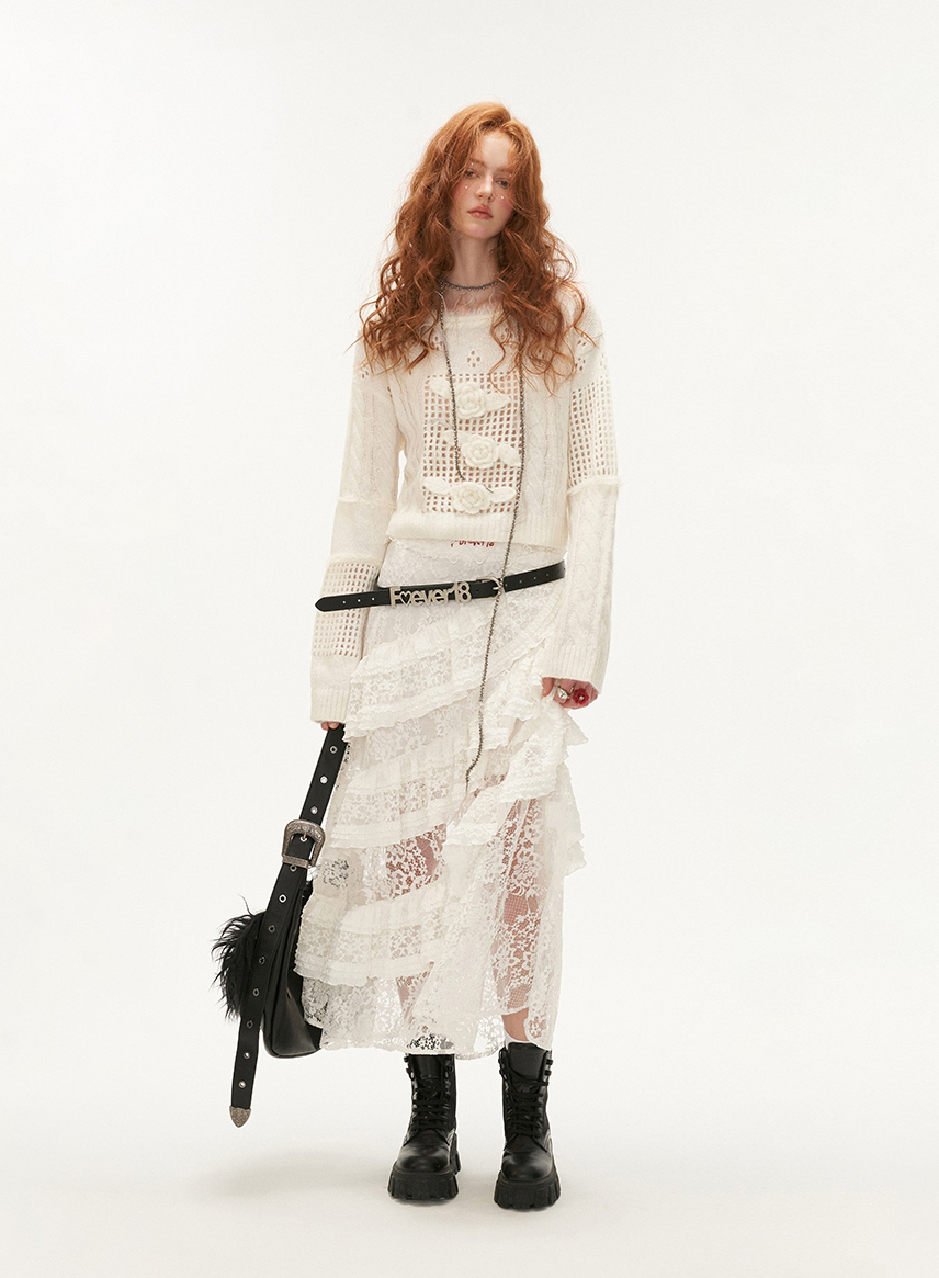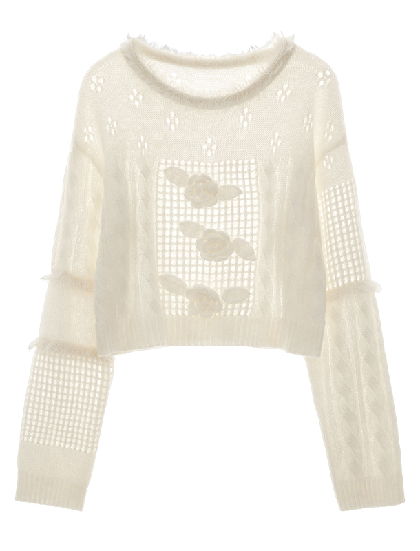 펀칭 디테일과 플라워 포인트가 돋보이는 스웨터입니다.