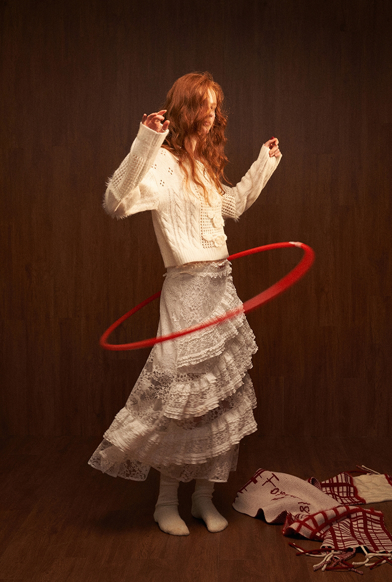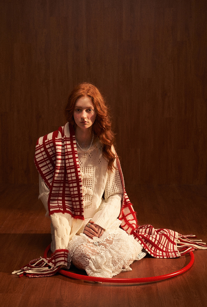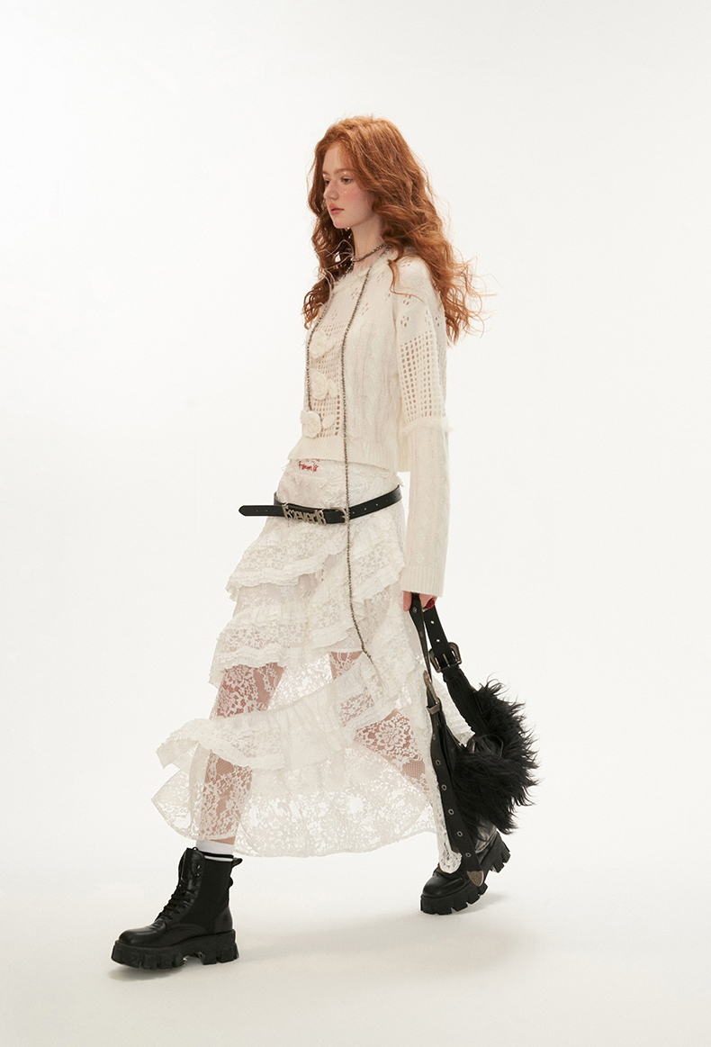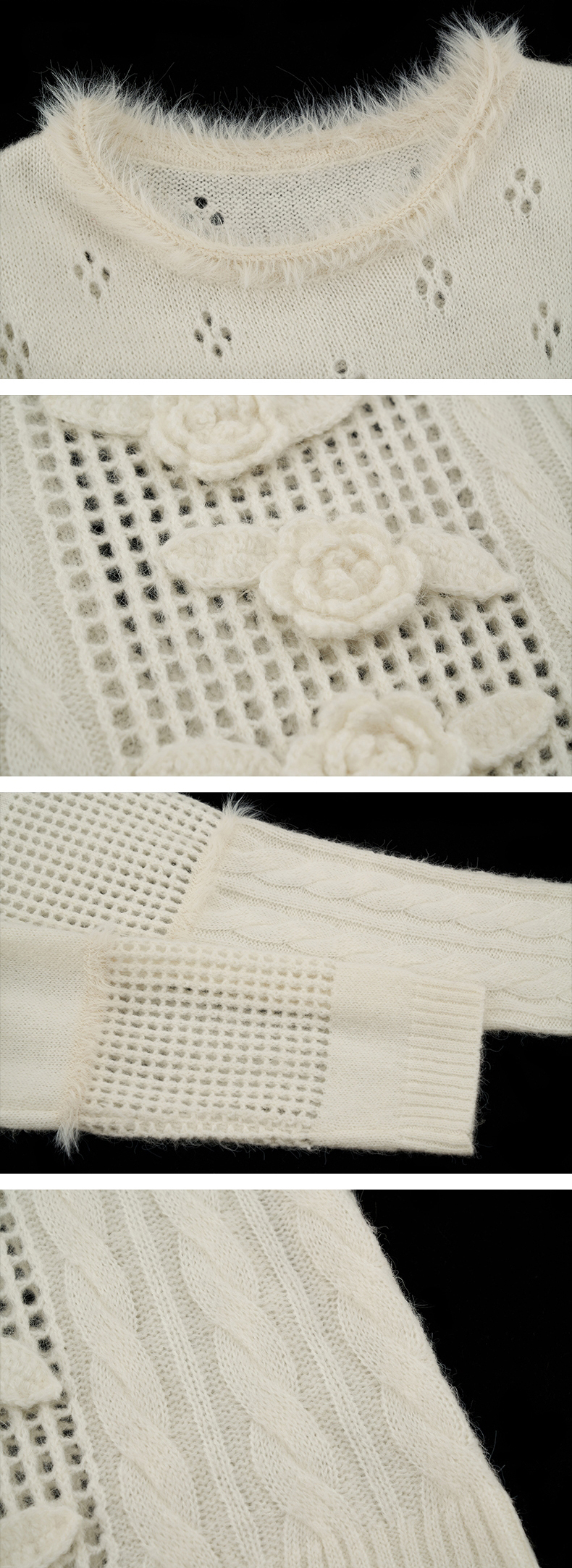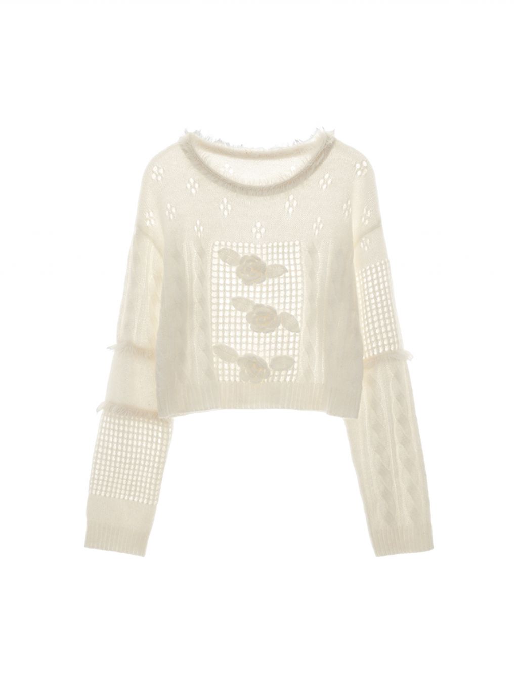 펀칭 디테일과 플라워 포인트가 돋보이는 스웨터입니다.