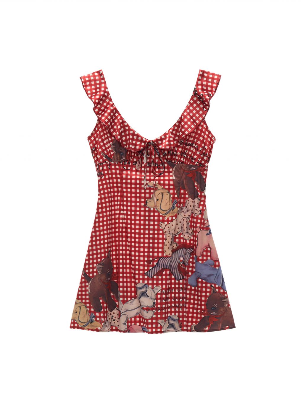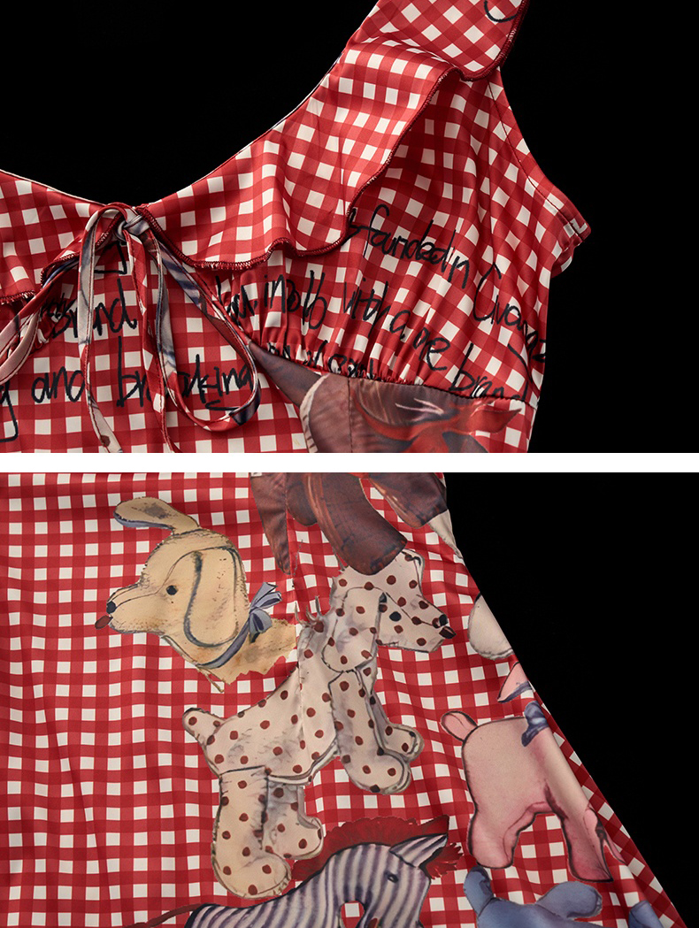 - 레드 & 화이트 깅엄 체크 바탕에 빈티지 인형 일러스트 프린팅