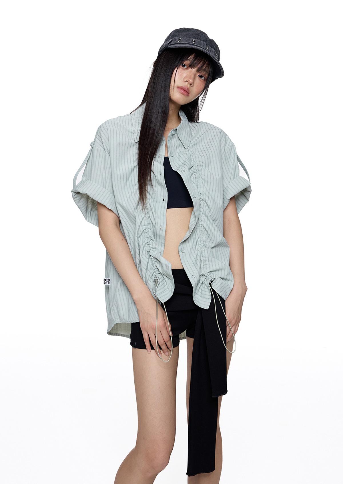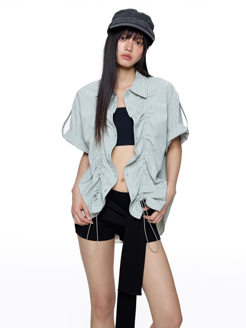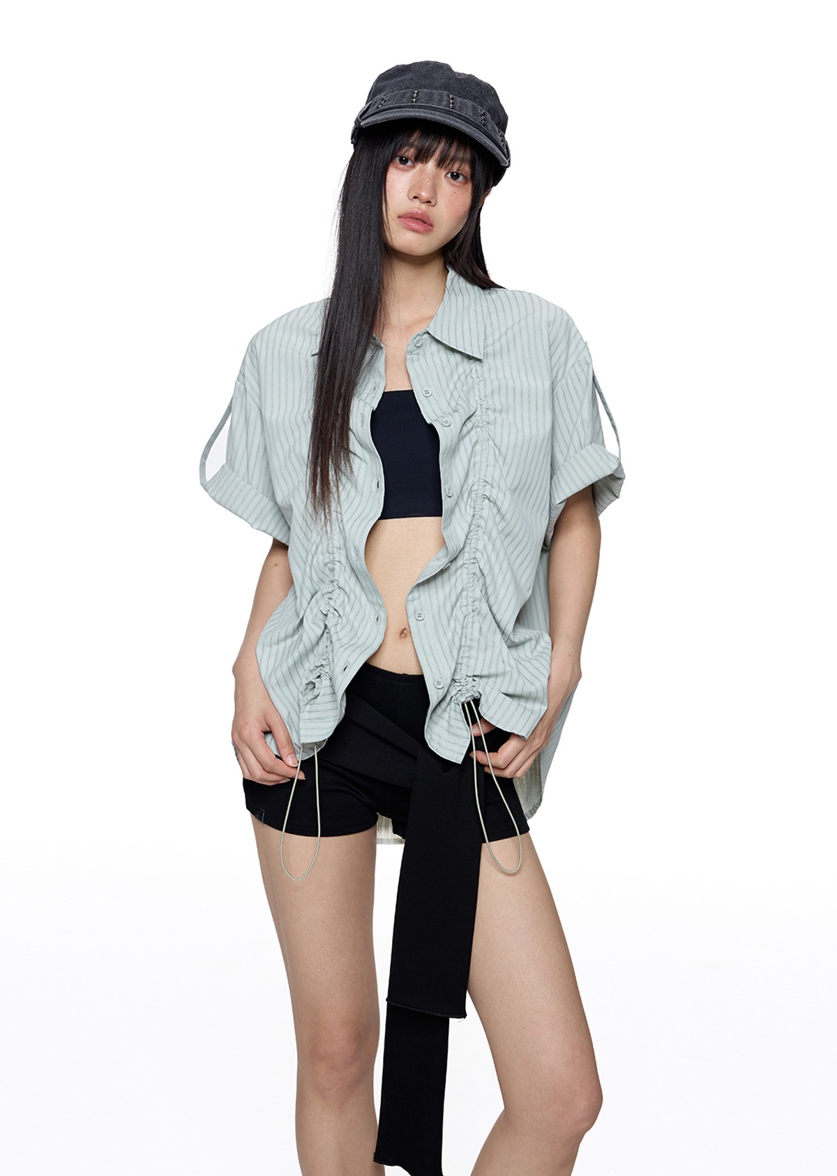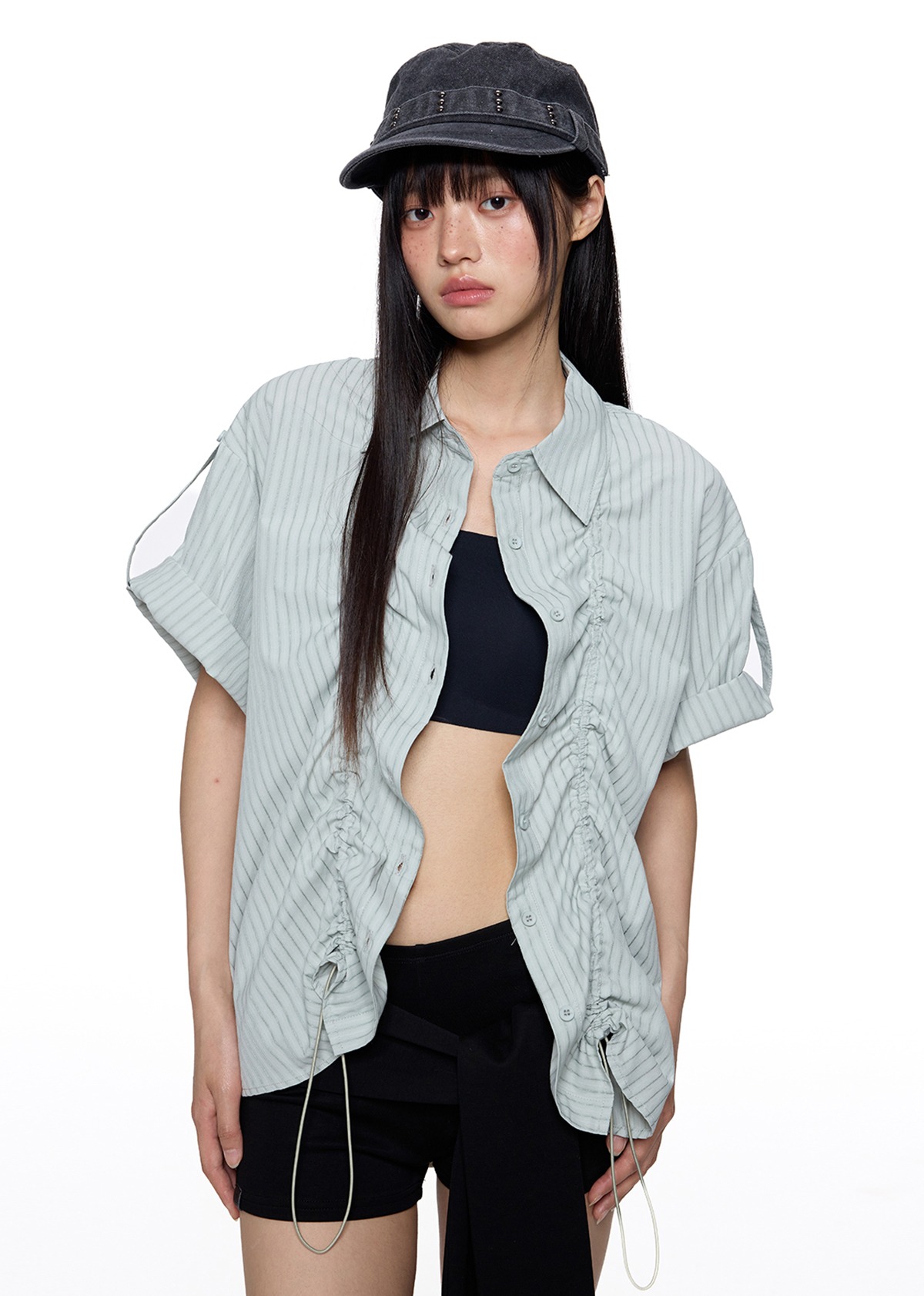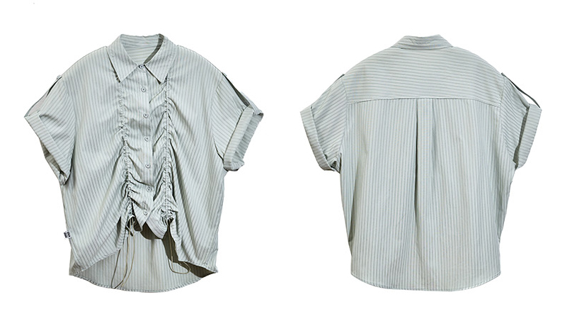 앞판 스트링 셔링으로 핏을 자유롭게 조절할 수 있는 스트라이프 셔츠로 넉넉한 오버핏과 롤업 소매로 캐주얼하고 스타일리시하게 연출되며 여름철 단독 또는 레이어드 아이템으로 활용도 높은 디자인입니다.