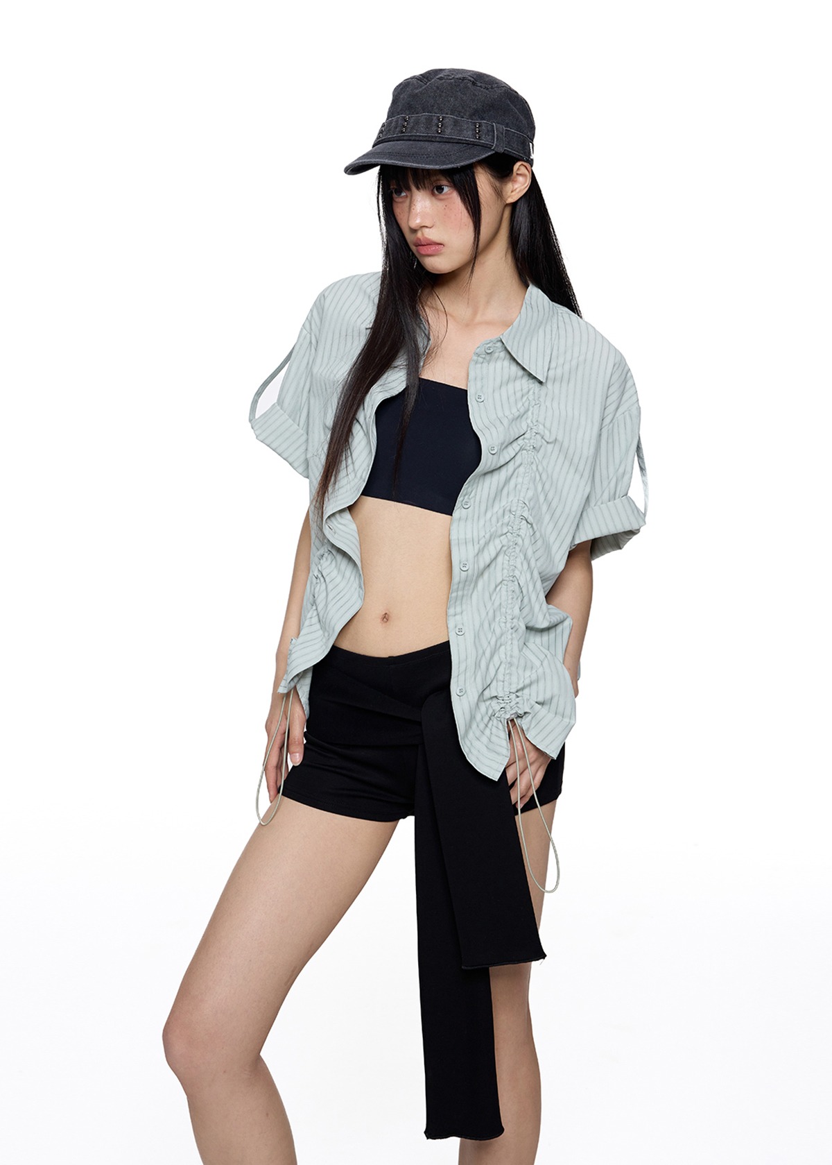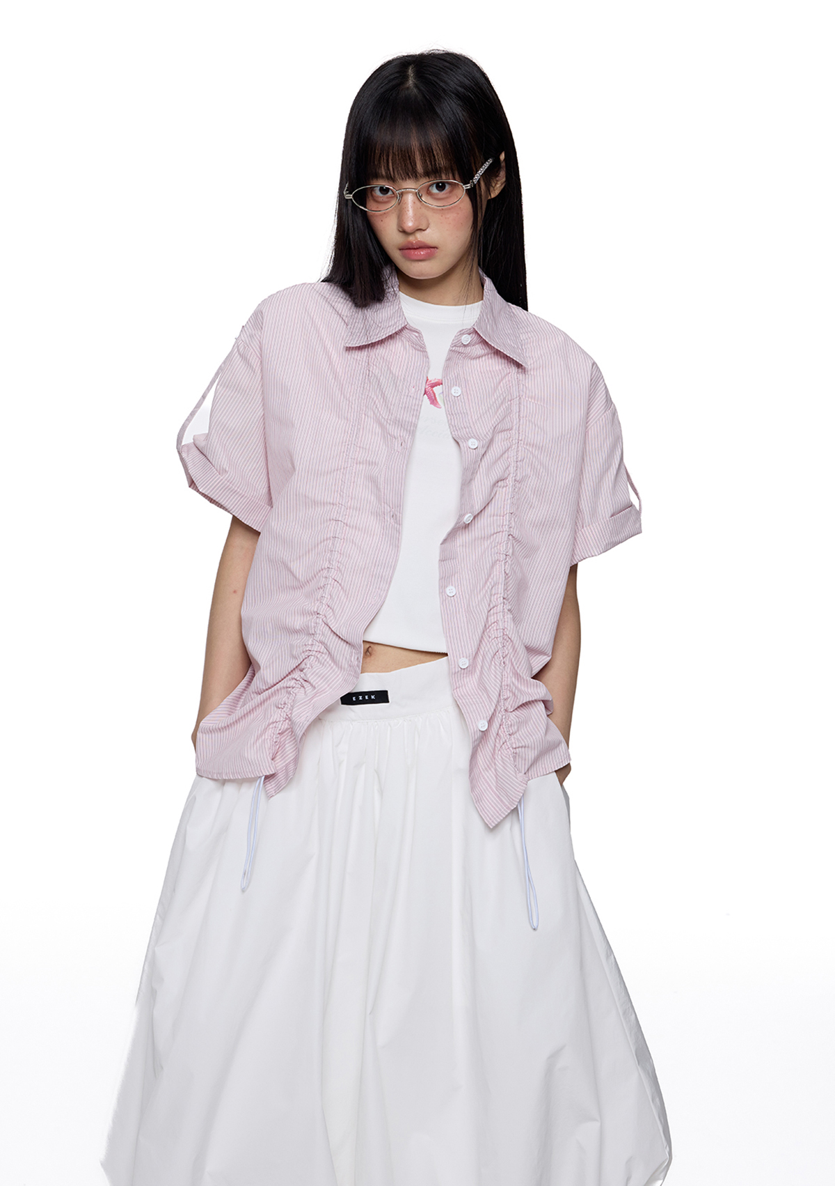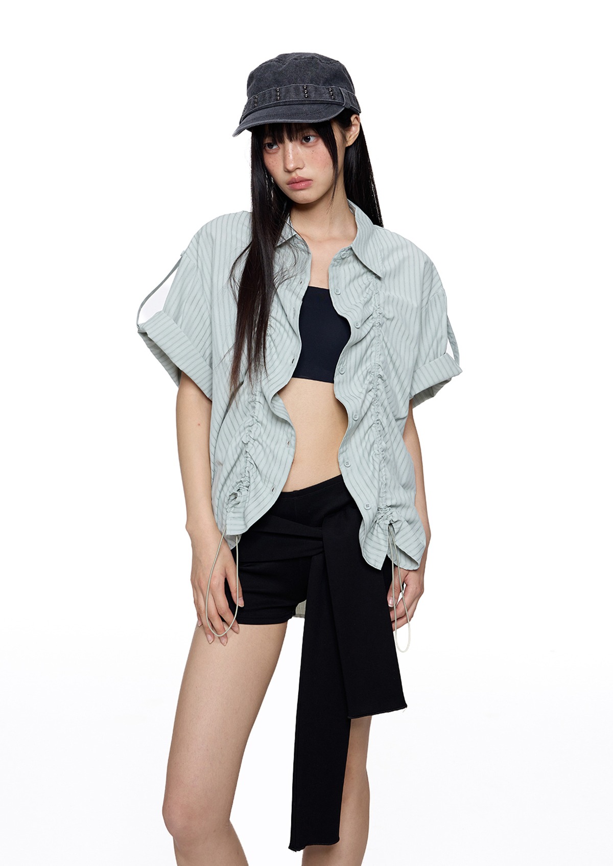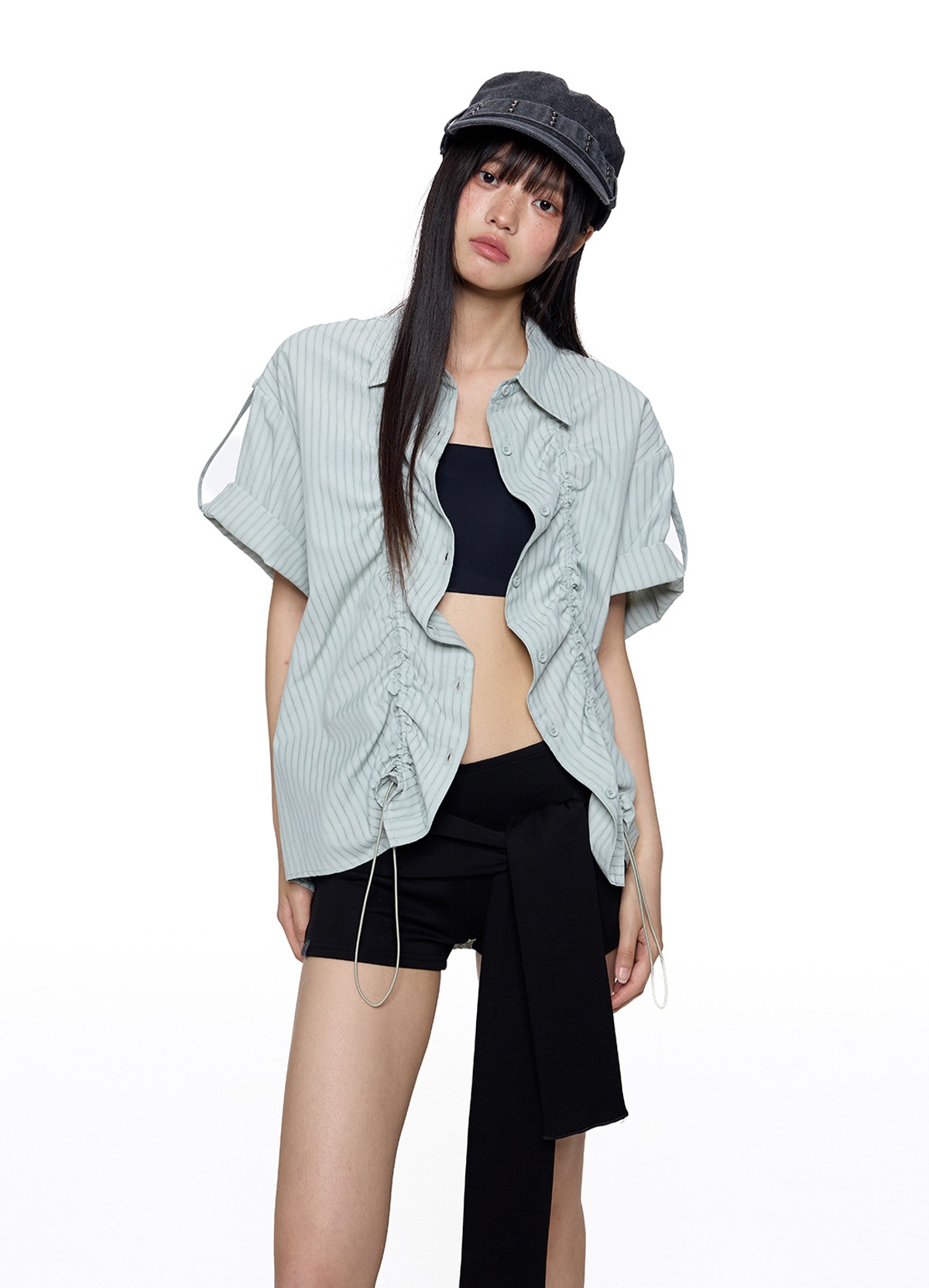 앞판 스트링 셔링으로 핏을 자유롭게 조절할 수 있는 스트라이프 셔츠로 넉넉한 오버핏과 롤업 소매로 캐주얼하고 스타일리시하게 연출되며 여름철 단독 또는 레이어드 아이템으로 활용도 높은 디자인입니다.