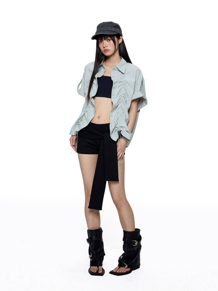 Frill Drawstring Stripe SS Shirt