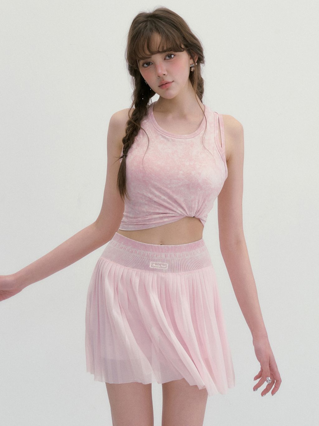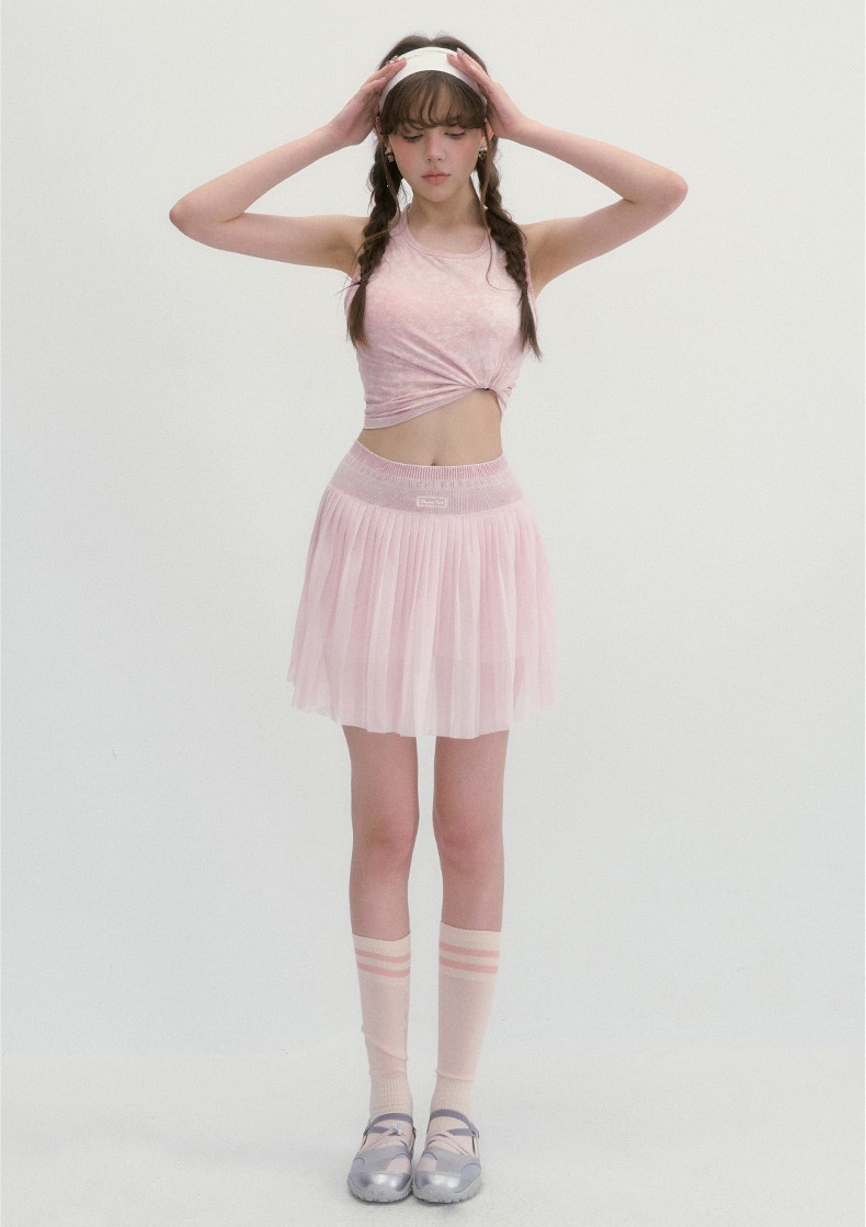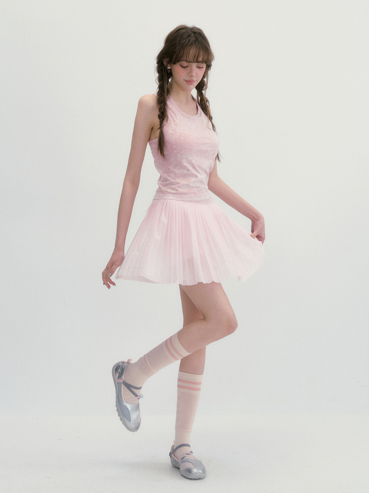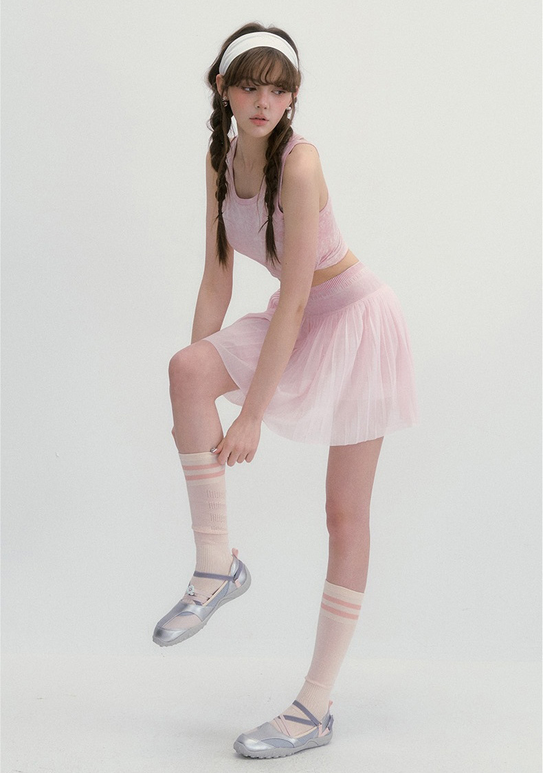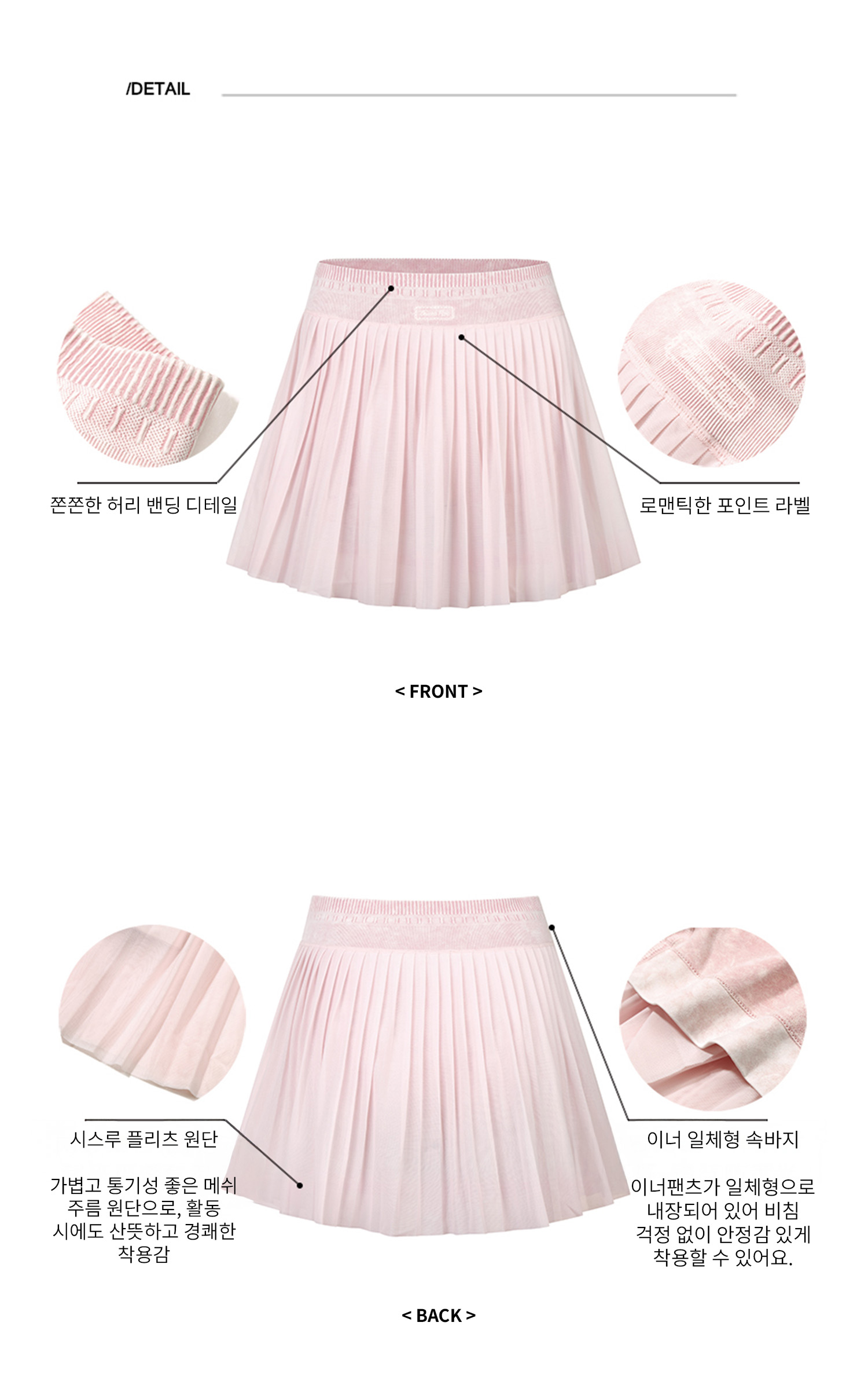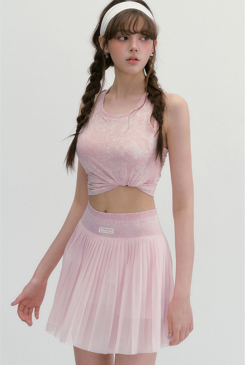 러블리한 파스텔톤과 발랄한 실루엣이 돋보이는 애슬레저 셋업으로 브라탑과 시폰 플리츠 스커트로 구성되어 운동복부터 데일리룩까지 활용 가능한 하이틴 무드의 스포티 아이템입니다.