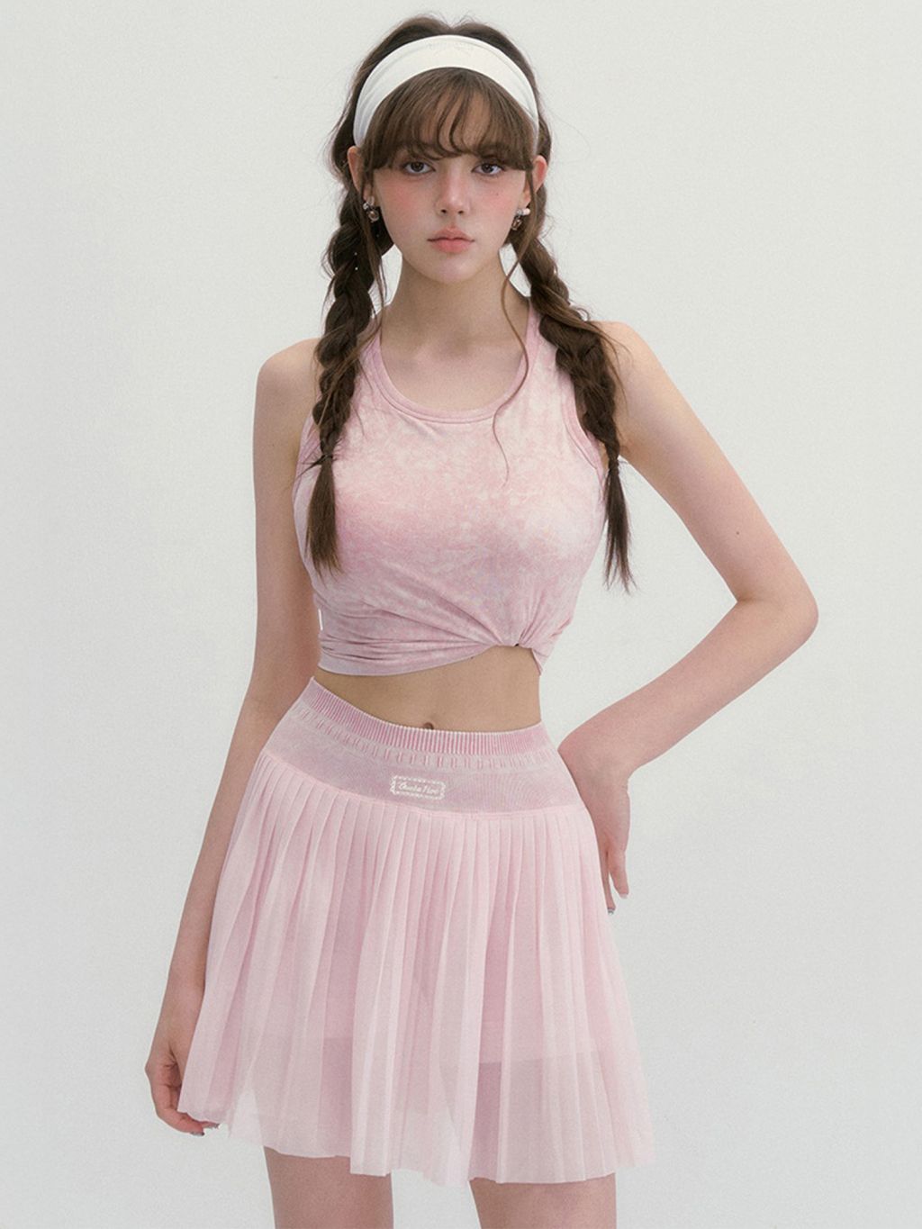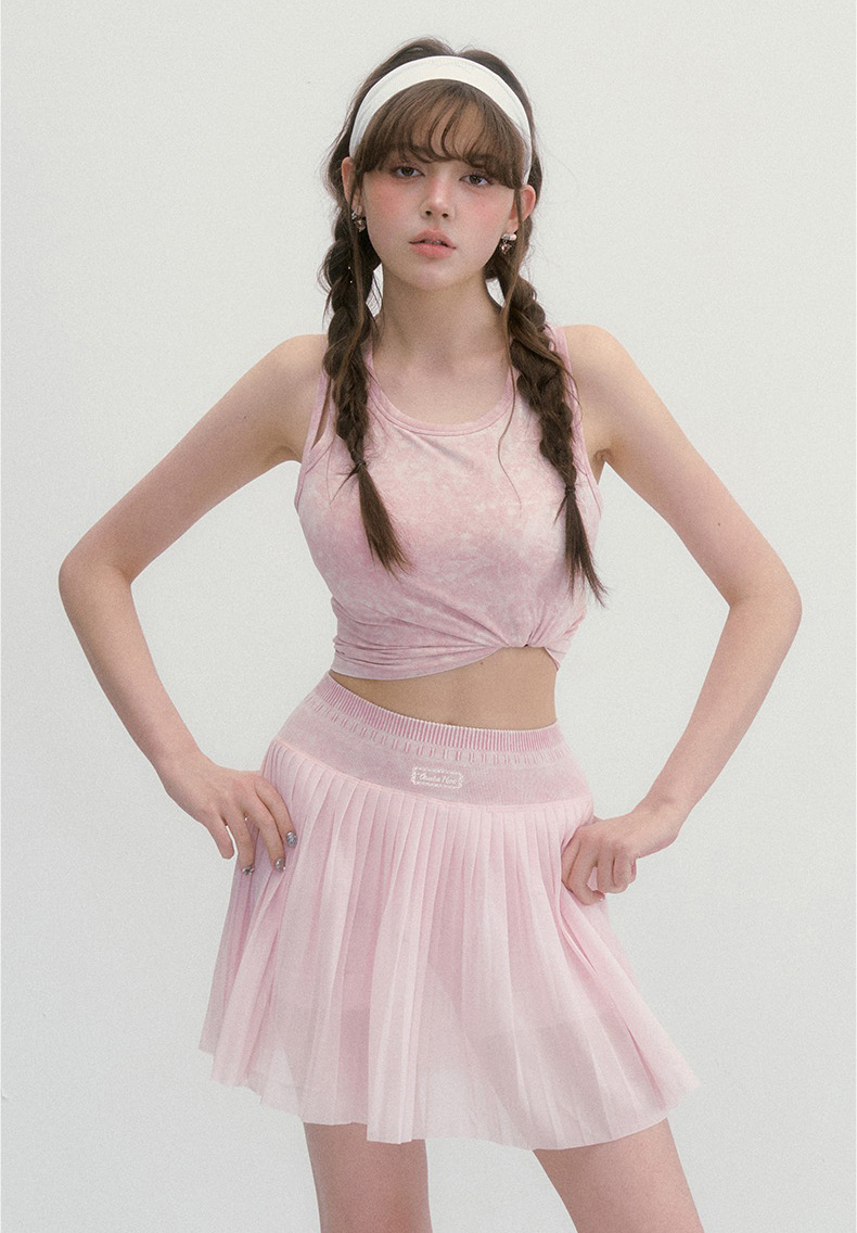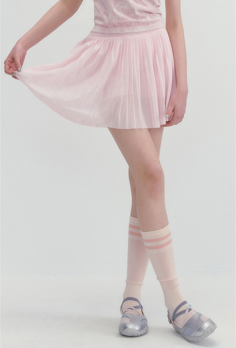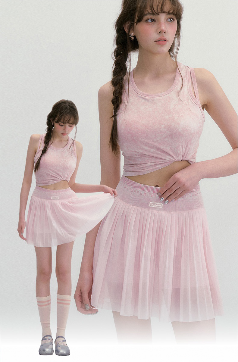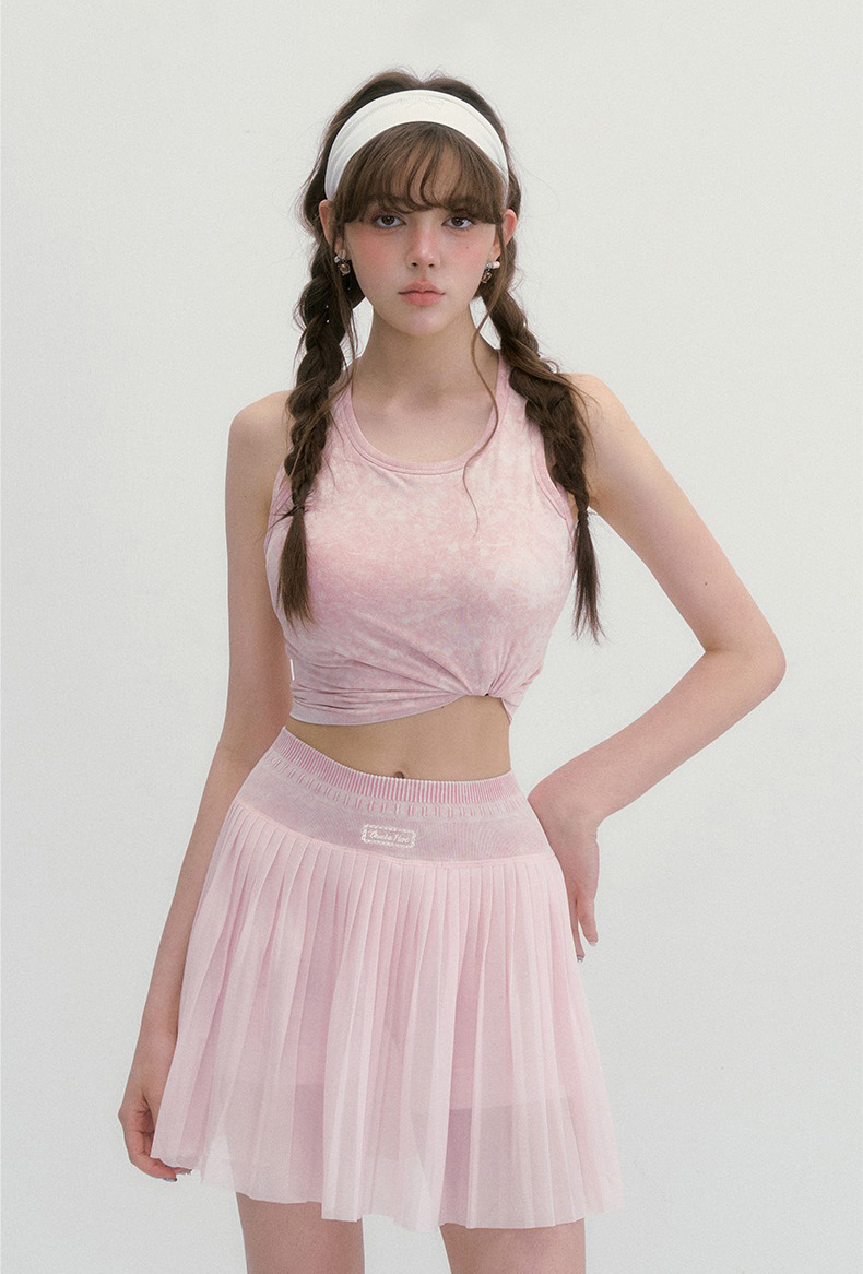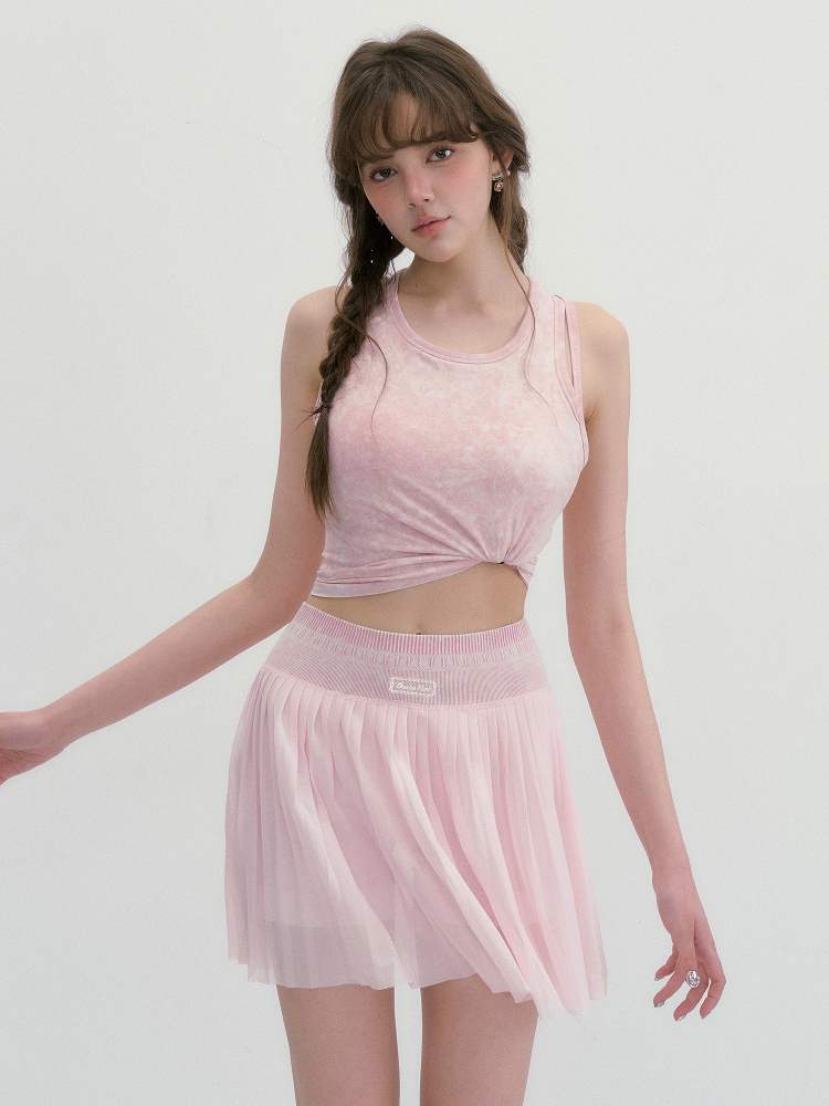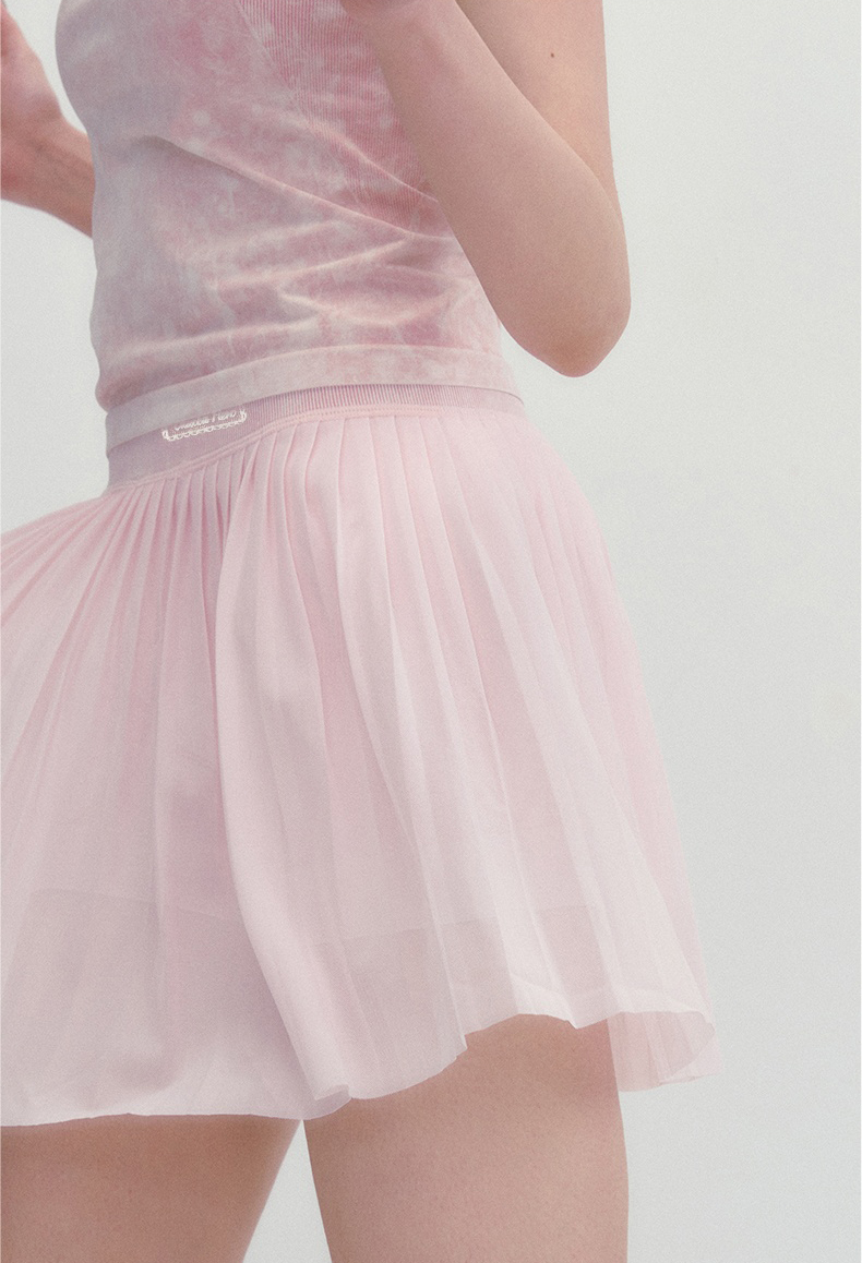 러블리한 파스텔톤과 발랄한 실루엣이 돋보이는 애슬레저 셋업으로 브라탑과 시폰 플리츠 스커트로 구성되어 운동복부터 데일리룩까지 활용 가능한 하이틴 무드의 스포티 아이템입니다.