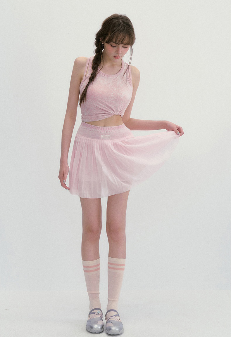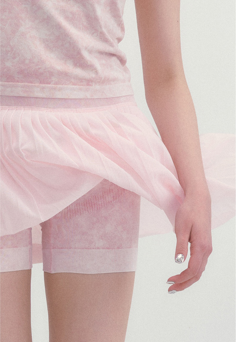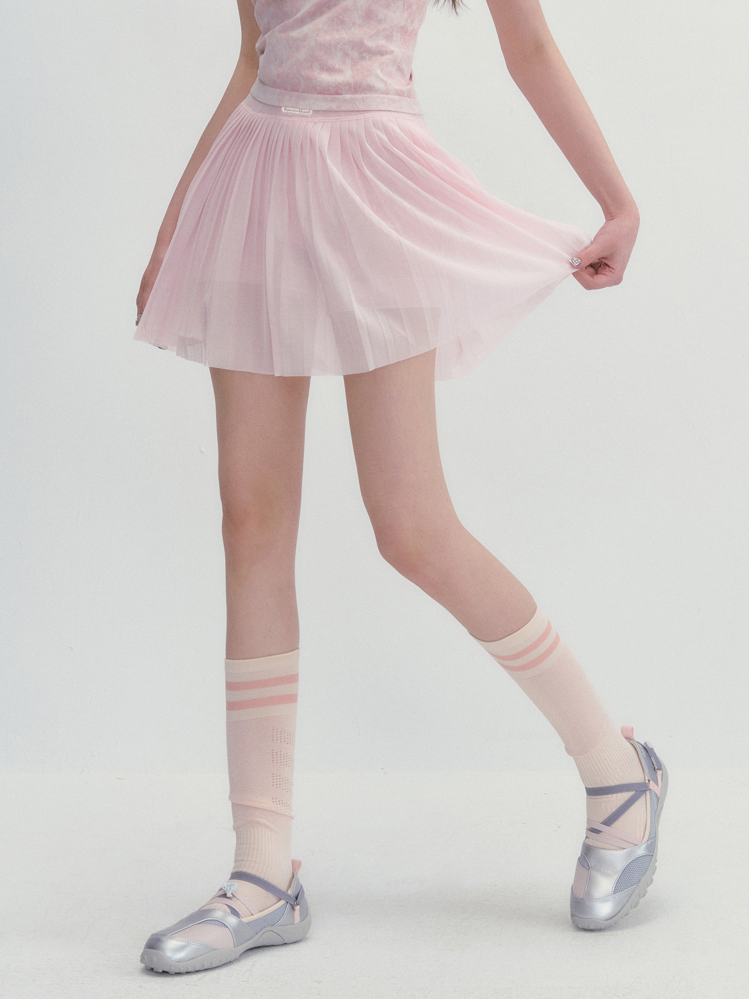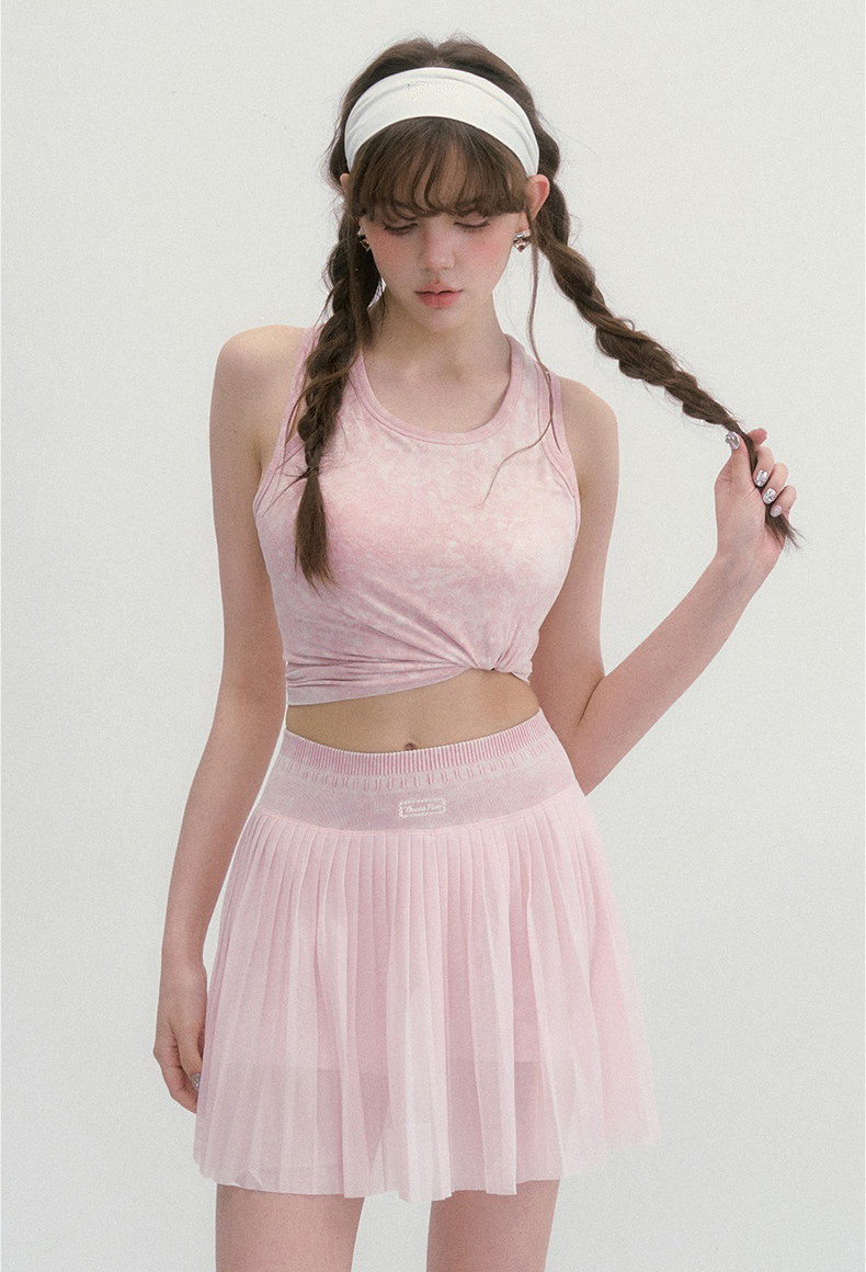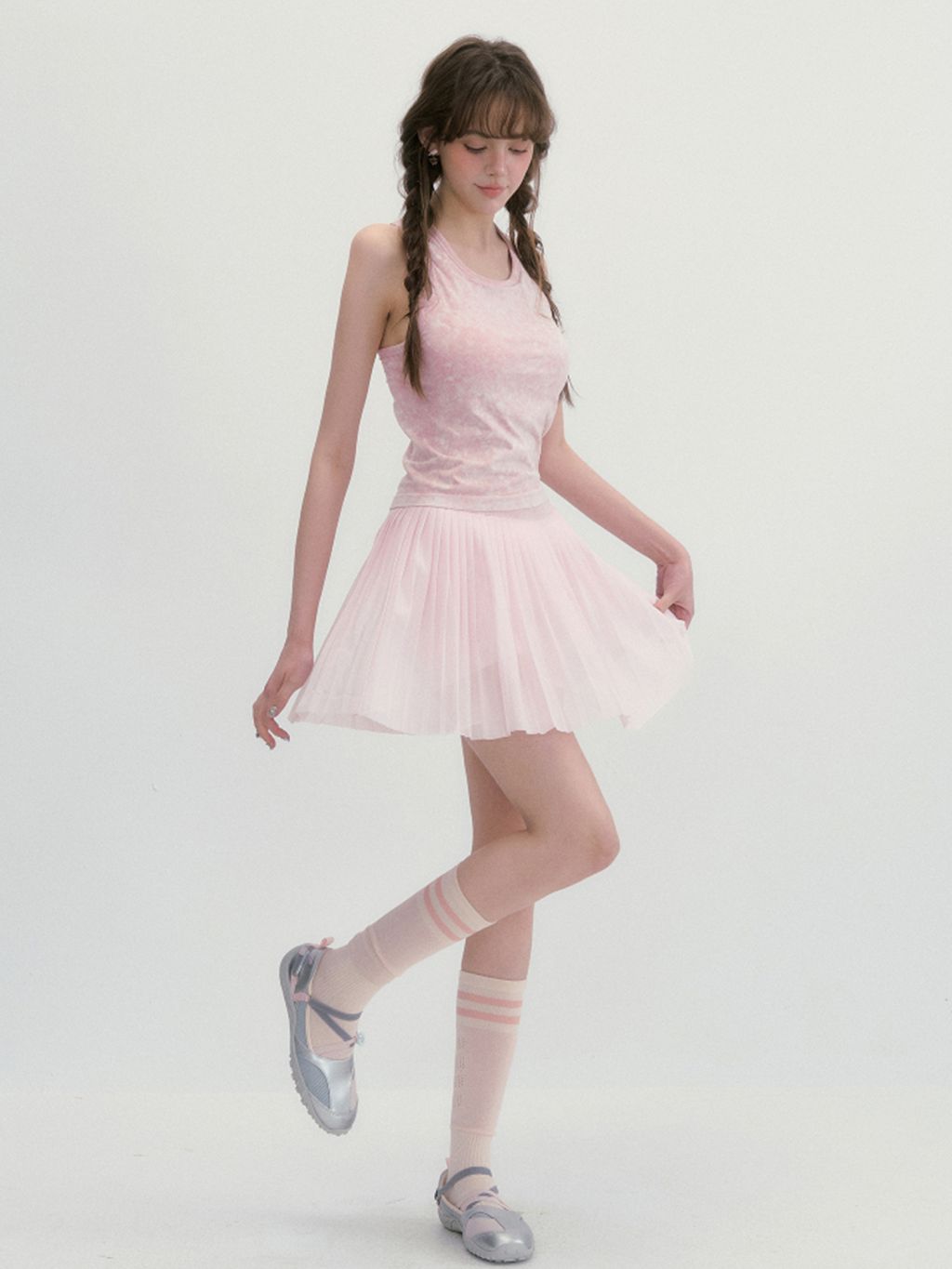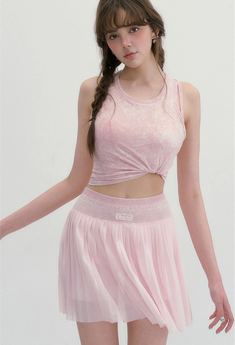 러블리한 파스텔톤과 발랄한 실루엣이 돋보이는 애슬레저 셋업으로 브라탑과 시폰 플리츠 스커트로 구성되어 운동복부터 데일리룩까지 활용 가능한 하이틴 무드의 스포티 아이템입니다.
