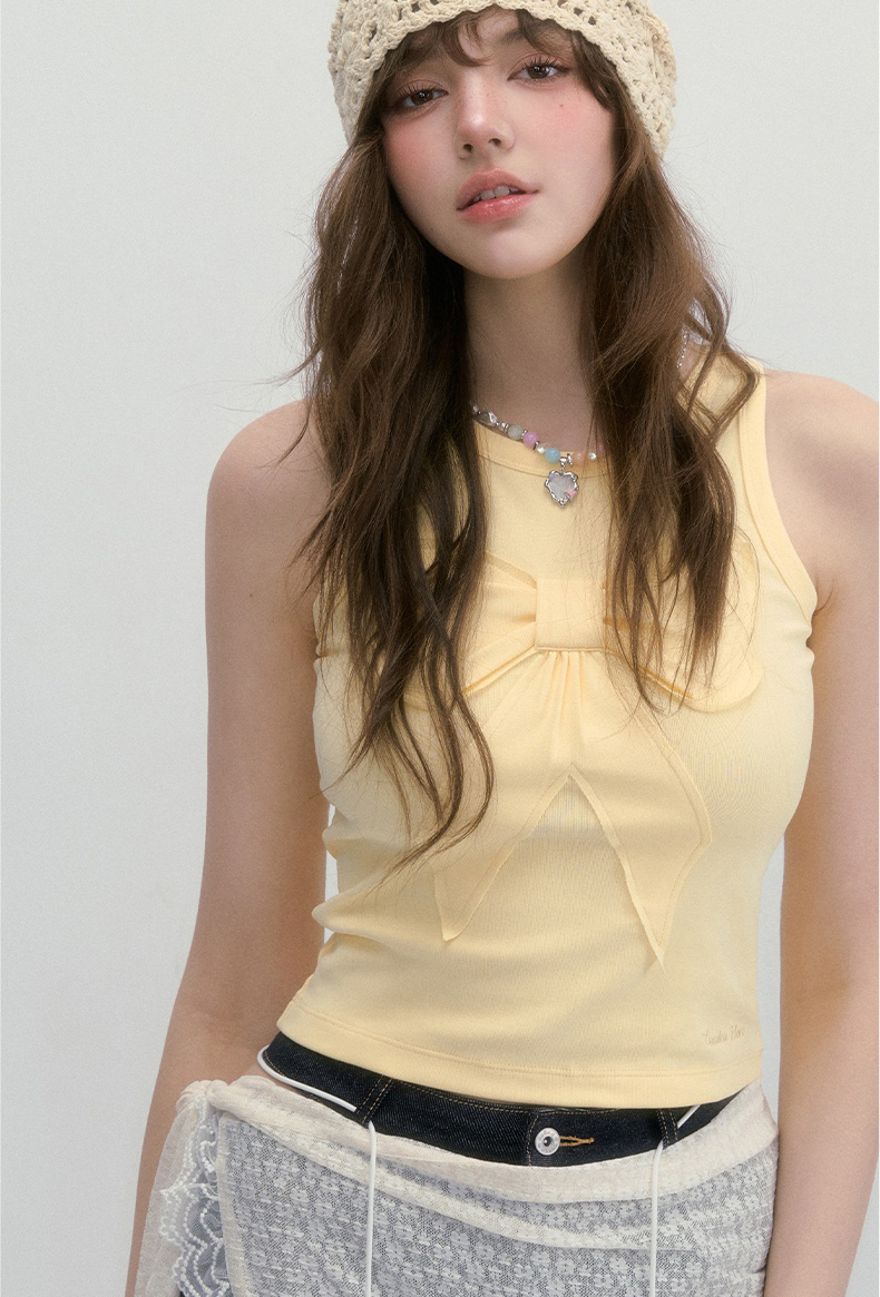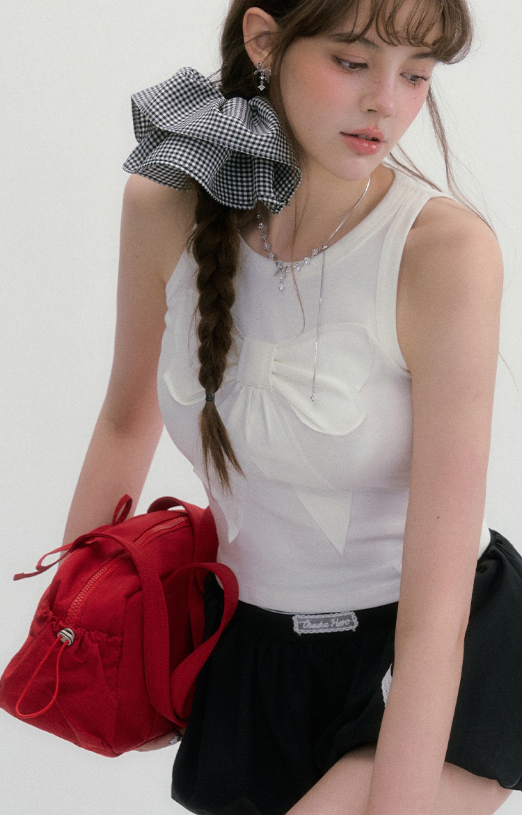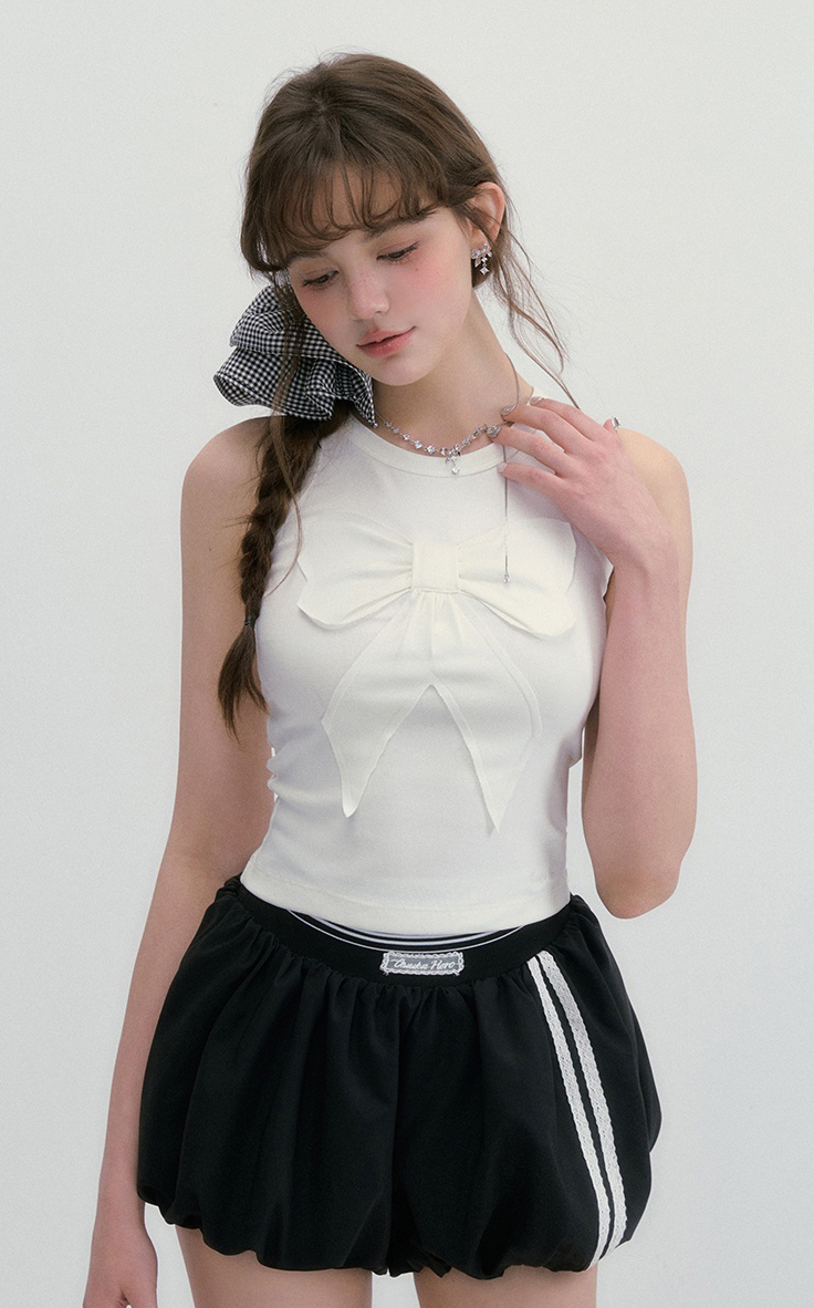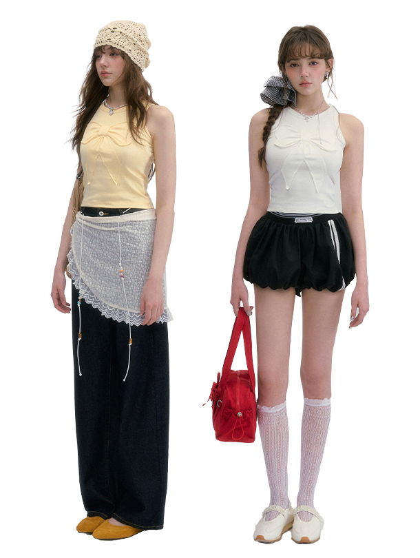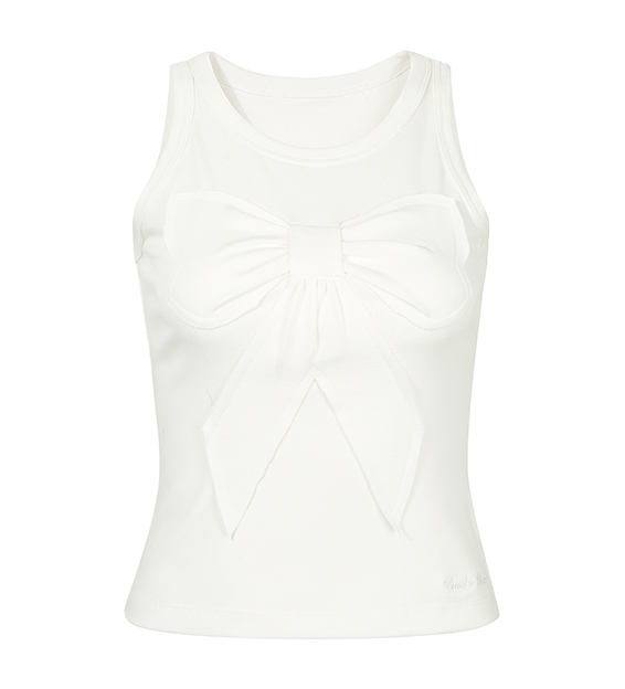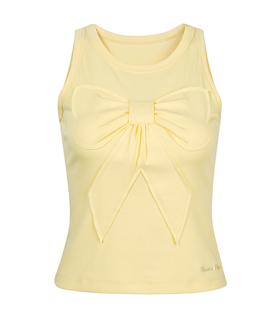 귀엽고 유니크한 리본 디테일이 돋보이는 슬리브리스 탑으로 쫀쫀한 텐션감으로 바디라인을 잡아주면서도 편안한 착용감을 선사합니다.