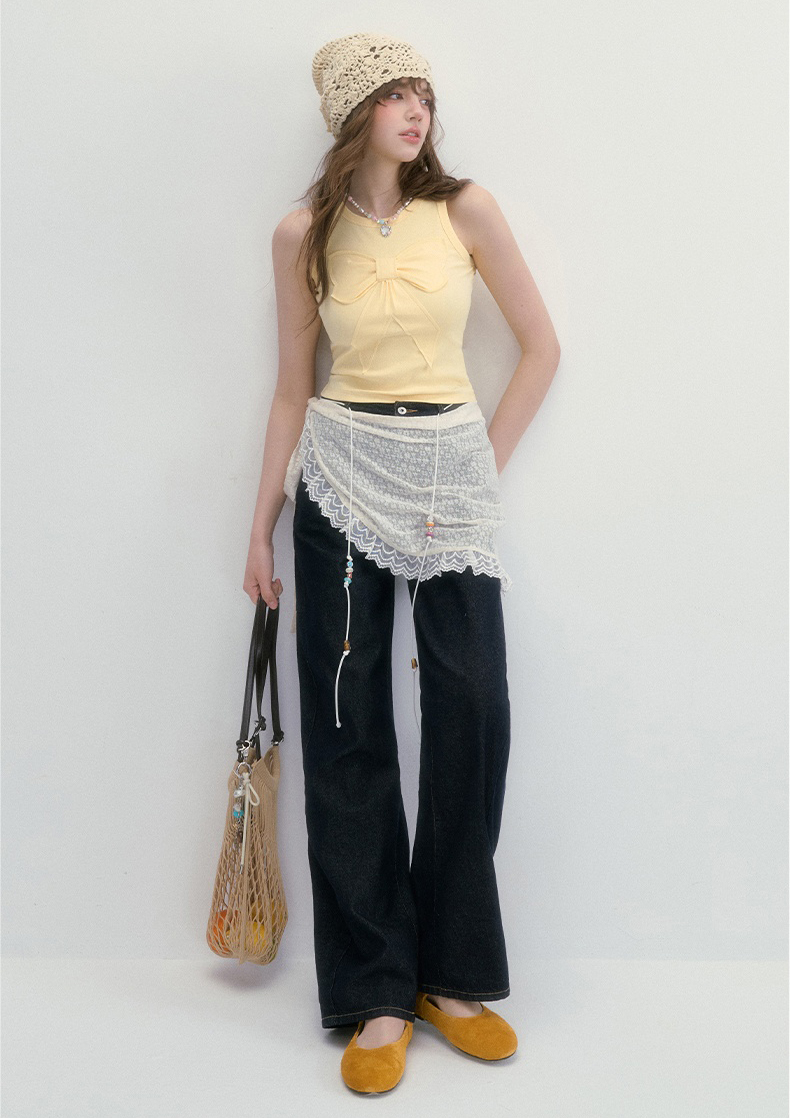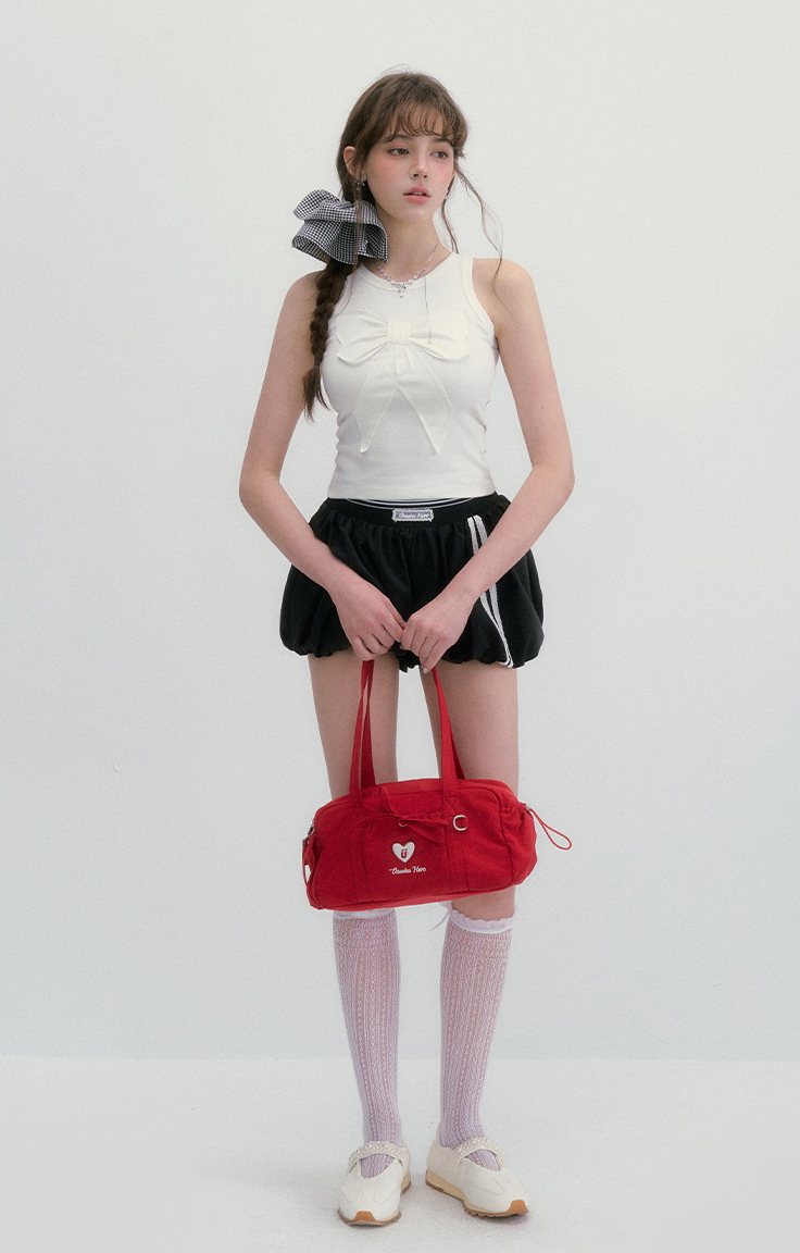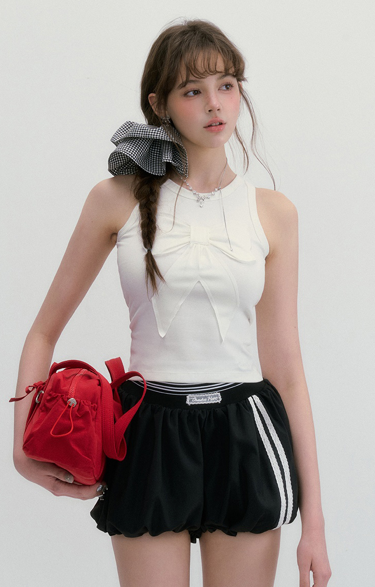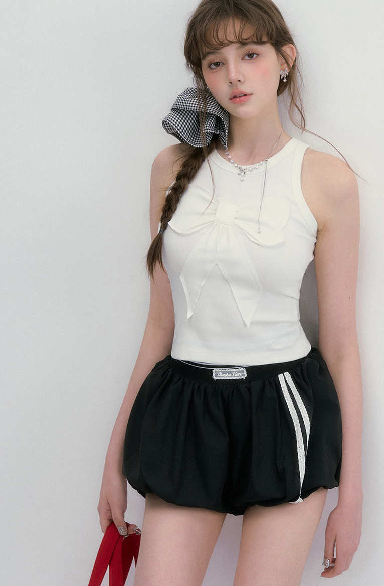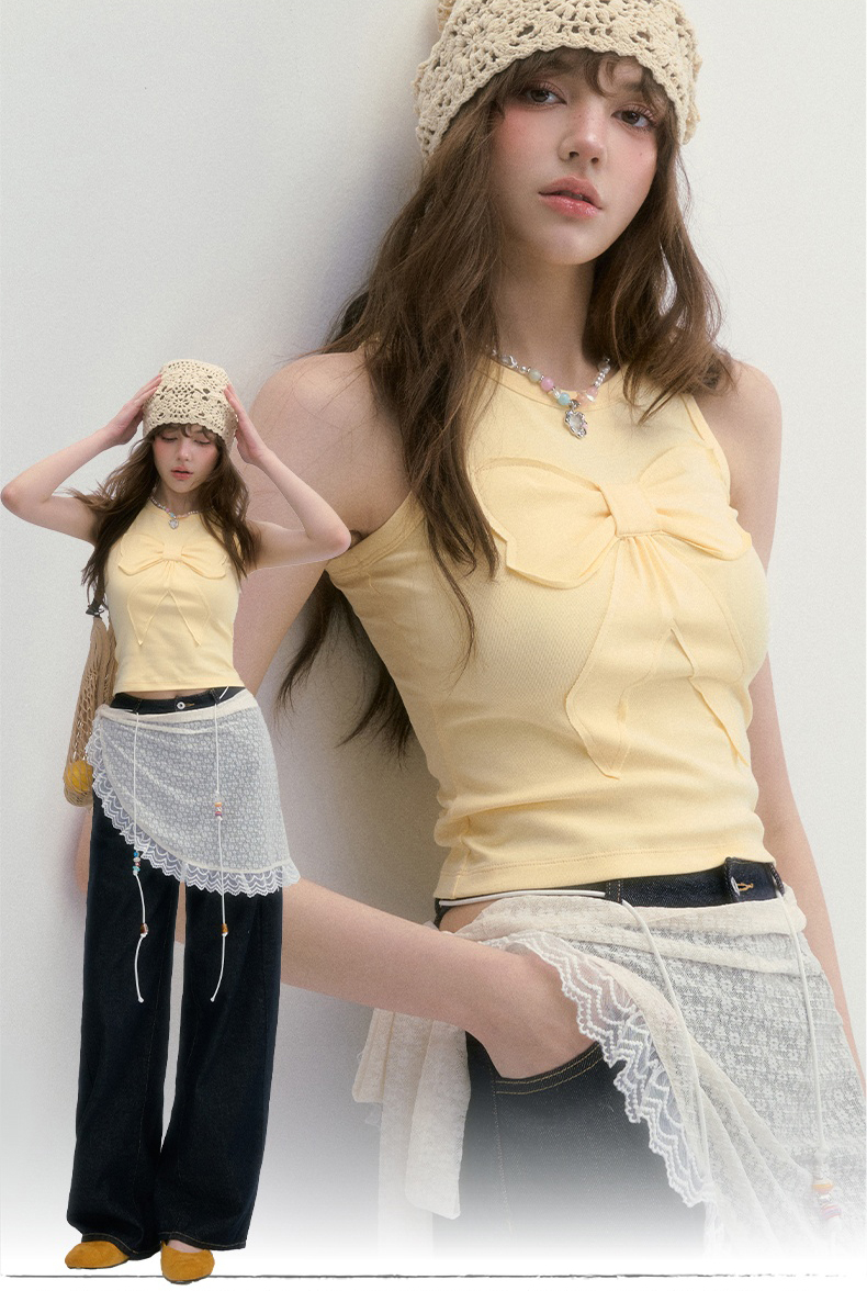 귀엽고 유니크한 리본 디테일이 돋보이는 슬리브리스 탑으로 쫀쫀한 텐션감으로 바디라인을 잡아주면서도 편안한 착용감을 선사합니다.