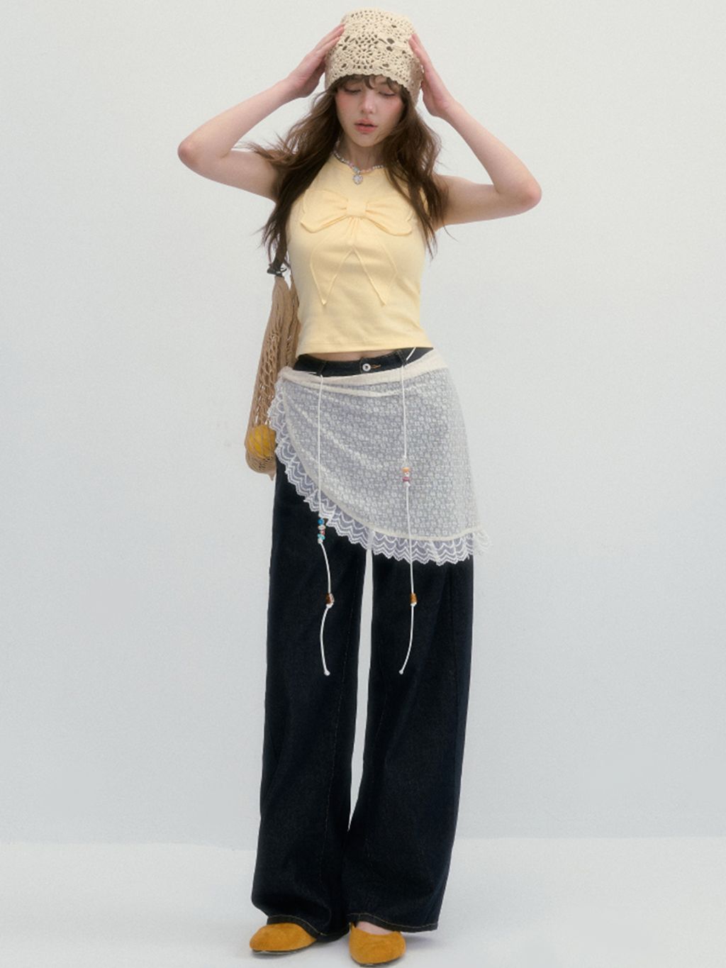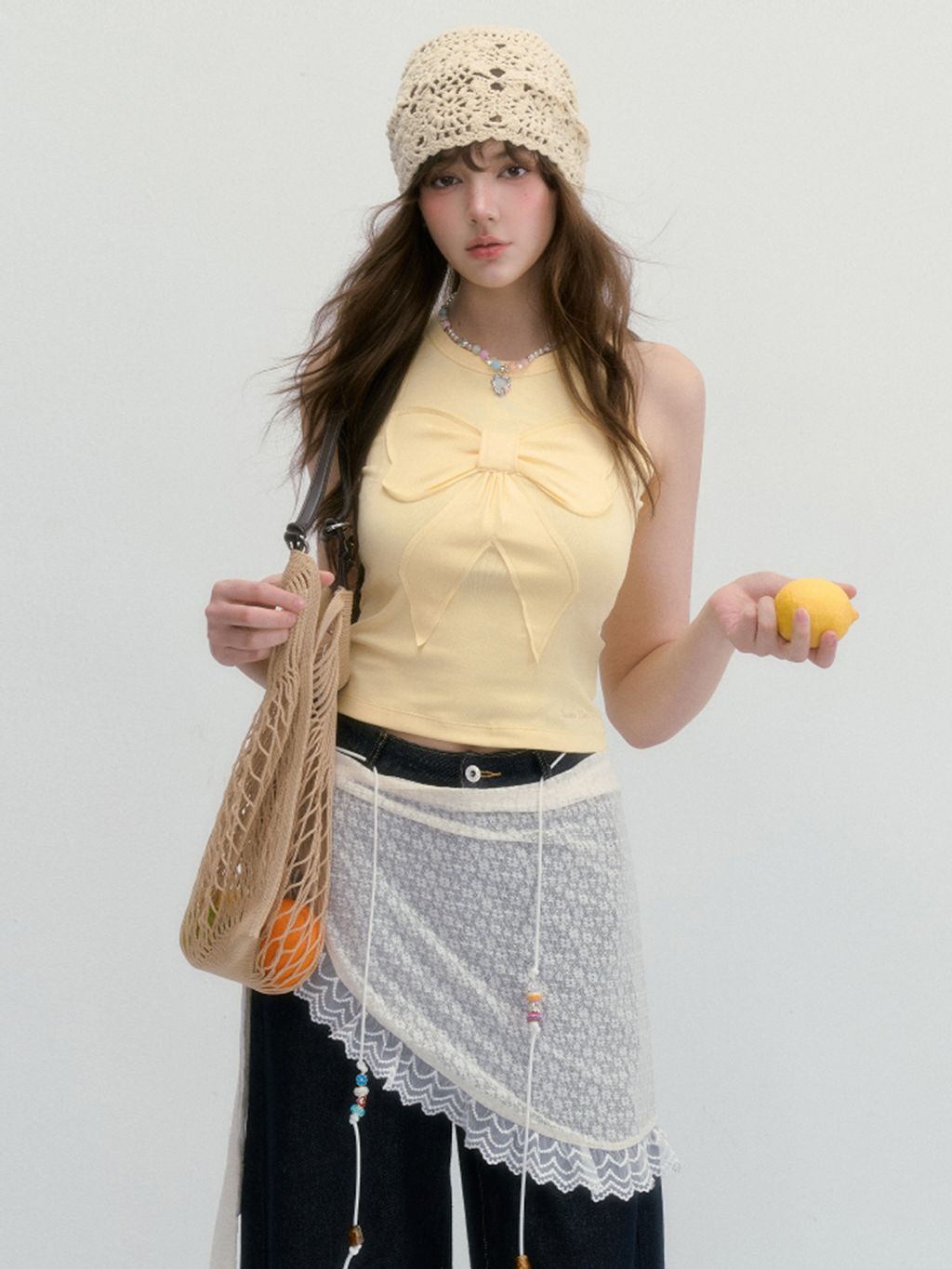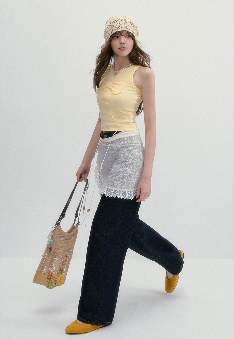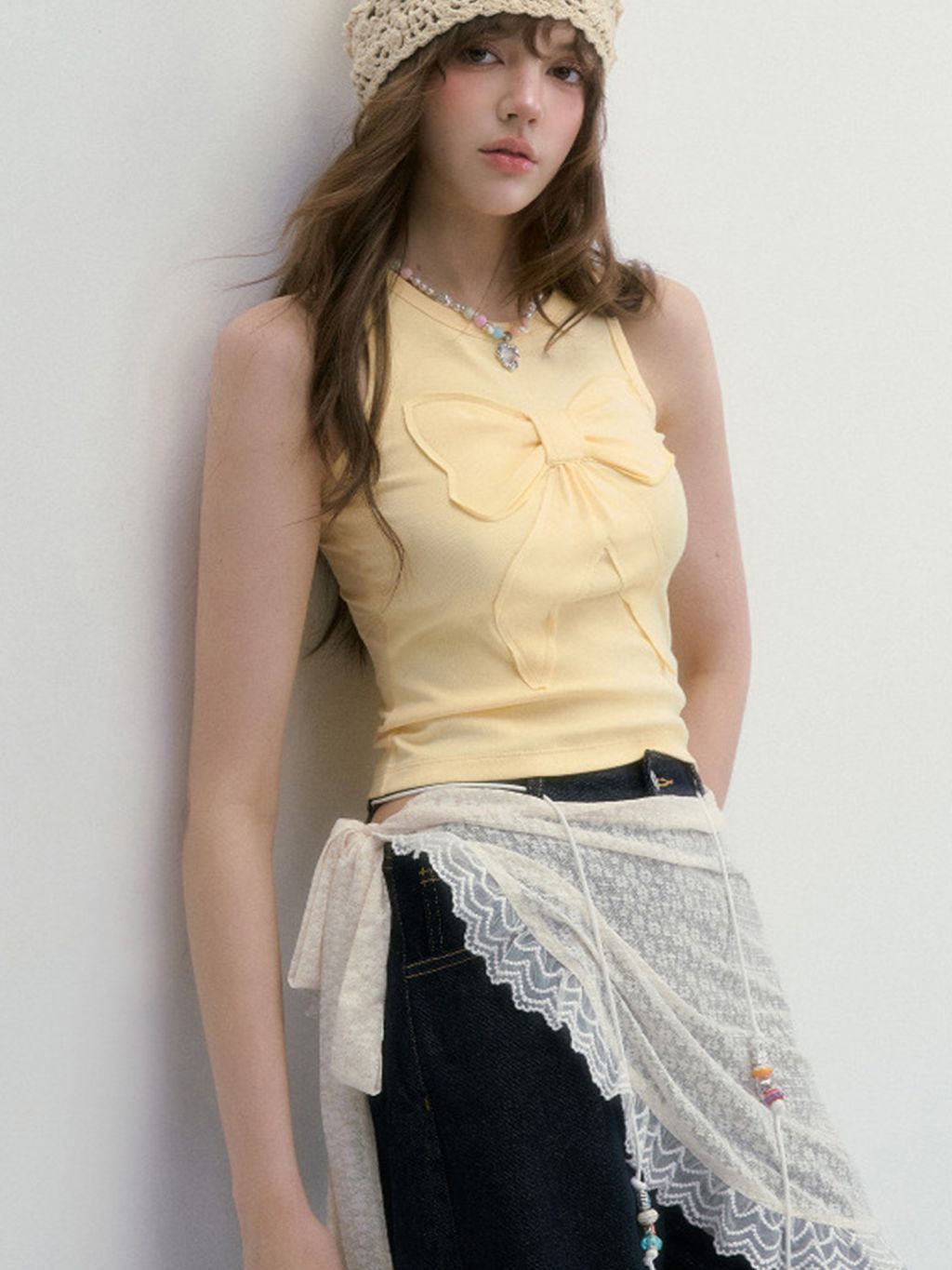 귀엽고 유니크한 리본 디테일이 돋보이는 슬리브리스 탑으로 쫀쫀한 텐션감으로 바디라인을 잡아주면서도 편안한 착용감을 선사합니다.