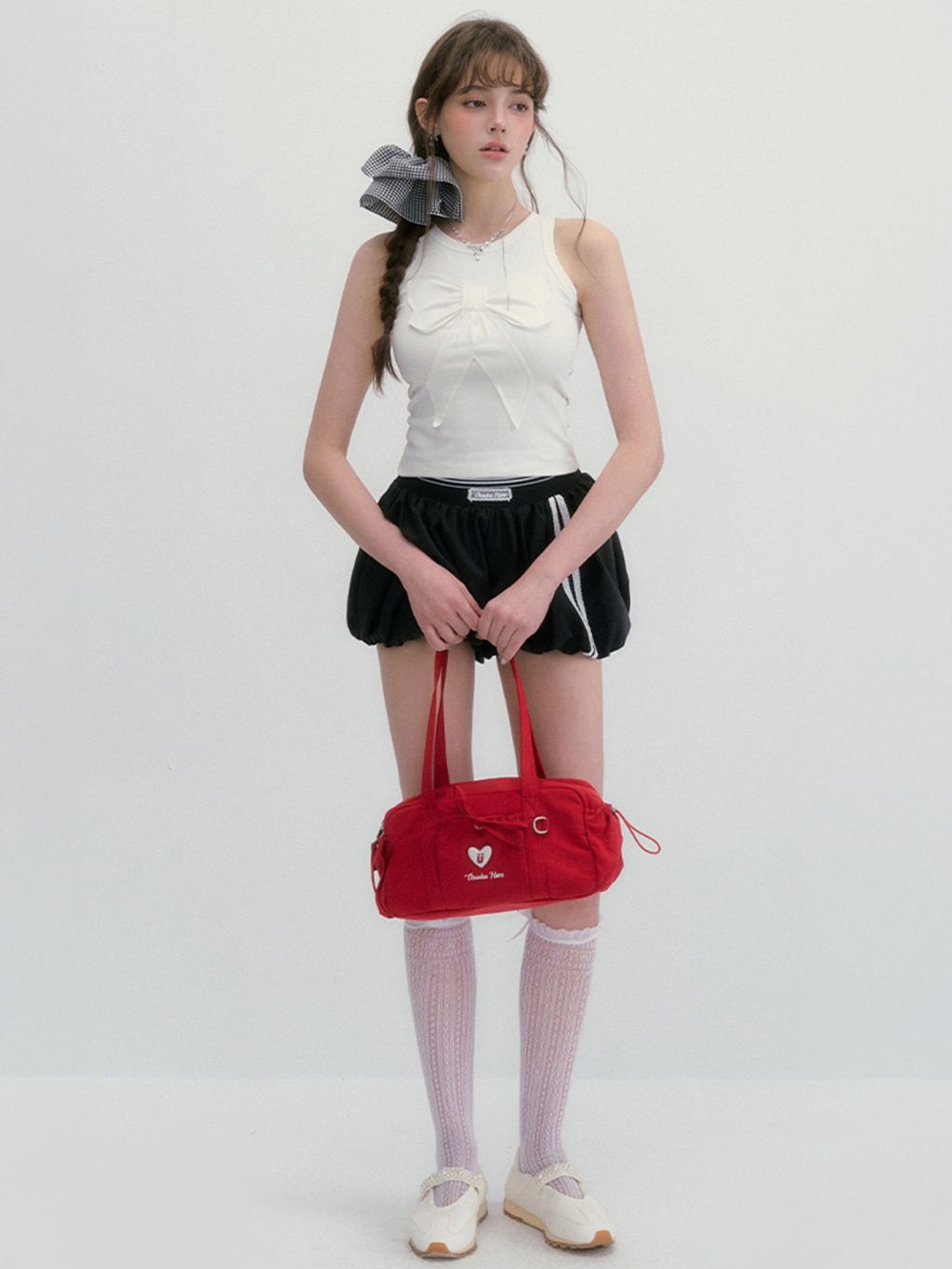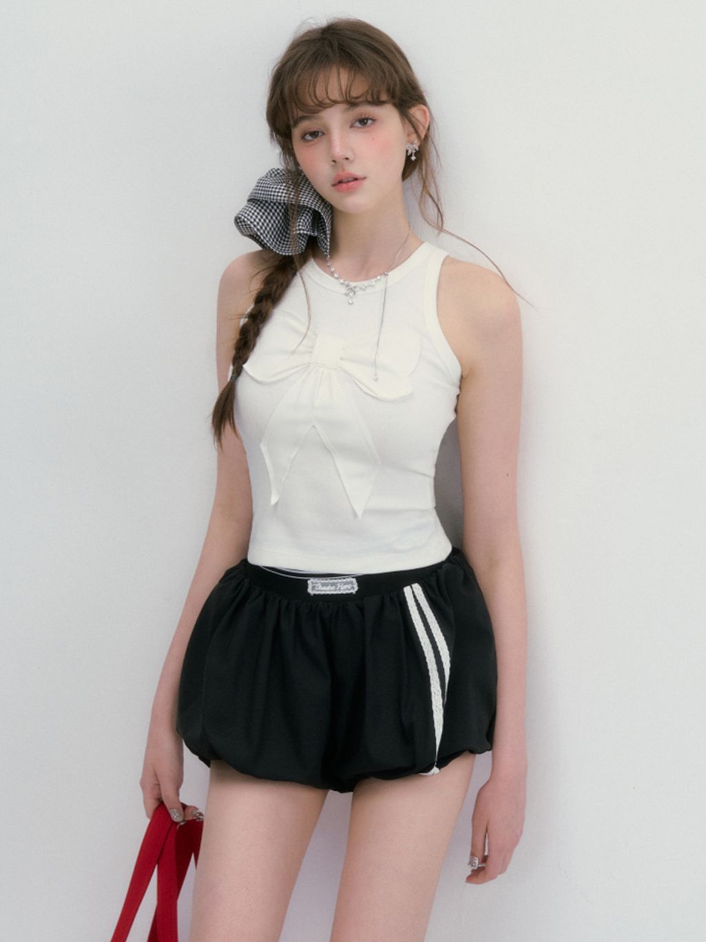 - 바스트 중앙의 입체 리본 장식으로 러블리한 무드 완성